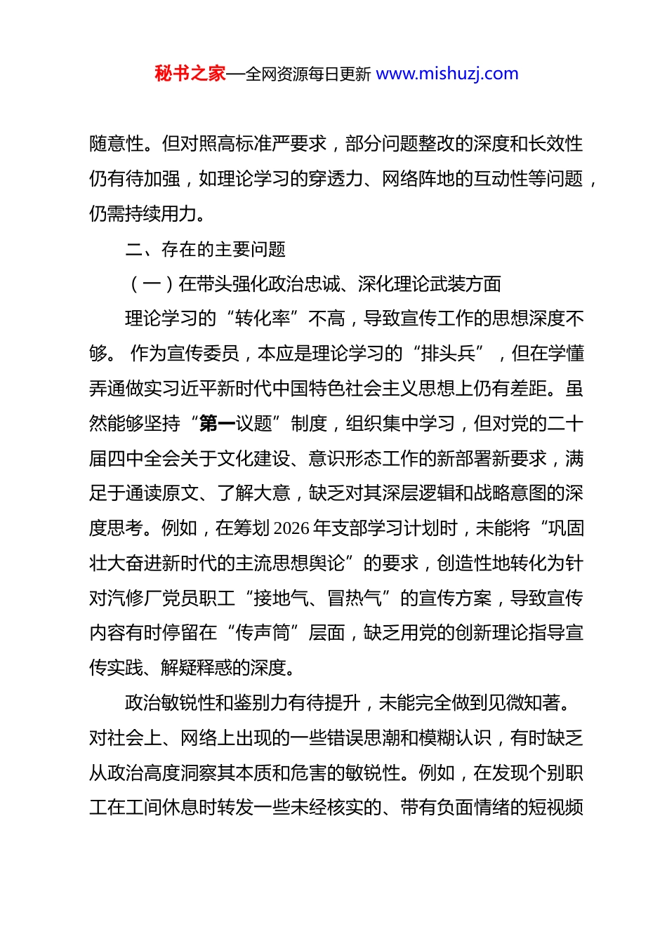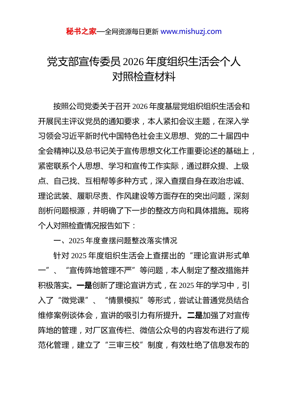 秘书之家—全网资源每日更新 www.mishuzj.com党支部宣传委员 2026 年度组织生活会个人对照检查材料 按照公司党委关于召开 2026 年度基层党组织组织生活会和开展民主评议党员的通知要求,本人紧扣会议主题,在深入学习领会习近平新时代中国特色社会主义思想、党的二十届四中全会精神以及总书记关于宣传思想文化工作重要论述的基础上,紧密联系个人思想、学习和宣传工作实际,通过群众提、上级点、自己找、互相帮等多种方式,深入查摆自身在政治忠诚、理论武装、履职尽责、作风建设等方面存在的突出问题,深刻剖析问题根源,并明确了下一步的整改方向和具体措施。现将个人对照检查情况报告如下:一、2025 年度查摆问题整改落实情况针对 2025 年度组织生活会上查摆出的“理论宣讲形式单一”、“宣传阵地管理不严”等问题,本人制定了整改措施并积极落实。一是创新了理论宣讲方式,在 2025 年的学习中,引入了“微党课”、“情景模拟”等形式,尝试让普通党员结合维修案例谈体会,宣讲的吸引力有所提升。二是加强了对宣传阵地的管理,对厂区宣传栏、微信公众号的内容发布进行了规范化管理,建立了“三审三校”制度,有效杜绝了信息发布的秘书之家—全网资源每日更新 www.mishuzj.com随意性。但对照高标准严要求,部分问题整改的深度和长效性仍有待加强,如理论学习的穿透力、网络阵地的互动性等问题,仍需持续用力。二、存在的主要问题(一)在带头强化政治忠诚、深化理论武装方面理论学习的“转化率”不高,导致宣传工作的思想深度不够。 作为宣传委员,本应是理论学习的“排头兵”,但在学懂弄通做实习近平新时代中国特色社会主义思想上仍有差距。虽然能够坚持“第一议题”制度,组织集中学习,但对党的二十届四中全会关于文化建设、意识形态工作的新部署新要求,满足于通读原文、了解大意,缺乏对其深层逻辑和战略意图的深度思考。例如,在筹划 2026 年支部学习计划时,未能将“巩固壮大奋进新时代的主流思想舆论”的要求,创造性地转化为针对汽修厂党员职工“接地气、冒热气”的宣传方案,导致宣传内容有时停留在“传声筒”层面,缺乏用党的创新理论指导宣传实践、解疑释惑的深度。政治敏锐性和鉴别力有待提升,未能完全做到见微知著。 对社会上、网络上出现的一些错误思潮和模糊认识,有时缺乏从政治高度洞察其本质和危害的敏锐性。例如,在发现个别职工在工间休息时转发一些未经核实的、带有负面情绪的短视频秘书之家—全网资源每日更新 www.mishuzj.com时,我仅仅是提醒其不要在工作场所传播,而没有敏锐地意识到这可能是一种不良情绪的发泄,没有及时组织有针对性的思想疏导和正面引导,导致小范围的不良情绪未能第一时间化解,反映出自身在维护意识形态安全方面的警惕性还不够高。(二)在带头固本培元、严守宣传纪律方面党性锤炼的常态化不足,宣传工作的政治把关意识偶有松懈。 能够参加组织生活,但在日常工作中,有时会将宣传工作视为单纯的事务性工作,忽视了其背后的政治属性。例如,在审核一篇关于“技术革新”的宣传稿时,过多地关注了技术细节和成果展示,而对其中可能隐含的“个人英雄主义”倾向、未能突出团队协作和党组织引领作用等政治导向问题把关不严,后经书记提醒才修改完善。这说明,将讲政治的要求贯穿于宣传工作全过程、各环节的意识和能力仍需加强。对宣传纪律的敬畏之心不够牢固,执行规定有时存在“差不多”心态。 虽然建立了“三审三校”制度,但在执行过程中,有时为了赶时效、图省事,存在简化程序的现象。例如,2025年国庆节前,为了快速发布一篇节日慰问信,我仅与宣传干事口头沟通后就安排发布了,没有严格履行纸质签审流程。虽然内容没有差错,但这种对纪律程序的简化,反映出内心深处对规章制度缺乏应有的敬畏,未能时刻绷紧纪律这根弦。秘书之家—全网资源每日更新 www.mishuzj.com(三)在带头担当作为、创新宣传工作方面开拓创新的锐气不足,宣传工作形式老化、内容固化。 面对新媒体时代的传播规律和职工思想观念的变化,宣传工作仍习惯于沿用老套路、老办法。“讲台上面讲、职工下面听”的灌输式教育依然占主导,利...