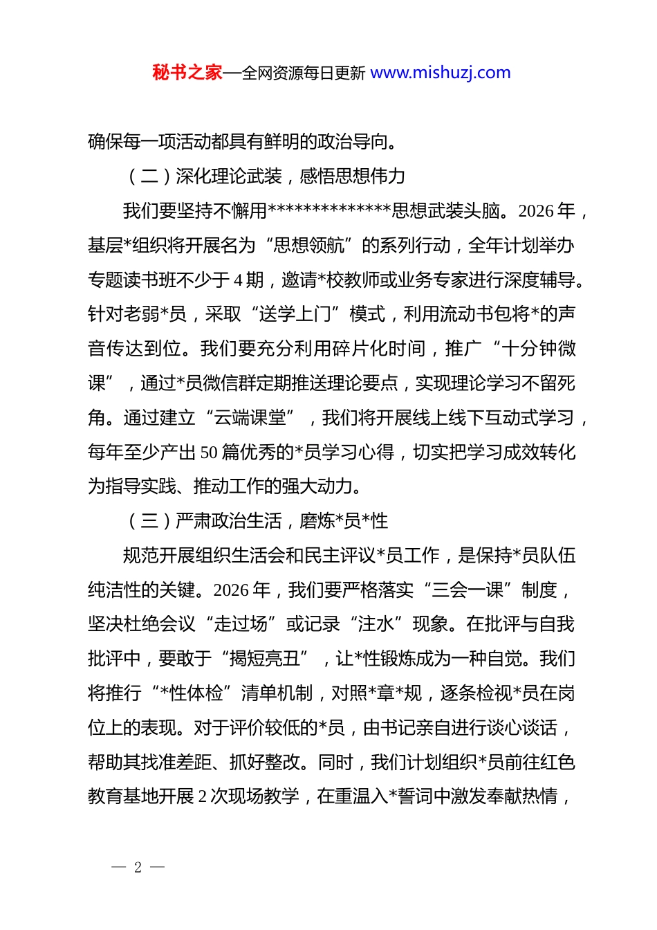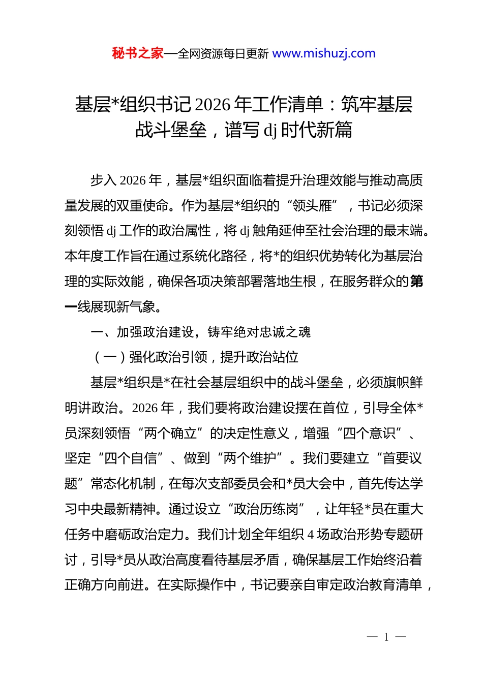 秘书之家—全网资源每日更新 www.mishuzj.com基层*组织书记 2026 年工作清单:筑牢基层战斗堡垒,谱写 dj 时代新篇步入 2026 年,基层*组织面临着提升治理效能与推动高质量发展的双重使命。作为基层*组织的“领头雁”,书记必须深刻领悟 dj 工作的政治属性,将 dj 触角延伸至社会治理的最末端。本年度工作旨在通过系统化路径,将*的组织优势转化为基层治理的实际效能,确保各项决策部署落地生根,在服务群众的第一线展现新气象。一、加强政治建设,铸牢绝对忠诚之魂(一)强化政治引领,提升政治站位基层*组织是*在社会基层组织中的战斗堡垒,必须旗帜鲜明讲政治。2026 年,我们要将政治建设摆在首位,引导全体*员深刻领悟“两个确立”的决定性意义,增强“四个意识”、坚定“四个自信”、做到“两个维护”。我们要建立“首要议题”常态化机制,在每次支部委员会和*员大会中,首先传达学习中央最新精神。通过设立“政治历练岗”,让年轻*员在重大任务中磨砺政治定力。我们计划全年组织 4 场政治形势专题研讨,引导*员从政治高度看待基层矛盾,确保基层工作始终沿着正确方向前进。在实际操作中,书记要亲自审定政治教育清单,— 1 —秘书之家—全网资源每日更新 www.mishuzj.com确保每一项活动都具有鲜明的政治导向。(二)深化理论武装,感悟思想伟力我们要坚持不懈用**************思想武装头脑。2026 年,基层*组织将开展名为“思想领航”的系列行动,全年计划举办专题读书班不少于 4 期,邀请*校教师或业务专家进行深度辅导。针对老弱*员,采取“送学上门”模式,利用流动书包将*的声音传达到位。我们要充分利用碎片化时间,推广“十分钟微课”,通过*员微信群定期推送理论要点,实现理论学习不留死角。通过建立“云端课堂”,我们将开展线上线下互动式学习,每年至少产出 50 篇优秀的*员学习心得,切实把学习成效转化为指导实践、推动工作的强大动力。(三)严肃政治生活,磨炼*员*性规范开展组织生活会和民主评议*员工作,是保持*员队伍纯洁性的关键。2026 年,我们要严格落实“三会一课”制度,坚决杜绝会议“走过场”或记录“注水”现象。在批评与自我批评中,要敢于“揭短亮丑”,让*性锻炼成为一种自觉。我们将推行“*性体检”清单机制,对照*章*规,逐条检视*员在岗位上的表现。对于评价较低的*员,由书记亲自进行谈心谈话,帮助其找准差距、抓好整改。同时,我们计划组织*员前往红色教育基地开展 2 次现场教学,在重温入*誓词中激发奉献热情,— 2 —秘书之家—全网资源每日更新 www.mishuzj.com让政治生活真正起到净化灵魂、凝聚力量的作用。二、夯实组织基础,筑强基层战斗堡垒(一)优化支部设置,规范组织运行基层组织的组织力直接决定了战斗力。2026 年,我们将根据辖区内企业、社区、产业基地的分布情况,科学调整*组织设置,确保*组织覆盖到每一个经济活跃细胞。我们要深化“标准化*支部”建设,重点完善*群服务中心的软硬件设施。针对流程不规范的问题,我们将制定一份详细的“*务工作指南”,从换届选举到*员入*流程,做到每一环节都有章可循。通过推行“*务公开栏”动态更新制度,我们将增强工作的透明度。计划在本年度内完成 2 个薄弱支部的转化提升工作,确保基层组织架构像“磁铁”一样将群众紧紧凝聚在一起。(二)抓实*员教育,壮大先锋队伍*员是*组织的肌体细胞。2026 年,我们要把好*员“入口关”,重点在生产一线、青年农民和高知识群体中发展*员。我们计划全年培养入*积极分子 30 名,实行“一对一”导师带徒模式,从思想和业务上双向引导。在*员日常教育中,我们将推行“积分制管理”,根据*员参与志愿服务、业务创新、学习强国积分等维度进行综合考量。通过设立“*员先锋岗”和“先锋示范区”,让*员在日常工作中“亮身份、亮承诺、亮实绩”。— 3 —秘书之家—全网资源每日更新 www.mishuzj.com对于长期不发挥作用、不参加组织生活的*员,我们要严格按照程序进行处置,保持*员队伍的先进性和纯洁性。(三)运用数智平台,提升管理效能数字化转型是提升 dj 工作效率的必由之路。2026 年,我们将全面推广...
