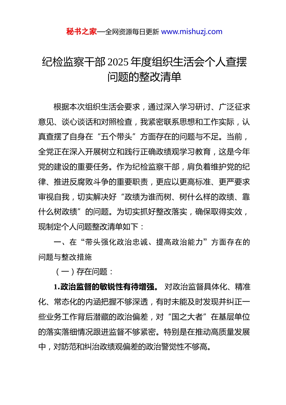 秘书之家—全网资源每日更新 www.mishuzj.com纪检监察干部 2025 年度组织生活会个人查摆问题的整改清单 根据本次组织生活会要求,通过深入学习研讨、广泛征求意见、谈心谈话和对照检查,我紧密联系思想和工作实际,认真查摆了自身在“五个带头”方面存在的问题与不足。当前,全党正在深入开展树立和践行正确政绩观学习教育,这是今年党的建设的重要任务。作为纪检监察干部,肩负着维护党的纪律、推进反腐败斗争的重要职责,更应以更高标准、更严要求审视自我,切实解决好“政绩为谁而树、树什么样的政绩、靠什么树政绩”的问题。为切实抓好整改落实,确保取得实效,现制定个人问题整改清单如下:一、在“带头强化政治忠诚、提高政治能力”方面存在的问题与整改措施(一)存在问题:1.政治监督的敏锐性有待增强。 对政治监督具体化、精准化、常态化的内涵把握不够深透,有时未能及时发现并纠正一些业务工作背后潜藏的政治偏差,对“国之大者”在基层单位的落实落细情况跟进监督不够紧密。特别是在推动高质量发展中,对防范和纠治政绩观偏差的政治警觉性不够高。秘书之家—全网资源每日更新 www.mishuzj.com2.政治领悟的深刻性尚有欠缺。 对党中央关于全面从严治党、党风廉政建设和反腐败斗争的最新部署要求,在学深悟透、融会贯通上做得不够,有时满足于传达学习,未能完全将其转化为指导监督检查、审查调查工作的具体思路和方法。对习近平总书记关于树立和践行正确政绩观的重要论述学习不够系统深入。3.政治执行的坚定性存在不足。 在查办一些复杂案件或处理棘手问题时,有时顾虑人情干扰或现实阻力,存在一定的“好人主义”思想,攻坚克难的锐气和动真碰硬的决心需进一步强化,与“以实干出政绩”的要求还有差距。(二)整改措施:1.提升政治监督精准度,把政绩观监督纳入重点。 聚焦党中央重大决策部署和上级党委工作要求,特别是将树立和践行正确政绩观情况纳入年度政治监督任务清单。每月深入一线开展 1 次专项监督或“嵌入式”监督,善于从业务问题中发现政治偏差和政绩观偏差,每季度形成一份有情况、有分析、有建议的政治监督报告,重点反映是否存在“形象工程”、“政绩工程”等问题。完成时限:2026 年 3 月底前建立任务清单,长期坚持。2.深化理论武装与业务融合,筑牢正确政绩观思想根基。 秘书之家—全网资源每日更新 www.mishuzj.com坚持每周至少安排 2 小时深度学习习近平总书记关于树立和践行正确政绩观的重要论述及最新指示批示精神- 2 。用好《习近平关于树立和践行正确政绩观论述摘编》等学习资料,结合监督检查、审查调查中的典型案例,每季度组织或参与 1 次专题研讨,探索将正确政绩观要求转化为执纪执法实践的具体路径。完成时限:长期坚持。3.锤炼敢于斗争政治品格,以实干担当践行正确政绩观。 在案件查办和日常监督中,坚决摒弃“怕得罪人”思想,严格执行党纪法规。对疑难复杂案件,主动请缨、迎难而上。在案件质量评查、问题线索排查等工作中,坚持原则、较真碰硬,每季度复盘 1 次自身在斗争中存在的不足并加以改进,以实际行动诠释“真出业绩、出真业绩”的要求。完成时限:立即执行,长期坚持。二、在“带头固本培元、增强党性”方面存在的问题与整改措施(一)存在问题:1.理想信念“压舱石”作用发挥不够。 对党的创新理论的学习有时停留在知识层面,未能完全内化为坚不可摧的信仰根基。对照习近平总书记关于“立党为公、为民造福”的要求,在强化宗旨意识、树牢以人民为中心的发展思想上还需持续用秘书之家—全网资源每日更新 www.mishuzj.com力。2.党性锤炼“熔炉”作用感受不深。 参加支部组织生活有时存在“被动”心态,批评与自我批评辣味不足,对自己“画像”不够精准,对同志的批评有时避重就轻,担心影响团结。从党性上找差距、查根源、强修养的自觉性有待提高。3.自我革命精神“磨刀石”作用有待加强。 对标先进典型查找自身差距不够主动,对自身存在的一些惯性思维、路径依赖缺乏彻底破除的勇气,自我净化、自我完善的紧迫感有所减弱。对政绩观方面存在的深层次问题反思不够深入。(二)整改措施:1.筑牢...