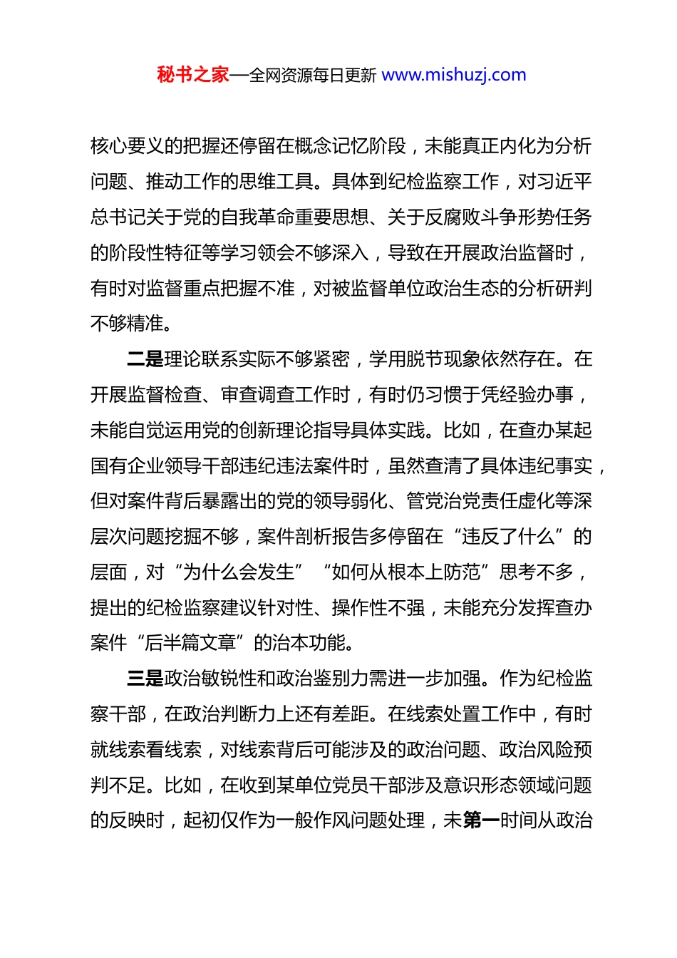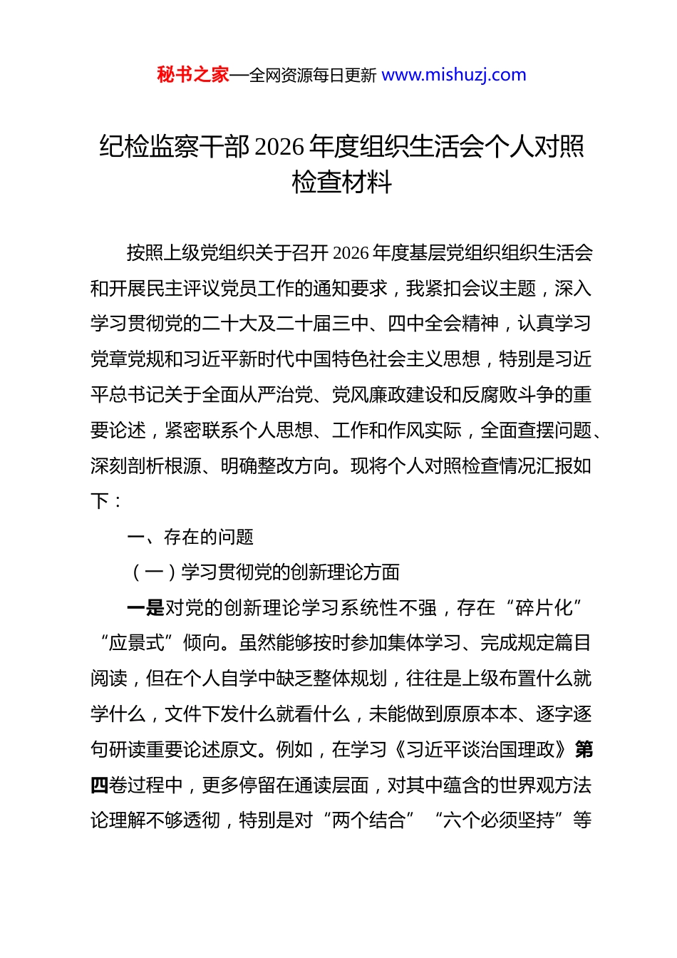 秘书之家—全网资源每日更新 www.mishuzj.com纪检监察干部 2026 年度组织生活会个人对照检查材料 按照上级党组织关于召开 2026 年度基层党组织组织生活会和开展民主评议党员工作的通知要求,我紧扣会议主题,深入学习贯彻党的二十大及二十届三中、四中全会精神,认真学习党章党规和习近平新时代中国特色社会主义思想,特别是习近平总书记关于全面从严治党、党风廉政建设和反腐败斗争的重要论述,紧密联系个人思想、工作和作风实际,全面查摆问题、深刻剖析根源、明确整改方向。现将个人对照检查情况汇报如下:一、存在的问题(一)学习贯彻党的创新理论方面一是对党的创新理论学习系统性不强,存在“碎片化”“应景式”倾向。虽然能够按时参加集体学习、完成规定篇目阅读,但在个人自学中缺乏整体规划,往往是上级布置什么就学什么,文件下发什么就看什么,未能做到原原本本、逐字逐句研读重要论述原文。例如,在学习《习近平谈治国理政》第四卷过程中,更多停留在通读层面,对其中蕴含的世界观方法论理解不够透彻,特别是对“两个结合”“六个必须坚持”等秘书之家—全网资源每日更新 www.mishuzj.com核心要义的把握还停留在概念记忆阶段,未能真正内化为分析问题、推动工作的思维工具。具体到纪检监察工作,对习近平总书记关于党的自我革命重要思想、关于反腐败斗争形势任务的阶段性特征等学习领会不够深入,导致在开展政治监督时,有时对监督重点把握不准,对被监督单位政治生态的分析研判不够精准。二是理论联系实际不够紧密,学用脱节现象依然存在。在开展监督检查、审查调查工作时,有时仍习惯于凭经验办事,未能自觉运用党的创新理论指导具体实践。比如,在查办某起国有企业领导干部违纪违法案件时,虽然查清了具体违纪事实,但对案件背后暴露出的党的领导弱化、管党治党责任虚化等深层次问题挖掘不够,案件剖析报告多停留在“违反了什么”的层面,对“为什么会发生”“如何从根本上防范”思考不多,提出的纪检监察建议针对性、操作性不强,未能充分发挥查办案件“后半篇文章”的治本功能。三是政治敏锐性和政治鉴别力需进一步加强。作为纪检监察干部,在政治判断力上还有差距。在线索处置工作中,有时就线索看线索,对线索背后可能涉及的政治问题、政治风险预判不足。比如,在收到某单位党员干部涉及意识形态领域问题的反映时,起初仅作为一般作风问题处理,未第一时间从政治秘书之家—全网资源每日更新 www.mishuzj.com高度审视问题的严重性,对可能造成的政治影响估计不足,反映出从政治上观察、分析和处置问题的能力有待提升。(二)加强党性锻炼方面一是理想信念的根基扎得不够牢固,党性修养的主动性有所减弱。随着工作年限增长,自我要求出现一定程度的松懈,有时把参加组织生活当作任务来完成,而不是作为锤炼党性的宝贵机会。例如,在支部主题党日活动中,虽然能按时到场,但主动发言、带头交流的积极性不高,多以听为主,缺乏深层次的思想碰撞,导致党性锻炼效果打了折扣。特别是作为执纪执法者,在自我革命、自我净化上标准不高,存在“手电筒只照别人不照自己”的偏差,对自身存在的苗头性、倾向性问题警惕不够。二是批评和自我批评的武器运用不够充分。在平时工作中,对自己存在的问题往往轻描淡写,对同事的问题则顾虑较多,怕影响团结、怕得罪人,存在“老好人”思想。在案件讨论、线索研判中,有时对同事提出的不够严谨的处置意见,明知有瑕疵也不好意思当面指出,担心影响工作关系。在上一次组织生活会上,虽然也进行了自我批评,但问题查摆多集中在业务层面,触及思想灵魂深处的少,整改措施也比较笼统,缺乏针对性和震慑力。秘书之家—全网资源每日更新 www.mishuzj.com三是在执行组织纪律方面存在“打擦边球”现象。虽然没有违反重大纪律的行为,但在一些细节小事上标准不高。如个别时候因办案工作繁忙,履行请假手续不够及时;在落实请示报告制度时,对一些非紧急事项存在事后补报的情况。特别是在案件查办中,有时为了赶进度,在履行部分程序性审批时存在“先干后补”的现象,虽然最终都补齐了手续,但反映出程序意识、规矩意识还不够强,与...