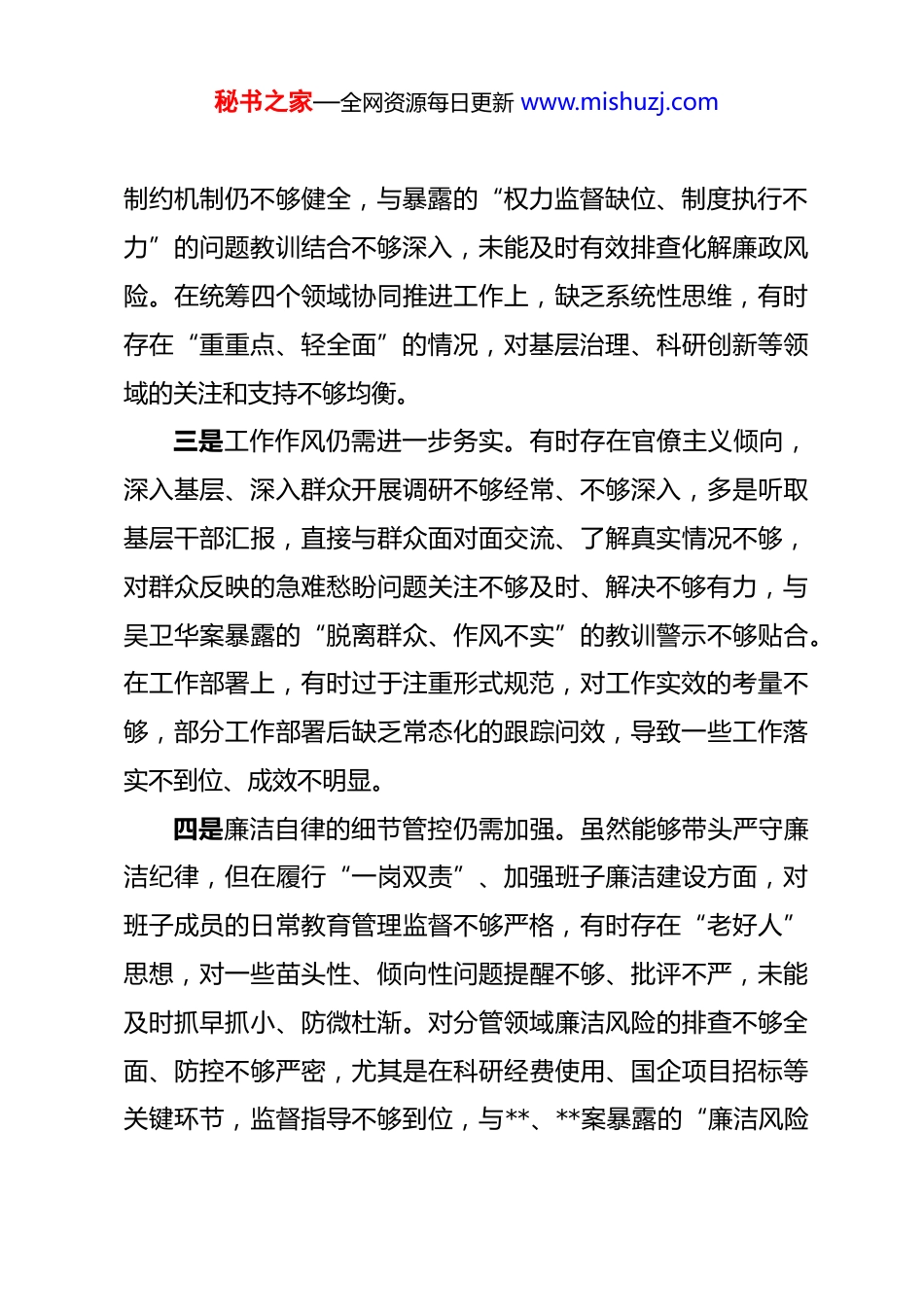 秘书之家—全网资源每日更新 www.mishuzj.com领导班子成员互相批评意见与建议 一、对班子主要负责同志的批评意见建议班子主要负责同志作为班子的“领头雁”,始终坚守政治立场、扛起主体责任,带领班子成员推动各项工作取得了阶段性成效,但对照更高标准、更严要求,结合反面典型案例暴露的突出问题,仍有一些不足,建议重点关注以下几方面:一是政治理论学习的深度和广度仍需拓展。虽然能够带头组织开展政治理论学习,但有时存在“重部署、轻落实”“重形式、轻实效”的倾向,对党的创新理论、党章党规党纪的学习多停留在集中学习、通读原文层面,深入研讨、学用结合不够紧密,对分管领域和基层党员干部的学习督促指导不到位,导致部分干部学习流于形式,运用理论指导实践、解决实际问题的能力有待提升,与反面典型忽视理论学习、理想信念崩塌的教训警示结合不够紧密,警示教育的针对性不强。二是履职担当的力度仍需加大。在统筹推进全局工作、破解重点难点问题上,有时存在求稳怕乱、畏难发愁的思想,面对复杂局面和棘手问题,敢于较真碰硬、攻坚克难的劲头有所不足。比如在规范权力运行、健全监督机制方面,虽然部署了相关工作,但对落实情况的跟踪问效不够严格,部分领域监督秘书之家—全网资源每日更新 www.mishuzj.com制约机制仍不够健全,与暴露的“权力监督缺位、制度执行不力”的问题教训结合不够深入,未能及时有效排查化解廉政风险。在统筹四个领域协同推进工作上,缺乏系统性思维,有时存在“重重点、轻全面”的情况,对基层治理、科研创新等领域的关注和支持不够均衡。三是工作作风仍需进一步务实。有时存在官僚主义倾向,深入基层、深入群众开展调研不够经常、不够深入,多是听取基层干部汇报,直接与群众面对面交流、了解真实情况不够,对群众反映的急难愁盼问题关注不够及时、解决不够有力,与吴卫华案暴露的“脱离群众、作风不实”的教训警示不够贴合。在工作部署上,有时过于注重形式规范,对工作实效的考量不够,部分工作部署后缺乏常态化的跟踪问效,导致一些工作落实不到位、成效不明显。四是廉洁自律的细节管控仍需加强。虽然能够带头严守廉洁纪律,但在履行“一岗双责”、加强班子廉洁建设方面,对班子成员的日常教育管理监督不够严格,有时存在“老好人”思想,对一些苗头性、倾向性问题提醒不够、批评不严,未能及时抓早抓小、防微杜渐。对分管领域廉洁风险的排查不够全面、防控不够严密,尤其是在科研经费使用、国企项目招标等关键环节,监督指导不够到位,与**、**案暴露的“廉洁风险秘书之家—全网资源每日更新 www.mishuzj.com防控缺位”的教训结合不够紧密。建议:一是带头深化理论学习,坚持学用结合,加强对分管领域和基层党员干部的学习督促指导,结合反面典型案例常态化开展警示教育,切实提升学习实效和干部理论素养。二是强化担当作为,统筹全局、攻坚克难,加大对重点难点问题的跟踪问效力度,健全完善权力监督制约机制,全面排查化解各领域廉政风险,推动各项工作提质增效。三是弘扬务实作风,多深入基层、深入群众开展调研,切实解决群众急难愁盼问题,杜绝形式主义、官僚主义,注重工作实效。四是严格履行“一岗双责”,加强班子廉洁建设,对班子成员从严教育、从严管理、从严监督,及时提醒纠正苗头性、倾向性问题,筑牢班子廉洁自律防线。二、对分管纪检监察、基层治理工作班子成员的批评意见建议该同志始终坚守纪律底线,认真履行纪检监察和基层治理工作职责,在正风肃纪、基层建设等方面取得了一定成效,但对照工作要求和反面典型案例教训,仍存在一些不足,具体批评意见如下:一是纪检监察工作的精准性和实效性仍需提升。在监督执纪问责工作中,有时存在思路不够开阔、方法不够灵活的问题,秘书之家—全网资源每日更新 www.mishuzj.com对一些隐蔽性强、复杂性高的违纪违法问题发现不够及时、处置不够精准,精准监督、规范执纪的水平有待进一步提高。结合**案教训,在加强纪检监察干部自身建设、防范执纪破纪方面,教育管理监督不够严格,部分纪检监察干部责任担当意识不够鲜明。在基层治理监督方面,对基层干部的监督管理不够全...