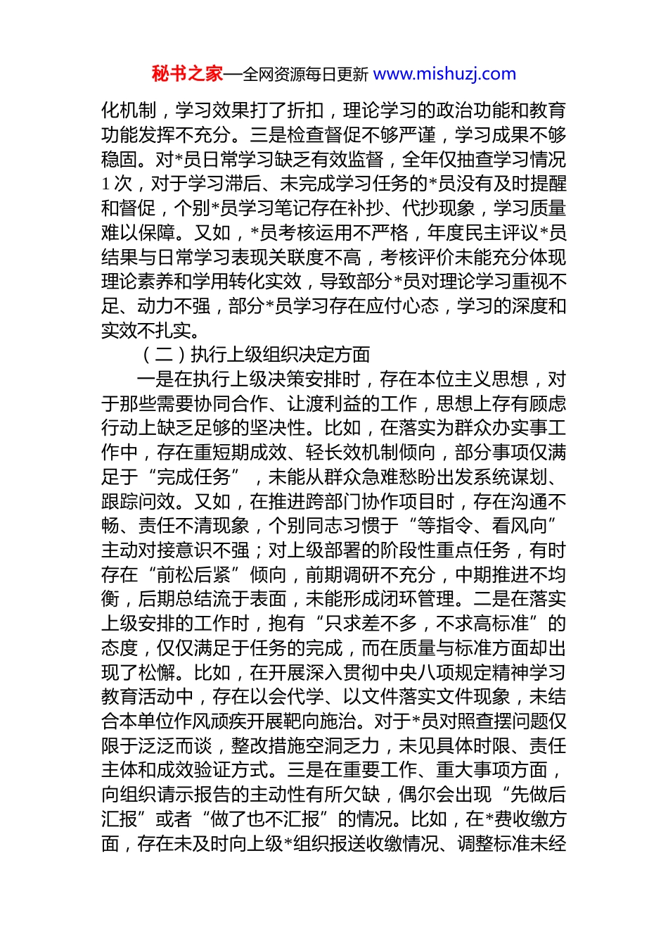 秘书之家—全网资源每日更新 www.mishuzj.com某区直部门*支部支委会 2025 年度组织生活会对照检查材料根据区直机关工委关于开好 2025 年组织生活会相关通知要求,*支部支委会紧紧围绕会议主题,深入学习贯彻******关于*的建设的重要思想、关于*的自我革命的重要思想,组织*员深入开展学习研讨,广泛征求意见建议,全覆盖开展谈心谈话,对照*章*规,对照群众期盼,对照先进典型,紧密联系支部工作和班子成员思想实际,深入查摆问题、剖析根源、明确整改方向,认真撰写*支部对照检查材料,现将对照检查情况报告如下。一、存在的问题(一)加强理论武装方面一是学思践悟不够深刻,理论转化不够完全。比如,*支部学习计划没有严格执行,有时因为业务工作繁忙,没有协调好理论学习和业务工作的关系,学习流于形式,理论学习不系统、不深刻。又如,部分*员交流研讨发言不深入,联系实际工作不紧密。在开展深入贯彻中央八项规定精神学习教育期间,个别*员交流发言仅限于理论方面,没有结合实际工作谈认识、谈体会,学用结合不紧密,运用新思想指导实践、破解难题的能力有待提升。二是学习方式缺乏新意,吸引力和凝聚力有待增强。比如,学习仍以集中领读、个人自学为主,缺乏情景式、互动式、案例式等多样化形式。*支部组织集中学习,其中采用研讨交流形式,开展实地践学,学习成效不明显,*员参与积极性不高。又如,dj 带团建作用发挥不明显,团支部组织的理论学习活动未能有效融入*支部学习体系,青年*员参与度偏低,思想引领针对性不强,未能形成*团联动、协同育人的常态秘书之家—全网资源每日更新 www.mishuzj.com化机制,学习效果打了折扣,理论学习的政治功能和教育功能发挥不充分。三是检查督促不够严谨,学习成果不够稳固。对*员日常学习缺乏有效监督,全年仅抽查学习情况1 次,对于学习滞后、未完成学习任务的*员没有及时提醒和督促,个别*员学习笔记存在补抄、代抄现象,学习质量难以保障。又如,*员考核运用不严格,年度民主评议*员结果与日常学习表现关联度不高,考核评价未能充分体现理论素养和学用转化实效,导致部分*员对理论学习重视不足、动力不强,部分*员学习存在应付心态,学习的深度和实效不扎实。(二)执行上级组织决定方面一是在执行上级决策安排时,存在本位主义思想,对于那些需要协同合作、让渡利益的工作,思想上存有顾虑行动上缺乏足够的坚决性。比如,在落实为群众办实事工作中,存在重短期成效、轻长效机制倾向,部分事项仅满足于“完成任务”,未能从群众急难愁盼出发系统谋划、跟踪问效。又如,在推进跨部门协作项目时,存在沟通不畅、责任不清现象,个别同志习惯于“等指令、看风向”主动对接意识不强;对上级部署的阶段性重点任务,有时存在“前松后紧”倾向,前期调研不充分,中期推进不均衡,后期总结流于表面,未能形成闭环管理。二是在落实上级安排的工作时,抱有“只求差不多,不求高标准”的态度,仅仅满足于任务的完成,而在质量与标准方面却出现了松懈。比如,在开展深入贯彻中央八项规定精神学习教育活动中,存在以会代学、以文件落实文件现象,未结合本单位作风顽疾开展靶向施治。对于*员对照查摆问题仅限于泛泛而谈,整改措施空洞乏力,未见具体时限、责任主体和成效验证方式。三是在重要工作、重大事项方面,向组织请示报告的主动性有所欠缺,偶尔会出现“先做后汇报”或者“做了也不汇报”的情况。比如,在*费收缴方面,存在未及时向上级*组织报送收缴情况、调整标准未经秘书之家—全网资源每日更新 www.mishuzj.com审批即执行等问题;在组织换届筹备中,个别环节如候选人酝酿、会议议程设置等未提前报备,影响整体工作节奏。(三)严格组织生活方面一是在制度执行过程中存在一定程度的弹性空间,缺乏应有的严格性和规范性,导致制度未能充分发挥其应有的约束效力。比如,三会一课”存在重形式轻实效倾向,“三会一课”、主题*日等会议记录要素不全、时间地点模糊、讨论过程简略,甚至出现补记、代签现象;主题*日活动主题不聚焦、内容同质化,与业务融合不深,*员参与率和满意度偏低。二是批评武器在锐利程度上仍有欠缺,未能...