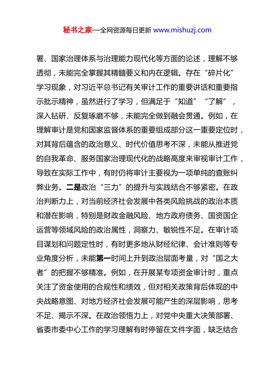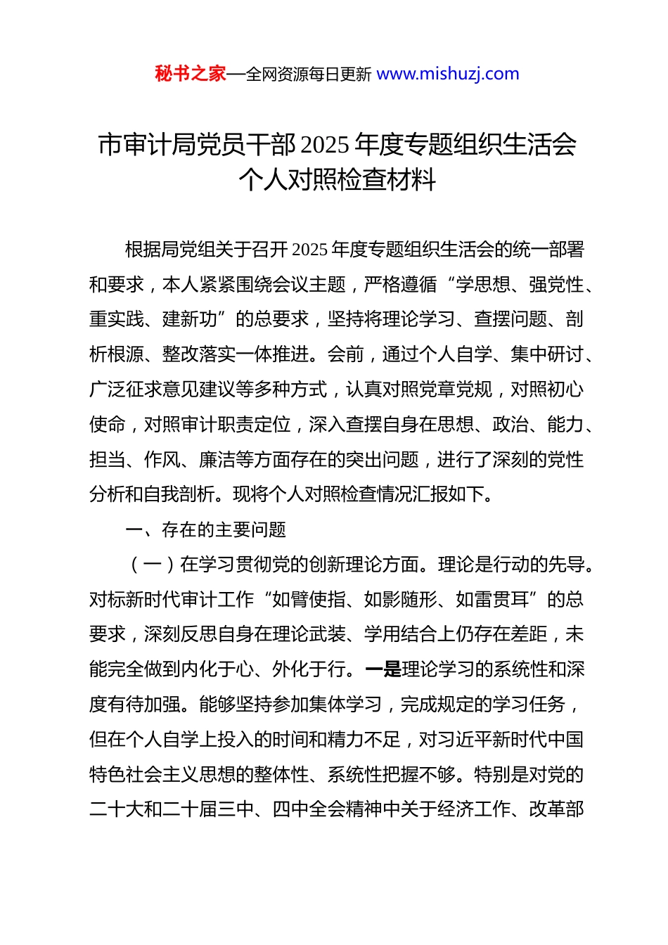 秘书之家—全网资源每日更新 www.mishuzj.com市审计局党员干部 2025 年度专题组织生活会个人对照检查材料 根据局党组关于召开 2025 年度专题组织生活会的统一部署和要求,本人紧紧围绕会议主题,严格遵循“学思想、强党性、重实践、建新功”的总要求,坚持将理论学习、查摆问题、剖析根源、整改落实一体推进。会前,通过个人自学、集中研讨、广泛征求意见建议等多种方式,认真对照党章党规,对照初心使命,对照审计职责定位,深入查摆自身在思想、政治、能力、担当、作风、廉洁等方面存在的突出问题,进行了深刻的党性分析和自我剖析。现将个人对照检查情况汇报如下。一、存在的主要问题(一)在学习贯彻党的创新理论方面。理论是行动的先导。对标新时代审计工作“如臂使指、如影随形、如雷贯耳”的总要求,深刻反思自身在理论武装、学用结合上仍存在差距,未能完全做到内化于心、外化于行。一是理论学习的系统性和深度有待加强。能够坚持参加集体学习,完成规定的学习任务,但在个人自学上投入的时间和精力不足,对习近平新时代中国特色社会主义思想的整体性、系统性把握不够。特别是对党的二十大和二十届三中、四中全会精神中关于经济工作、改革部秘书之家—全网资源每日更新 www.mishuzj.com署、国家治理体系与治理能力现代化等方面的论述,理解不够透彻,未能完全掌握其精髓要义和内在逻辑。存在“碎片化”学习现象,对习近平总书记有关审计工作的重要讲话和重要指示批示精神,虽然进行了学习,但满足于“知道”“了解”,深入钻研、反复琢磨不够,未能完全做到融会贯通。例如,在理解审计是党和国家监督体系的重要组成部分这一重要定位时,对其背后蕴含的政治意义、时代价值思考不深,未能从推进党的自我革命、服务国家治理现代化的战略高度来审视审计工作,导致在实际工作中,有时仍将审计主要视为一项单纯的查账纠弊业务。二是政治“三力”的提升与实践结合不够紧密。在政治判断力上,对当前经济社会发展中各类风险挑战的政治本质和潜在影响,特别是财政金融风险、地方政府债务、国资国企运营等领域风险的政治属性,洞察力、敏锐性不足。在审计项目谋划和问题定性时,有时更多地从财经纪律、会计准则等专业角度分析,未能第一时间上升到政治层面考量,对“国之大者”的把握不够精准。例如,在开展某专项资金审计时,重点关注了资金使用的合规性和绩效,但对相关政策背后体现的中央战略意图、对地方经济社会发展可能产生的深层影响,思考不足、揭示不深。在政治领悟力上,对党中央重大决策部署、省委市委中心工作的学习理解有时停留在文件字面,缺乏结合秘书之家—全网资源每日更新 www.mishuzj.com我市发展实际和审计监督职责的深度消化和创造性转化。在落实“稳中求进、以进促稳、先立后破”等宏观政策要求时,思考如何通过审计监督精准发力、有效服务方面,思路不够开阔,措施不够具体。在政治执行力上,有时存在一定的“路径依赖”,对上级部署的审计任务,习惯于按部就班、参照以往,缺乏结合新形势新要求进行再审视、再优化,审计监督的前瞻性和穿透力有待提升。三是学用转化、指导实践的能力有欠缺。存在一定的“学用脱节”现象,将党的创新理论成果转化为指导审计实践、破解审计难题的具体思路和有效办法不多。在运用新发展理念指导审计工作创新方面,思考不深,举措不多。例如,面对审计全覆盖要求与审计资源有限的现实矛盾,对如何运用大数据审计、研究型审计等新理念新方法提升审计质效,虽然有认识,但主动研究、积极探索的劲头不足,导致大数据审计技术的应用仍处于探索阶段,未能充分发挥其“尖兵利器”作用。在将理论学习成果融入审计项目、提升审计报告政治高度和专业深度方面,结合点找得不准,理论分析与审计实践“两张皮”的问题依然存在。(二)在加强党性锤炼方面。党性是党员干部的立身之本。对照党章党规和先进典型,感到自身在党性修养的主动性、自觉性、严格性上仍需持续用力,自我革命精神有所弱化。一是秘书之家—全网资源每日更新 www.mishuzj.com党性锤炼的主动性、自觉性有待提升。有时将党性修养等同于完成“规定动作”,如参加组织...