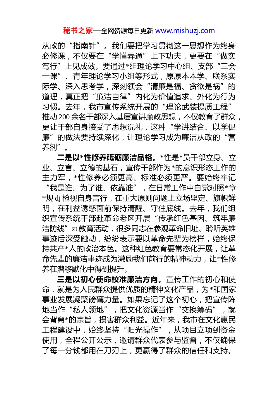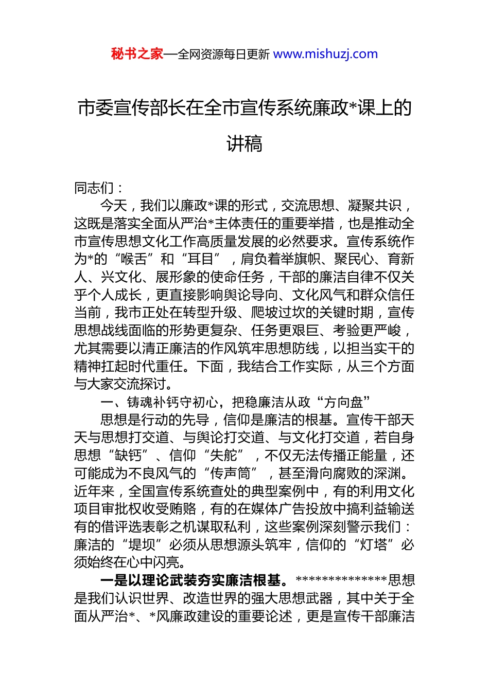 秘书之家—全网资源每日更新 www.mishuzj.com市委宣传部长在全市宣传系统廉政*课上的讲稿同志们:今天,我们以廉政*课的形式,交流思想、凝聚共识,这既是落实全面从严治*主体责任的重要举措,也是推动全市宣传思想文化工作高质量发展的必然要求。宣传系统作为*的“喉舌”和“耳目”,肩负着举旗帜、聚民心、育新人、兴文化、展形象的使命任务,干部的廉洁自律不仅关乎个人成长,更直接影响舆论导向、文化风气和群众信任当前,我市正处在转型升级、爬坡过坎的关键时期,宣传思想战线面临的形势更复杂、任务更艰巨、考验更严峻,尤其需要以清正廉洁的作风筑牢思想防线,以担当实干的精神扛起时代重任。下面,我结合工作实际,从三个方面与大家交流探讨。一、铸魂补钙守初心,把稳廉洁从政“方向盘”思想是行动的先导,信仰是廉洁的根基。宣传干部天天与思想打交道、与舆论打交道、与文化打交道,若自身思想“缺钙”、信仰“失舵”,不仅无法传播正能量,还可能成为不良风气的“传声筒”,甚至滑向腐败的深渊。近年来,全国宣传系统查处的典型案例中,有的利用文化项目审批权收受贿赂,有的在媒体广告投放中搞利益输送有的借评选表彰之机谋取私利,这些案例深刻警示我们:廉洁的“堤坝”必须从思想源头筑牢,信仰的“灯塔”必须始终在心中闪亮。一是以理论武装夯实廉洁根基。**************思想是我们认识世界、改造世界的强大思想武器,其中关于全面从严治*、*风廉政建设的重要论述,更是宣传干部廉洁秘书之家—全网资源每日更新 www.mishuzj.com从政的“指南针”。我们要把学习贯彻这一思想作为终身必修课,不仅要在“学懂弄通”上下功夫,更要在“做实笃行”上见成效。要通过*组理论学习中心组、支部“三会一课”、青年理论学习小组等形式,原原本本学、联系实际学、深入思考学,深刻领会“清廉是福、贪欲是祸”的道理,真正把“廉洁自律”内化为价值追求、外化为行为习惯。去年,我市宣传系统开展的“理论武装提质工程”推动 200 余名干部深入基层宣讲廉政思想,不仅教育了群众,更让干部自身接受了思想洗礼,这种“学讲结合、以学促廉”的做法要持续深化,让理论学习成为廉洁从政的“营养剂”。二是以*性修养砥砺廉洁品格。*性是*员干部立身、立业、立言、立德的基石,宣传干部作为*的意识形态工作的主力军,*性修养必须更高、标准必须更严。要始终牢记“我是谁、为了谁、依靠谁”,在日常工作中自觉对照*章*规 dj 检视自身言行,在重大原则问题上立场坚定、旗帜鲜明,在利益诱惑面前保持清醒、守住底线。去年,我们组织宣传系统干部赴革命老区开展“传承红色基因、筑牢廉洁防线”zt 教育活动,很多同志在参观革命旧址、聆听英雄事迹后深受触动,纷纷表示要以革命先辈为榜样,始终保持共产*人的政治本色。这种红色教育要常态化开展,让革命先辈的廉洁事迹成为激励我们前行的精神动力,让*性修养在潜移默化中得到提升。三是以初心使命校准廉洁方向。宣传工作的初心和使命,就是为人民群众提供优质的精神文化产品,为*和国家事业发展凝聚磅礴力量。如果忘记了这个初心,把宣传阵地当作“私人领地”,把文化资源当作“交换筹码”,就会背离*的宗旨,损害群众利益。近年来,我市在文化惠民工程建设中,始终坚持“阳光操作”,从项目立项到资金使用,全程公开公示,邀请群众代表参与监督,不仅确保了每一分钱都用在刀刃上,更赢得了群众的信任和支持。秘书之家—全网资源每日更新 www.mishuzj.com这启示我们:宣传干部的廉洁,最终要体现在为人民服务的实践中。要始终把群众满意作为检验工作的根本标准,在新闻宣传中传递民声、在文化建设中满足民需、在舆论引导中凝聚民心,让廉洁从政的过程成为服务群众、造福群众的过程。二、严守规矩知敬畏,筑牢廉洁用权“防火墙”宣传系统虽然不是权力高度集中的领域,但掌握着舆论引导权、文化审批权、项目管理权等重要资源,这些“权力”看似不直接涉及“钱权交易”,实则隐藏着廉政风险。比如,新闻报道的“话语权”可能被人情关系干扰文化项目的“审批权”可能成为利益输送的工具,广告投放的“决策权”可能存在暗箱操作空间。如果...