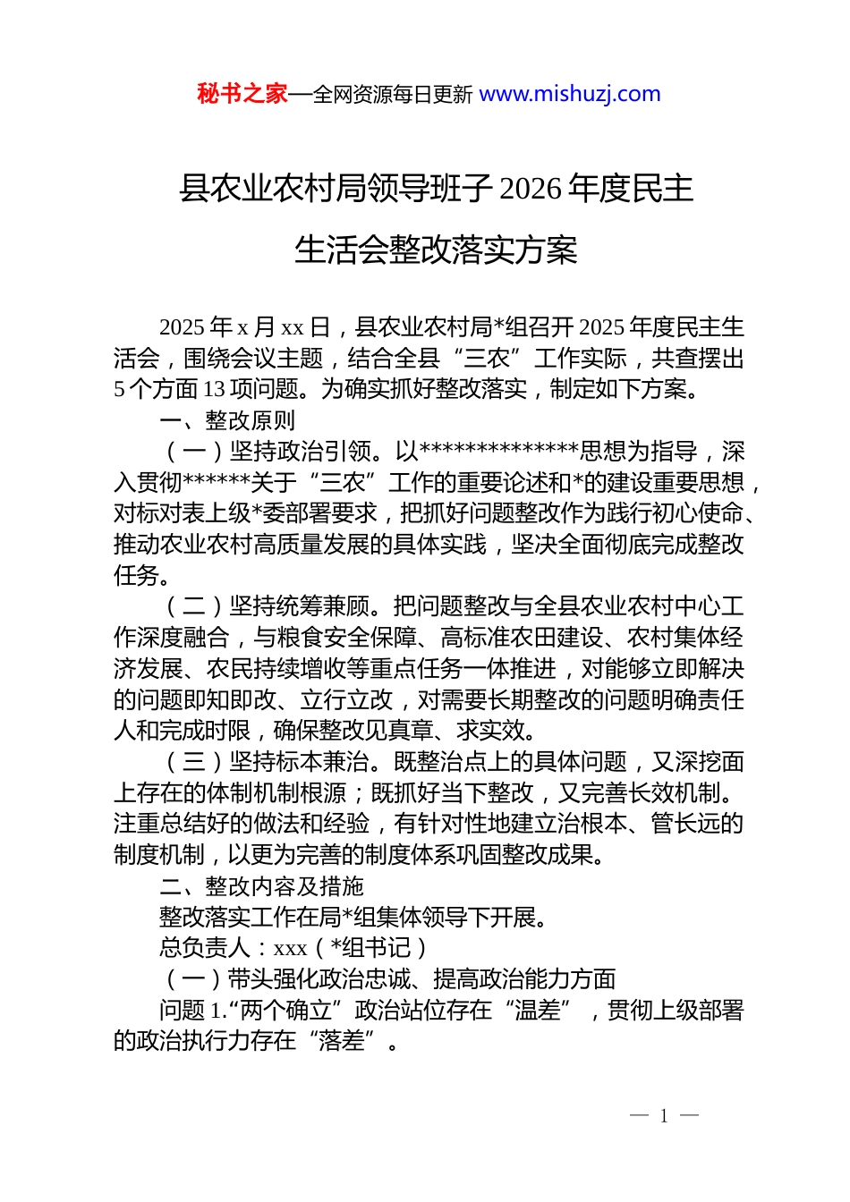 秘书之家—全网资源每日更新 www.mishuzj.com县农业农村局领导班子 2026 年度民主生活会整改落实方案2025 年 x 月 xx 日,县农业农村局*组召开 2025 年度民主生活会,围绕会议主题,结合全县“三农”工作实际,共查摆出5 个方面 13 项问题。为确实抓好整改落实,制定如下方案。一、整改原则(一)坚持政治引领。以**************思想为指导,深入贯彻******关于“三农”工作的重要论述和*的建设重要思想,对标对表上级*委部署要求,把抓好问题整改作为践行初心使命、推动农业农村高质量发展的具体实践,坚决全面彻底完成整改任务。(二)坚持统筹兼顾。把问题整改与全县农业农村中心工作深度融合,与粮食安全保障、高标准农田建设、农村集体经济发展、农民持续增收等重点任务一体推进,对能够立即解决的问题即知即改、立行立改,对需要长期整改的问题明确责任人和完成时限,确保整改见真章、求实效。(三)坚持标本兼治。既整治点上的具体问题,又深挖面上存在的体制机制根源;既抓好当下整改,又完善长效机制。注重总结好的做法和经验,有针对性地建立治根本、管长远的制度机制,以更为完善的制度体系巩固整改成果。二、整改内容及措施整改落实工作在局*组集体领导下开展。总负责人:xxx(*组书记)(一)带头强化政治忠诚、提高政治能力方面问题 1.“两个确立”政治站位存在“温差”,贯彻上级部署的政治执行力存在“落差”。— 1 —秘书之家—全网资源每日更新 www.mishuzj.com班子成员能够从理论层面深刻领悟“两个确立”的决定性意义,但在将其转化为推动全县“三农”工作高质量发展具体行动时,思想和行动上有时出现滞后。在执行上级*委工作要求时,有时存在“唯任务论”的倾向,对决策背后战略意图理解不深,导致工作执行出现机械化、简单化的问题。整改措施:一是深化“两个确立”与“三农”工作的贯通学习。将******关于“三农”工作的重要论述纳入*组中心组每月学习固定议题,重点研读其中的政治立场、战略思维和工作方法,结合粮食安全、耕地保护、农民增收等重点任务逐项对照,每季度由*组书记主持开展一次专题研讨,聚焦一个重大“三农”问题形成集体研判意见并转化为工作举措。二是建立战略意图研判机制,提升政治执行力。在承接上级部署任务时,*组会议须先行研讨政策背景和战略意图,明确“为什么做、做什么、怎么做”,再安排部署推进,防止机械执行、就事论事。对重大“三农”任务,由*组领题、班子成员分工研究,形成结合本县实际的落实方案,报县委审定后实施。三是建立政治能力定期评估机制。将班子成员政治理论学习质量和理论联系实际能力纳入年度述职评价维度,*组书记每半年与班子成员开展一次谈心谈话,重点了解政治站位上存在的薄弱环节。责任领导:xxx(*组书记)、xxx(*组副书记)牵头单位:局*组办公室责任单位:局机关各股室、局属各单位完成时限:即知即改并长期坚持(二)带头固本培元、增强*性方面问题 2.理论武装“知行合一”的转化效率有待提升。班子坚持将学习**************思想作为首要政治任务,但在系统把握其世界观、方法论并用以指导“三农”实践上,融合不够自然、转化不够彻底,学习停留在读文件、传精神层— 2 —秘书之家—全网资源每日更新 www.mishuzj.com面,运用理论破解实际难题的能力有所欠缺。问题 3.*性修养融入日常、抓在经常的自觉性不足。班子成员参加组织生活时,有时将其视为工作任务,主动运用批评和自我批评武器净化思想、提升境界的锐度和深度不够。在深入田间地头、农业经营主体调研时,关注生产技术、经营困难多,从*性角度检视群众观点、宗旨意识的时候少。问题 4.理想信念的实践砥砺作用发挥不充分。班子成员总体理想信念坚定,但将其转化为攻坚克难的持久动力和昂扬斗志方面存在波动,面对耕地“非粮化”整治、集体经济“破零消薄”等长期性、艰难性任务时,斗志衰减现象时有显现。整改措施:一是推动**************思想贯通学习。建立“学—研—用”一体推进机制:每月专题学习聚焦粮食安全观、农民主体观等核心命题;每季度开展理论联系实际的专项调研,带着理论去看问题、想对策;...