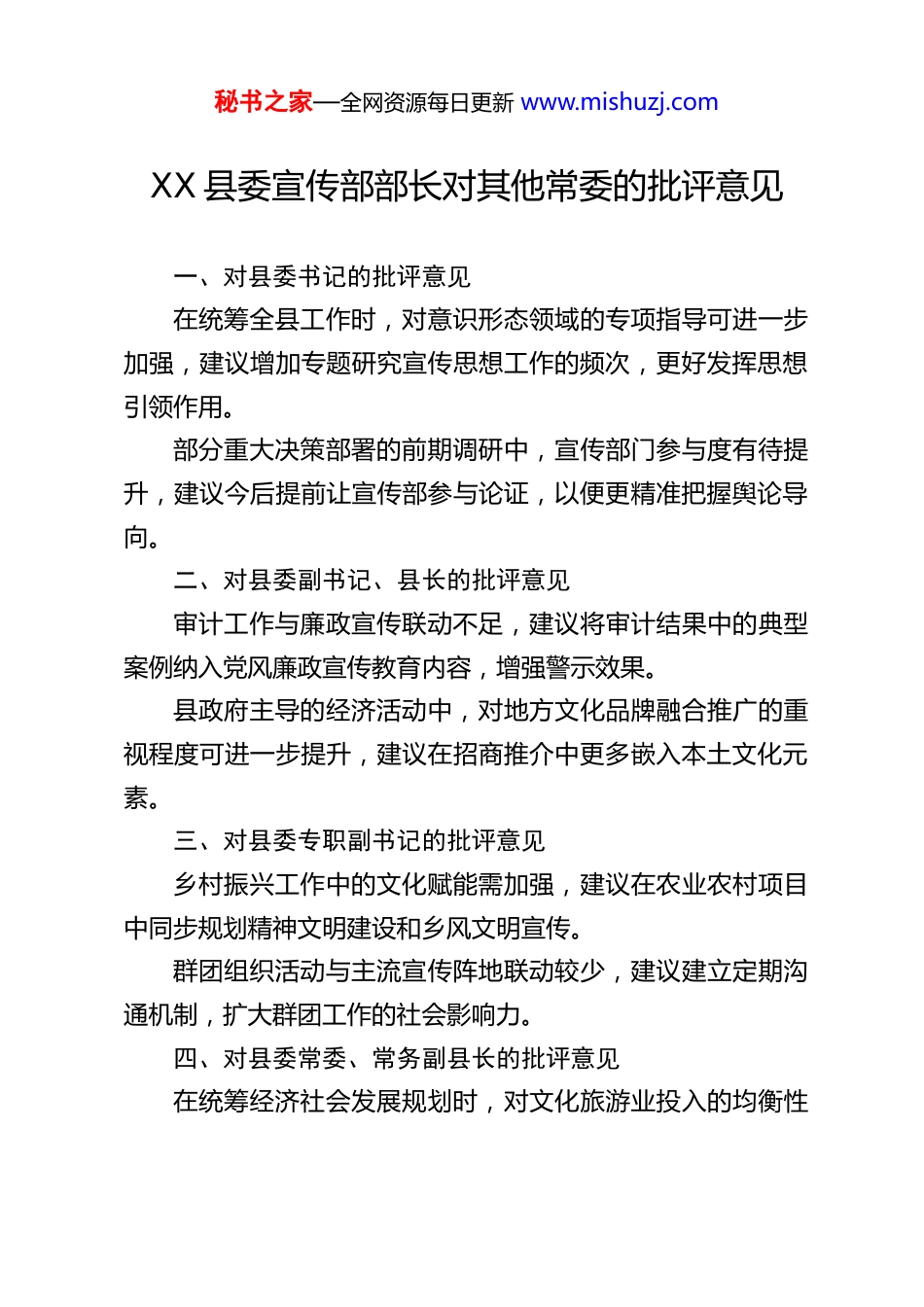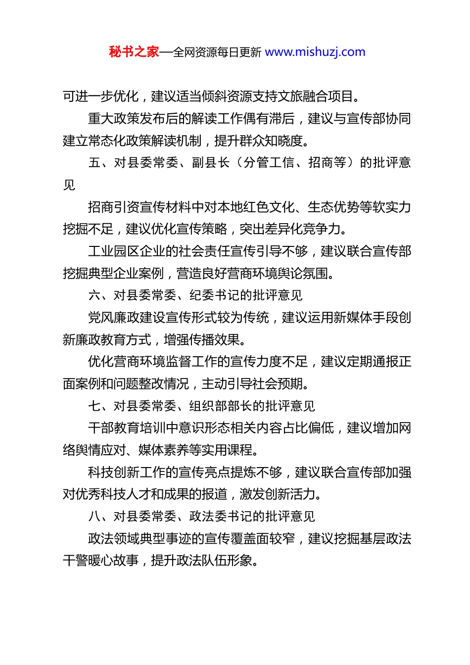 秘书之家—全网资源每日更新 www.mishuzj.comXX 县委宣传部部长对其他常委的批评意见一、对县委书记的批评意见在统筹全县工作时,对意识形态领域的专项指导可进一步加强,建议增加专题研究宣传思想工作的频次,更好发挥思想引领作用。部分重大决策部署的前期调研中,宣传部门参与度有待提升,建议今后提前让宣传部参与论证,以便更精准把握舆论导向。二、对县委副书记、县长的批评意见审计工作与廉政宣传联动不足,建议将审计结果中的典型案例纳入党风廉政宣传教育内容,增强警示效果。县政府主导的经济活动中,对地方文化品牌融合推广的重视程度可进一步提升,建议在招商推介中更多嵌入本土文化元素。三、对县委专职副书记的批评意见乡村振兴工作中的文化赋能需加强,建议在农业农村项目中同步规划精神文明建设和乡风文明宣传。群团组织活动与主流宣传阵地联动较少,建议建立定期沟通机制,扩大群团工作的社会影响力。四、对县委常委、常务副县长的批评意见在统筹经济社会发展规划时,对文化旅游业投入的均衡性秘书之家—全网资源每日更新 www.mishuzj.com可进一步优化,建议适当倾斜资源支持文旅融合项目。重大政策发布后的解读工作偶有滞后,建议与宣传部协同建立常态化政策解读机制,提升群众知晓度。五、对县委常委、副县长(分管工信、招商等)的批评意见招商引资宣传材料中对本地红色文化、生态优势等软实力挖掘不足,建议优化宣传策略,突出差异化竞争力。工业园区企业的社会责任宣传引导不够,建议联合宣传部挖掘典型企业案例,营造良好营商环境舆论氛围。六、对县委常委、纪委书记的批评意见党风廉政建设宣传形式较为传统,建议运用新媒体手段创新廉政教育方式,增强传播效果。优化营商环境监督工作的宣传力度不足,建议定期通报正面案例和问题整改情况,主动引导社会预期。七、对县委常委、组织部部长的批评意见干部教育培训中意识形态相关内容占比偏低,建议增加网络舆情应对、媒体素养等实用课程。科技创新工作的宣传亮点提炼不够,建议联合宣传部加强对优秀科技人才和成果的报道,激发创新活力。八、对县委常委、政法委书记的批评意见政法领域典型事迹的宣传覆盖面较窄,建议挖掘基层政法干警暖心故事,提升政法队伍形象。秘书之家—全网资源每日更新 www.mishuzj.com信访维稳工作的正面引导可加强,建议通过案例释法等方式化解负面舆情,弘扬法治精神。九、对县委常委、人武部政委的批评意见国防教育宣传形式较为单一,建议结合全民国防教育日等节点,开展军民融合主题宣传活动。民兵队伍建设中的先进典型宣传不足,建议联合宣传部推广“最美民兵”等榜样,增强社会认同感。十、对县委常委、统战部部长的批评意见非公经济人士的思想引领工作可更贴近实际,建议通过个性化访谈等方式精准传递政策导向。民族宗教领域的文化传播活动创新不足,建议结合传统节日策划融合宣传项目,促进文化认同。十一、对县委常委、县委办公室主任的批评意见县委重大会议活动的宣传策划前瞻性有待加强,建议提前制定多维度宣传方案,提升传播效能。办公室牵头协调工作时,各部门信息共享效率可进一步提升,建议建立宣传需求快速反馈机制。