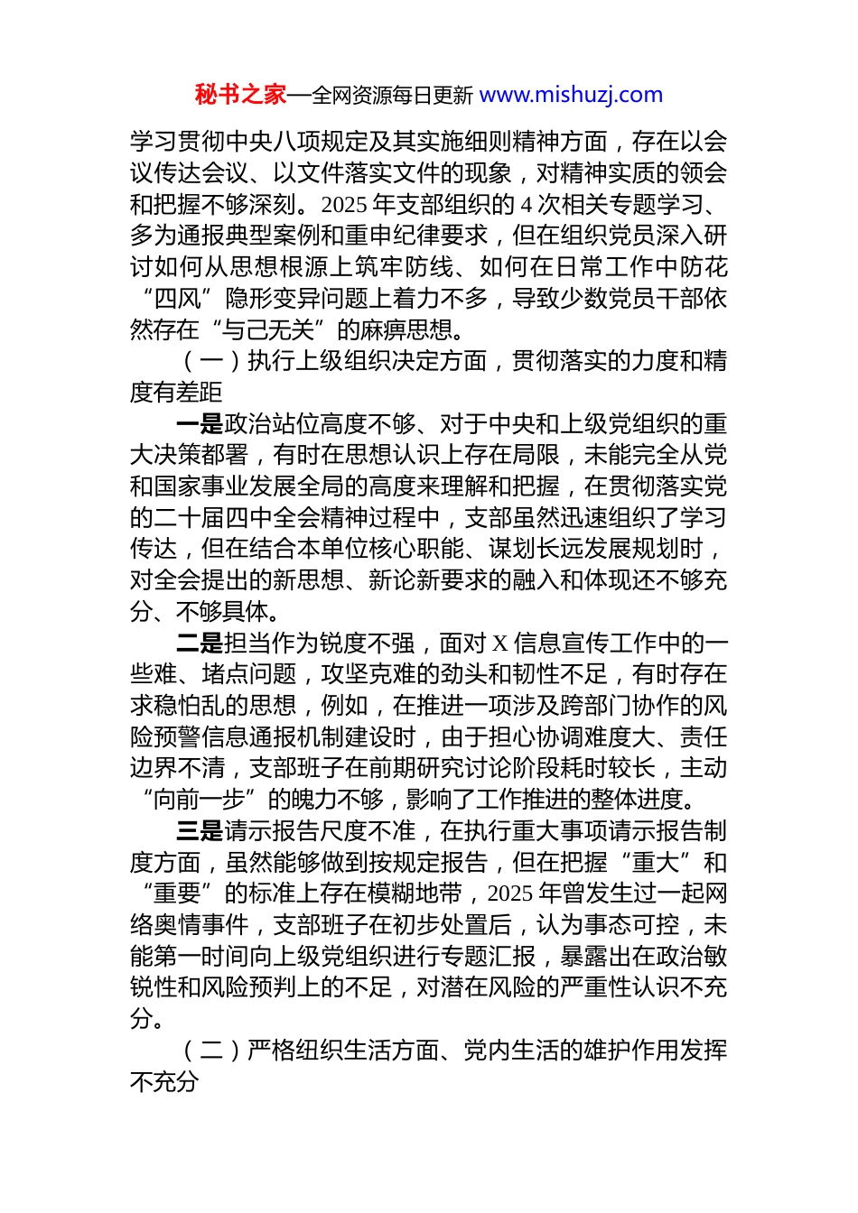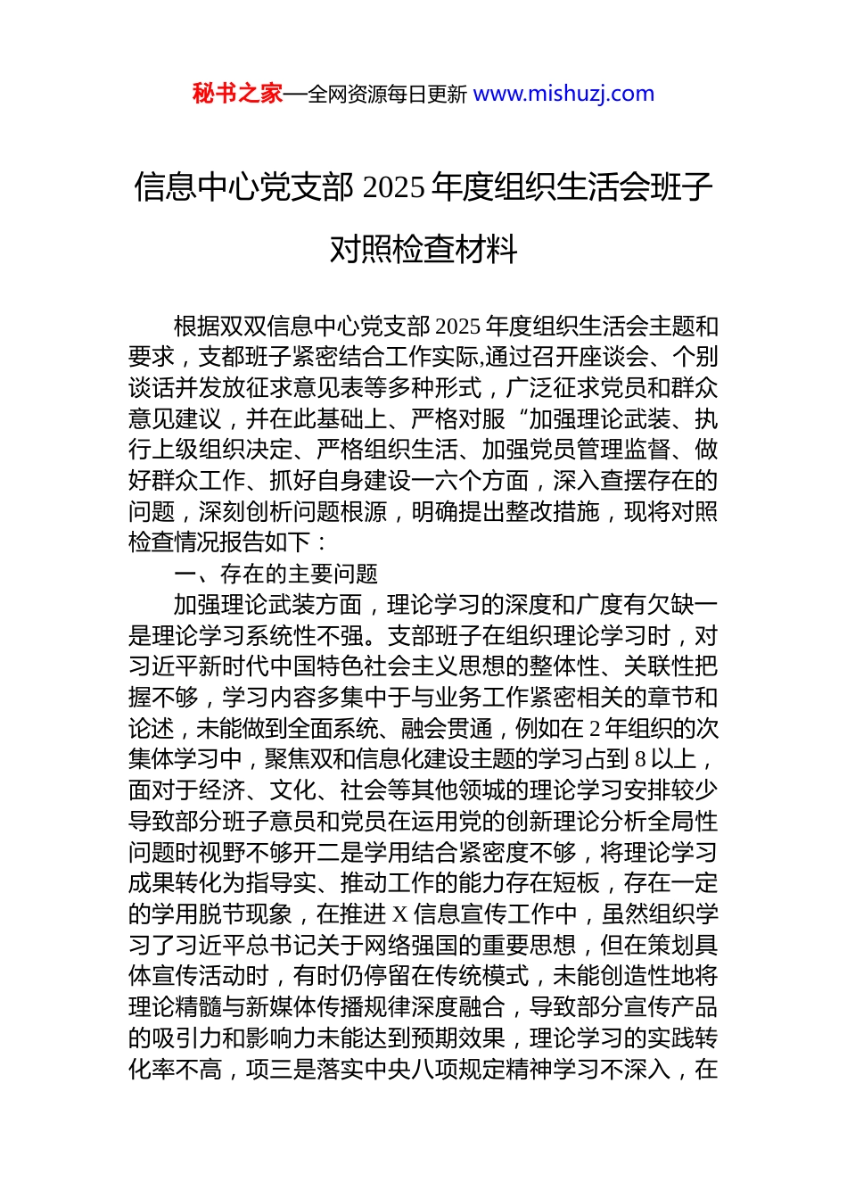 秘书之家—全网资源每日更新 www.mishuzj.com信息中心党支部 2025 年度组织生活会班子对照检查材料根据双双信息中心党支部 2025 年度组织生活会主题和要求,支都班子紧密结合工作实际,通过召开座谈会、个别谈话并发放征求意见表等多种形式,广泛征求党员和群众意见建议,并在此基础上、严格对服“加强理论武装、执行上级组织决定、严格组织生活、加强党员管理监督、做好群众工作、抓好自身建设一六个方面,深入查摆存在的问题,深刻创析问题根源,明确提出整改措施,现将对照检查情况报告如下:一、存在的主要问题加强理论武装方面,理论学习的深度和广度有欠缺一是理论学习系统性不强。支部班子在组织理论学习时,对习近平新时代中国特色社会主义思想的整体性、关联性把握不够,学习内容多集中于与业务工作紧密相关的章节和论述,未能做到全面系统、融会贯通,例如在 2 年组织的次集体学习中,聚焦双和信息化建设主题的学习占到 8 以上,面对于经济、文化、社会等其他领城的理论学习安排较少导致部分班子意员和党员在运用党的创新理论分析全局性问题时视野不够开二是学用结合紧密度不够,将理论学习成果转化为指导实、推动工作的能力存在短板,存在一定的学用脱节现象,在推进 X 信息宣传工作中,虽然组织学习了习近平总书记关于网络强国的重要思想,但在策划具体宣传活动时,有时仍停留在传统模式,未能创造性地将理论精髓与新媒体传播规律深度融合,导致部分宣传产品的吸引力和影响力未能达到预期效果,理论学习的实践转化率不高,项三是落实中央八项规定精神学习不深入,在秘书之家—全网资源每日更新 www.mishuzj.com学习贯彻中央八项规定及其实施细则精神方面,存在以会议传达会议、以文件落实文件的现象,对精神实质的领会和把握不够深刻。2025 年支部组织的 4 次相关专题学习、多为通报典型案例和重申纪律要求,但在组织党员深入研讨如何从思想根源上筑牢防线、如何在日常工作中防花“四风”隐形变异问题上着力不多,导致少数党员干部依然存在“与己无关”的麻痹思想。(一)执行上级组织决定方面,贯彻落实的力度和精度有差距一是政治站位高度不够、对于中央和上级党组织的重大决策都署,有时在思想认识上存在局限,未能完全从党和国家事业发展全局的高度来理解和把握,在贯彻落实党的二十届四中全会精神过程中,支部虽然迅速组织了学习传达,但在结合本单位核心职能、谋划长远发展规划时,对全会提出的新思想、新论新要求的融入和体现还不够充分、不够具体。二是担当作为锐度不强,面对 X 信息宣传工作中的一些难、堵点问题,攻坚克难的劲头和韧性不足,有时存在求稳怕乱的思想,例如,在推进一项涉及跨部门协作的风险预警信息通报机制建设时,由于担心协调难度大、责任边界不清,支部班子在前期研究讨论阶段耗时较长,主动“向前一步”的魄力不够,影响了工作推进的整体进度。三是请示报告尺度不准,在执行重大事项请示报告制度方面,虽然能够做到按规定报告,但在把握“重大”和“重要”的标准上存在模糊地带,2025 年曾发生过一起网络奥情事件,支部班子在初步处置后,认为事态可控,未能第一时间向上级党组织进行专题汇报,暴露出在政治敏锐性和风险预判上的不足,对潜在风险的严重性认识不充分。(二)严格纽织生活方面、党内生活的雄护作用发挥不充分秘书之家—全网资源每日更新 www.mishuzj.com一是组织生活创新性不足。在落实“三会一课”、主题党日等制度时,形式和我体较为单一,对党员的吸引力不强。2025 年开展的 12 次主题党日活动中,仍以会议室集中学习、观看教盲片等传统形式为主,占比超过 70 未能充分利用驻地红色资源和网络平合开展沉浸式、互动式教育导致组织生活对年轻党员的感染力和凝聚力有所减弱。二是批评和自我批评辣味不够、在组织生活会上,虽然能够开展批评和自我批评,但有时存在“好人主义”思想,批评意见点到为止,辣味不足,未能真正达到“红脸出汗、排毒治病”的,在上次组织生活会中,班子成员之间提出的批评意见多集中在工作方法层面,对于思想深处党性修养方面的问题触及不深,自我批评也存在避重就轻蜻...