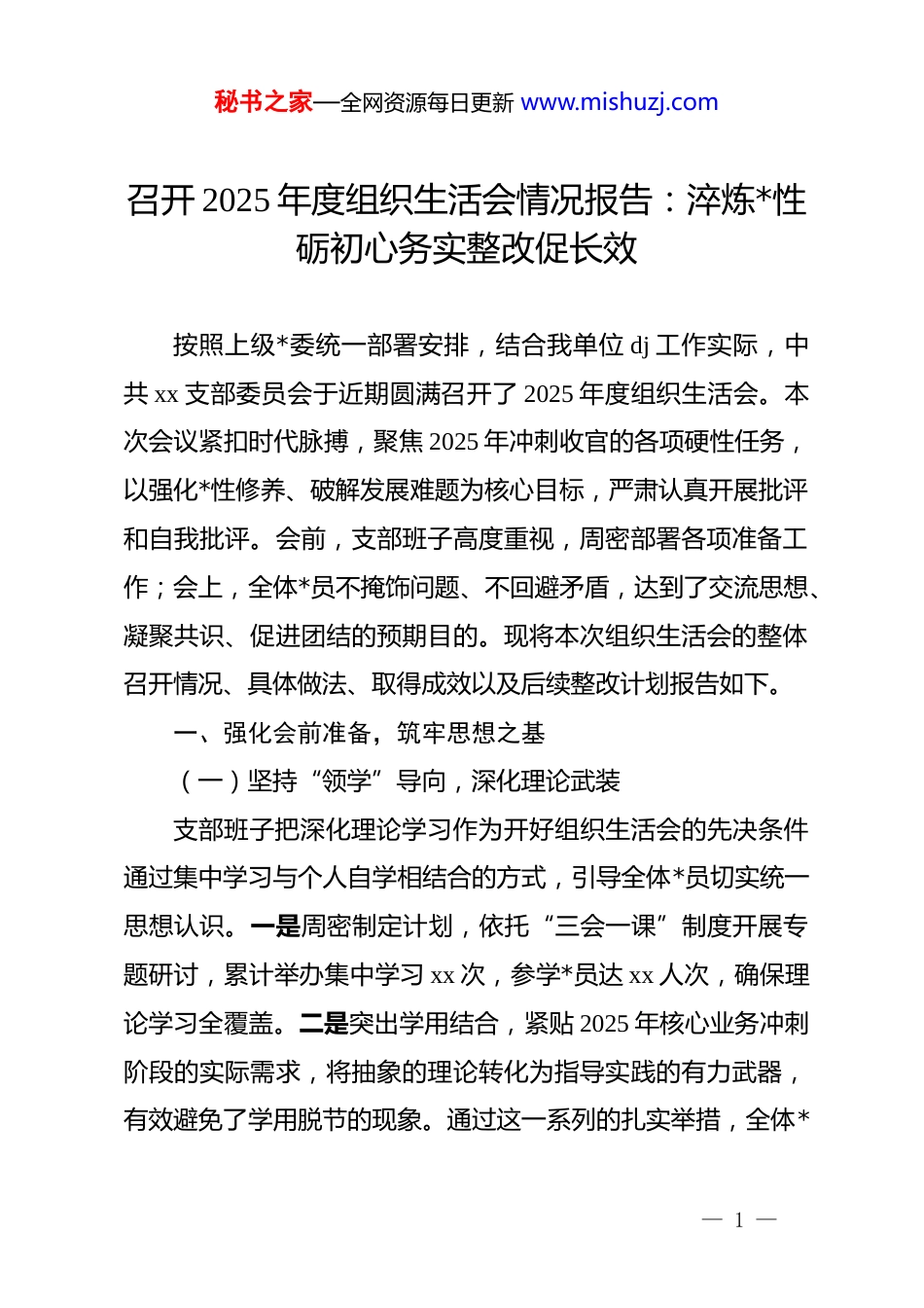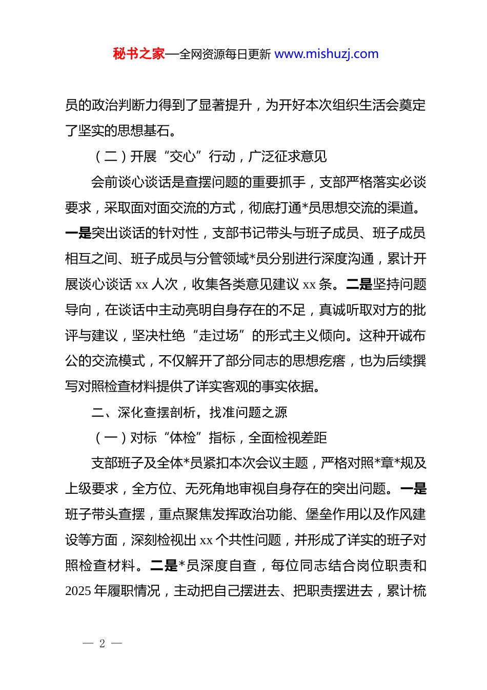 秘书之家—全网资源每日更新 www.mishuzj.com召开 2025 年度组织生活会情况报告:淬炼*性砺初心务实整改促长效按照上级*委统一部署安排,结合我单位 dj 工作实际,中共 xx 支部委员会于近期圆满召开了 2025 年度组织生活会。本次会议紧扣时代脉搏,聚焦 2025 年冲刺收官的各项硬性任务,以强化*性修养、破解发展难题为核心目标,严肃认真开展批评和自我批评。会前,支部班子高度重视,周密部署各项准备工作;会上,全体*员不掩饰问题、不回避矛盾,达到了交流思想、凝聚共识、促进团结的预期目的。现将本次组织生活会的整体召开情况、具体做法、取得成效以及后续整改计划报告如下。一、强化会前准备,筑牢思想之基(一)坚持“领学”导向,深化理论武装支部班子把深化理论学习作为开好组织生活会的先决条件通过集中学习与个人自学相结合的方式,引导全体*员切实统一思想认识。一是周密制定计划,依托“三会一课”制度开展专题研讨,累计举办集中学习 xx 次,参学*员达 xx 人次,确保理论学习全覆盖。二是突出学用结合,紧贴 2025 年核心业务冲刺阶段的实际需求,将抽象的理论转化为指导实践的有力武器,有效避免了学用脱节的现象。通过这一系列的扎实举措,全体*— 1 —秘书之家—全网资源每日更新 www.mishuzj.com员的政治判断力得到了显著提升,为开好本次组织生活会奠定了坚实的思想基石。(二)开展“交心”行动,广泛征求意见会前谈心谈话是查摆问题的重要抓手,支部严格落实必谈要求,采取面对面交流的方式,彻底打通*员思想交流的渠道。一是突出谈话的针对性,支部书记带头与班子成员、班子成员相互之间、班子成员与分管领域*员分别进行深度沟通,累计开展谈心谈话 xx 人次,收集各类意见建议 xx 条。二是坚持问题导向,在谈话中主动亮明自身存在的不足,真诚听取对方的批评与建议,坚决杜绝“走过场”的形式主义倾向。这种开诚布公的交流模式,不仅解开了部分同志的思想疙瘩,也为后续撰写对照检查材料提供了详实客观的事实依据。二、深化查摆剖析,找准问题之源(一)对标“体检”指标,全面检视差距支部班子及全体*员紧扣本次会议主题,严格对照*章*规及上级要求,全方位、无死角地审视自身存在的突出问题。一是班子带头查摆,重点聚焦发挥政治功能、堡垒作用以及作风建设等方面,深刻检视出 xx 个共性问题,并形成了详实的班子对照检查材料。二是*员深度自查,每位同志结合岗位职责和2025 年履职情况,主动把自己摆进去、把职责摆进去,累计梳— 2 —秘书之家—全网资源每日更新 www.mishuzj.com理个人突出问题 xx 条。通过这种严格对标对表的查摆方式,全体*员清晰地看清了自身能力作风与时代要求之间的客观差距,为开出高质量的组织生活会提供了精准的靶向目标。(二)绘制“画像”图谱,深刻剖析根源在全面查摆表象问题的基础上,支部要求全体*员必须深挖根源,透过现象看本质,从思想深处进行反思。一是强化*性剖析,全体同志自觉从理想信念、宗旨意识、责任担当等方面入手,认真撰写个人发言提纲,剖析材料平均修改次数达 xx 次以上,确保见人见事见思想。二是敢于触及灵魂,在剖析过程中坚决摒弃“避重就轻”的错误观念,真正把隐蔽的私心杂念和作风顽疾暴露在阳光下。这一深刻的自我剖析过程,犹如一次触及灵魂的精神洗礼,促使每一位*员从思想深处除旧布新,有效提升了自我净化、自我完善的政治自觉。三、细化批评交锋,凝聚奋进之力(一)亮出“批评”利剑,坚持动真碰硬会议现场的批评与自我批评环节严肃热烈,全体*员不讲私情、不留面子,真正拿起了批评武器。一是自我批评直奔主题,每位同志在发言时直面 2025 年各项工作推进中的失误与不足,不谈客观条件,只查主观原因,共提出自我批评意见 xx 条。二是相互批评辣味十足,大家本着对*忠诚、对同志负责的态度,— 3 —秘书之家—全网资源每日更新 www.mishuzj.com敢于揭短亮丑,直接指出对方在工作作风、执行效率等方面的具体问题,累计提出相互批评意见 xx 条。这种真刀真枪的思想交锋,彻底打破了一团和气的表象,让红脸出汗成为了本次会议的鲜明特征。(二...
