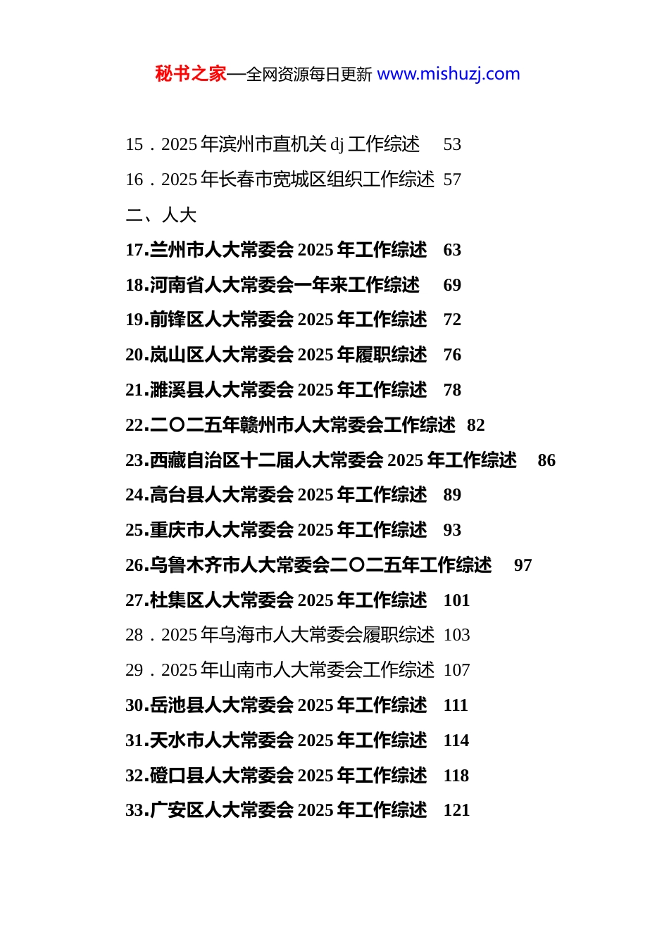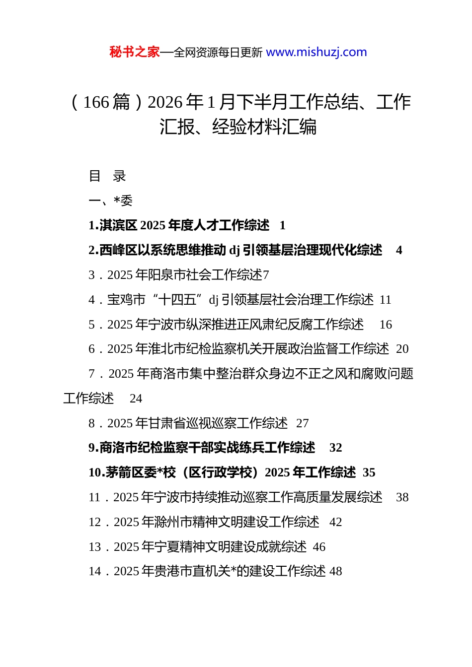 秘书之家—全网资源每日更新 www.mishuzj.com(166 篇)2026 年 1 月下半月工作总结、工作汇报、经验材料汇编目录一、*委1.淇滨区 2025 年度人才工作综述 12.西峰区以系统思维推动 dj 引领基层治理现代化综述43.2025 年阳泉市社会工作综述74.宝鸡市“十四五”dj 引领基层社会治理工作综述 115.2025 年宁波市纵深推进正风肃纪反腐工作综述166.2025 年淮北市纪检监察机关开展政治监督工作综述 207.2025 年商洛市集中整治群众身边不正之风和腐败问题工作综述248.2025 年甘肃省巡视巡察工作综述 279.商洛市纪检监察干部实战练兵工作综述3210.茅箭区委*校(区行政学校)2025 年工作综述 3511.2025 年宁波市持续推动巡察工作高质量发展综述3812.2025 年滁州市精神文明建设工作综述 4213.2025 年宁夏精神文明建设成就综述 4614.2025 年贵港市直机关*的建设工作综述 48秘书之家—全网资源每日更新 www.mishuzj.com15.2025 年滨州市直机关 dj 工作综述5316.2025 年长春市宽城区组织工作综述 57二、人大17.兰州市人大常委会 2025 年工作综述6318.河南省人大常委会一年来工作综述6919.前锋区人大常委会 2025 年工作综述7220.岚山区人大常委会 2025 年履职综述7621.濉溪县人大常委会 2025 年工作综述7822.二〇二五年赣州市人大常委会工作综述 8223.西藏自治区十二届人大常委会 2025 年工作综述8624.高台县人大常委会 2025 年工作综述8925.重庆市人大常委会 2025 年工作综述9326.乌鲁木齐市人大常委会二〇二五年工作综述9727.杜集区人大常委会 2025 年工作综述10128.2025 年乌海市人大常委会履职综述 10329.2025 年山南市人大常委会工作综述 10730.岳池县人大常委会 2025 年工作综述11131.天水市人大常委会 2025 年工作综述11432.磴口县人大常委会 2025 年工作综述11833.广安区人大常委会 2025 年工作综述121秘书之家—全网资源每日更新 www.mishuzj.com34.2025 年池州市人大常委会工作综述 12635.邻水县人大常委会 2025 年工作综述13036.张家口市十五届人大常委会 2025 年工作综述13437.北京市十六届人大常委会 2025 年履职综述 138三、政府38.宁县“十四五”时期农业产业发展综述 14439.2025 年阳原县农业农村局工作综述 14840.2025 年云南民政事业发展综述15241.十堰市卫健事业 2025 年高质量发展成效综述15742.“十四五”时期临夏州财政工作综述 16143.2025 年宝鸡市招商引资工作综述 16444.“十四五”时期阳泉市优化营商环境工作综述 16845.—甘肃省“十四五”交通运输高质量发展综述 17146.“十四五”时期广元市住房城乡建设发展成就综述17347.银川经开区 2025 年高质量发展综述17648.2025 年以来桂林市全面深化改革综述 18049.永州市“十四五”时期全面深化改革综述18650.二〇二五年青海省卫生健康事业发展成效综述 19251.灵山县“十四五”政务服务工作综述 194秘书之家—全网资源每日更新 www.mishuzj.com52.平凉市农业农村工作综述19853.2025 年衡水市“三农”工作综述 20254.天水“十四五”民生工作高质量发展综述20555.“十四五”广元市医疗卫生健康事业发展综述 20956.“十四五”时期临夏州林业草原保护工作综述 21257.2025 年广西商务高质量发展综述 21558.石棉县交通运输局 2025 年工作综述22059.“十四五”时期江苏省市场监管事业高质量发展综述22460.2025 年台州市政府为民办实事工作综述22761.汤阴县城市管理局 2025 年亮点工作综述22962.2025 年衡水市持续优化营商环境工作综述23163.2025 年宝鸡工业强市建设综述23464.忻州市 2025 年度文旅工作高质量发展综述 23865.“十四五”时期银川市经济社会发展综述24166.漳州市交通运输“十四五”工作成效综述24767.“十四五”时期黄山市档案事业发展综述25268.宁夏回族自治区市场监管厅谱写新时代奋进篇章综述25769.滁州经济技术开发区经济社会高质量发展综述 260秘书之家—全网资源每日更新 www.mishuzj.com70.安阳市“十四五”档案事业高质量发展综述26571.二〇二五年濮阳市自然资源和规...