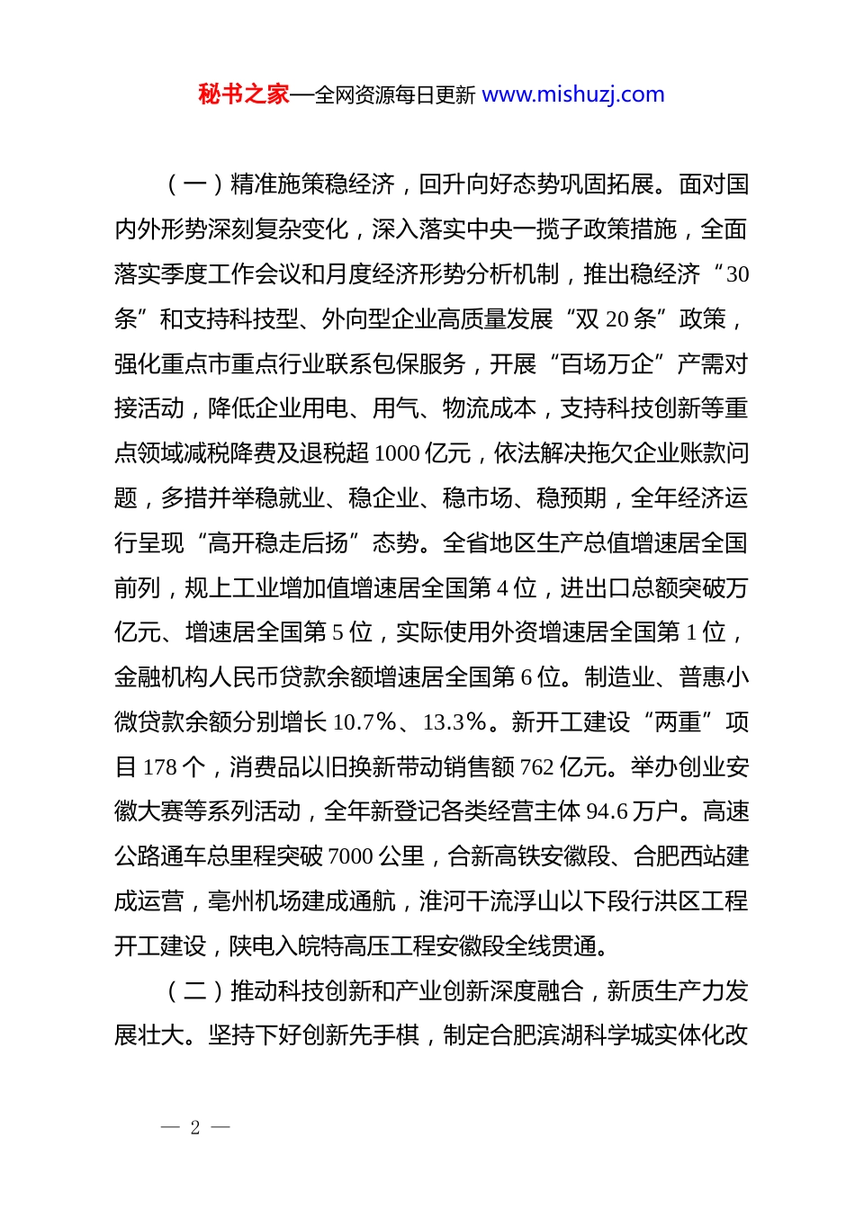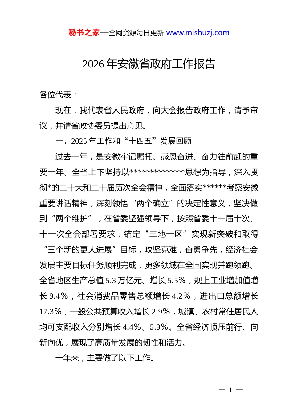 秘书之家—全网资源每日更新 www.mishuzj.com2026 年安徽省政府工作报告各位代表:现在,我代表省人民政府,向大会报告政府工作,请予审议,并请省政协委员提出意见。一、2025 年工作和“十四五”发展回顾过去一年,是安徽牢记嘱托、感恩奋进、奋力往前赶的重要一年。全省上下坚持以**************思想为指导,深入贯彻*的二十大和二十届历次全会精神,全面落实******考察安徽重要讲话精神,深刻领悟“两个确立”的决定性意义,坚决做到“两个维护”,在省委坚强领导下,按照省委十一届十次、十一次全会部署要求,锚定“三地一区”实现新突破和取得“三个新的更大进展”目标,攻坚克难,奋勇争先,经济社会发展主要目标任务顺利完成,更多领域在全国实现并跑领跑。全省地区生产总值 5.3 万亿元、增长 5.5%,规上工业增加值增长 9.4%,社会消费品零售总额增长 4.2%,进出口总额增长17.3%,一般公共预算收入增长 2.9%,城镇、农村常住居民人均可支配收入分别增长 4.4%、5.9%。全省经济顶压前行、向新向优,展现了高质量发展的韧性和活力。一年来,主要做了以下工作。— 1 —秘书之家—全网资源每日更新 www.mishuzj.com(一)精准施策稳经济,回升向好态势巩固拓展。面对国内外形势深刻复杂变化,深入落实中央一揽子政策措施,全面落实季度工作会议和月度经济形势分析机制,推出稳经济“30条”和支持科技型、外向型企业高质量发展“双 20 条”政策,强化重点市重点行业联系包保服务,开展“百场万企”产需对接活动,降低企业用电、用气、物流成本,支持科技创新等重点领域减税降费及退税超 1000 亿元,依法解决拖欠企业账款问题,多措并举稳就业、稳企业、稳市场、稳预期,全年经济运行呈现“高开稳走后扬”态势。全省地区生产总值增速居全国前列,规上工业增加值增速居全国第 4 位,进出口总额突破万亿元、增速居全国第 5 位,实际使用外资增速居全国第 1 位,金融机构人民币贷款余额增速居全国第 6 位。制造业、普惠小微贷款余额分别增长 10.7%、13.3%。新开工建设“两重”项目 178 个,消费品以旧换新带动销售额 762 亿元。举办创业安徽大赛等系列活动,全年新登记各类经营主体 94.6 万户。高速公路通车总里程突破 7000 公里,合新高铁安徽段、合肥西站建成运营,亳州机场建成通航,淮河干流浮山以下段行洪区工程开工建设,陕电入皖特高压工程安徽段全线贯通。(二)推动科技创新和产业创新深度融合,新质生产力发展壮大。坚持下好创新先手棋,制定合肥滨湖科学城实体化改— 2 —秘书之家—全网资源每日更新 www.mishuzj.com革实施方案,办好“日新:江淮科创沙龙”,以创新思维答好“创新之问”。科创引领高地建设取得重大进展,量子计算研发平台获批立项,紧凑型聚变能实验装置提前进入总装,国际深空探测学会总部落户合肥。“政产学研金服用”融合服务平台、科技与产业融合创新协会组建运行。量子信息、集成电路、人工智能、生命科学等领域取得一批领跑并跑成果并加速产业化应用。科技型企业队伍不断壮大,新增科技型中小企业 7227家、高新技术企业 3200 家、专精特新企业 1565 家。优化升级江淮英才计划,实施省卓越工程师队伍建设行动,遴选支持创新创业领军人才 197 名,新增“两院”院士 5 人。安徽高等研究院实施校企联合人才培养和科研攻关项目 899 个,省属高校服务新兴产业专业点占比提高到 72.2%。坚持以科技创新引领产业升级,战略性新兴产业产值增长11.5%,高技术制造业增加值增长 30.4%、连续 24 个月保持两位数增长。构建开放型汽车生态实验室体系,20 多项全球首发技术装车应用,汽车、新能源汽车产量历史性跃居全国首位,整车出口突破百万辆、稳居全国第 1 位。电子信息产业增加值增长 40.9%,工业机器人产量增长 35.3%、出口量居全国第 2位,光储产业综合竞争力居全国第 3 位,国家人工智能产业高地获批建设,人工智能产业发展评价居全国第 5 位。首批 10 个— 3 —秘书之家—全网资源每日更新 www.mishuzj.com未来产业先导区集聚产业链核心企业超 150 家,量子科技产业...