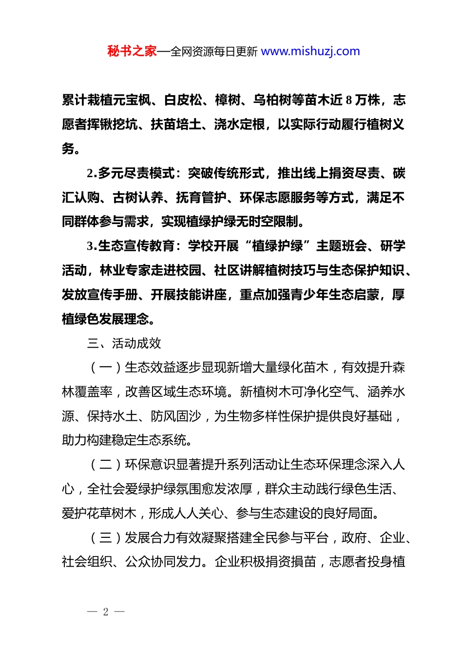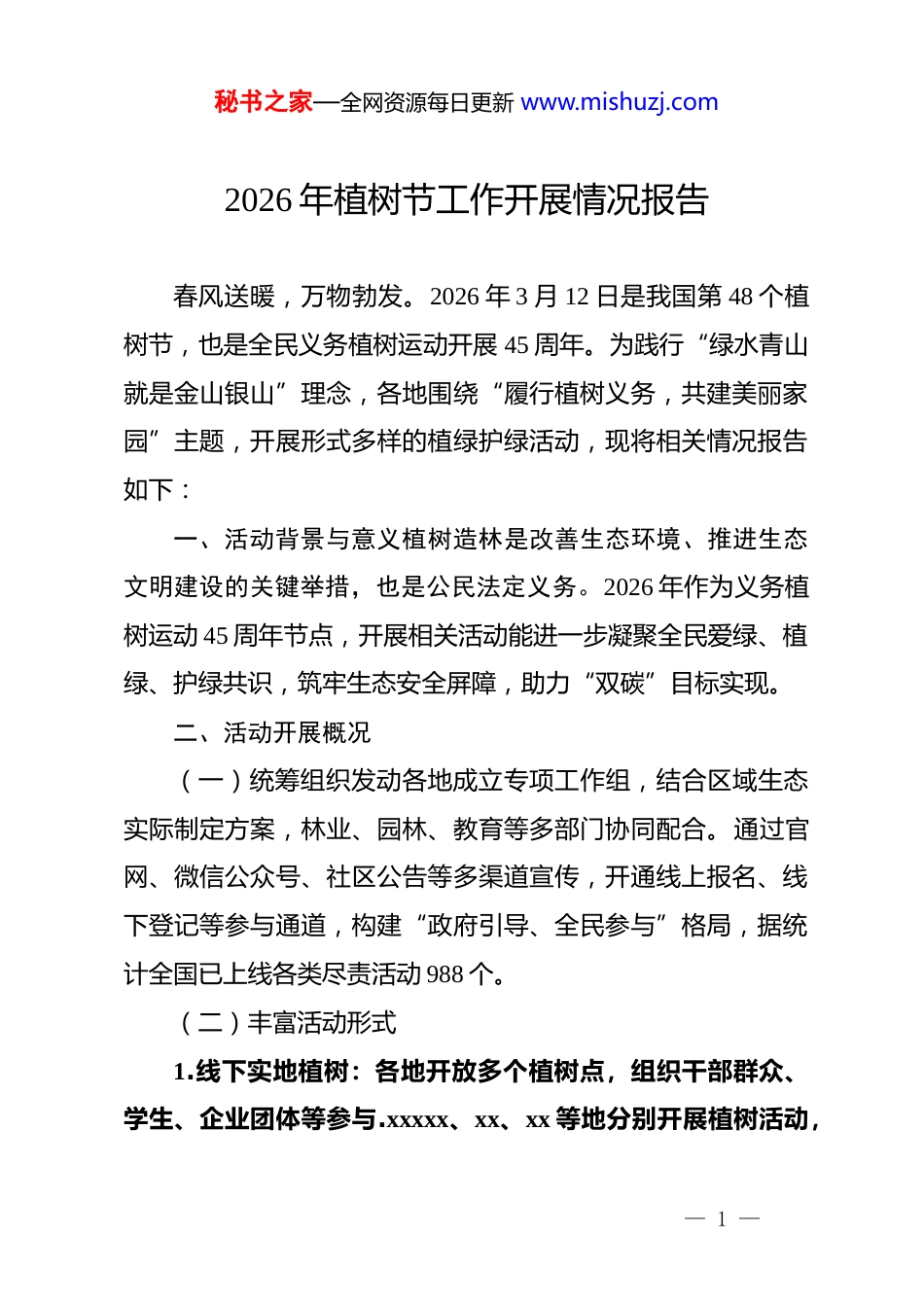 秘书之家—全网资源每日更新 www.mishuzj.com2026 年植树节工作开展情况报告春风送暖,万物勃发。2026 年 3 月 12 日是我国第 48 个植树节,也是全民义务植树运动开展 45 周年。为践行“绿水青山就是金山银山”理念,各地围绕“履行植树义务,共建美丽家园”主题,开展形式多样的植绿护绿活动,现将相关情况报告如下:一、活动背景与意义植树造林是改善生态环境、推进生态文明建设的关键举措,也是公民法定义务。2026 年作为义务植树运动 45 周年节点,开展相关活动能进一步凝聚全民爱绿、植绿、护绿共识,筑牢生态安全屏障,助力“双碳”目标实现。二、活动开展概况(一)统筹组织发动各地成立专项工作组,结合区域生态实际制定方案,林业、园林、教育等多部门协同配合。通过官网、微信公众号、社区公告等多渠道宣传,开通线上报名、线下登记等参与通道,构建“政府引导、全民参与”格局,据统计全国已上线各类尽责活动 988 个。(二)丰富活动形式1.线下实地植树:各地开放多个植树点,组织干部群众、学生、企业团体等参与.xxxxx、xx、xx 等地分别开展植树活动,— 1 —秘书之家—全网资源每日更新 www.mishuzj.com累计栽植元宝枫、白皮松、樟树、乌柏树等苗木近 8 万株,志愿者挥锹挖坑、扶苗培土、浇水定根,以实际行动履行植树义务。2.多元尽责模式:突破传统形式,推出线上捐资尽责、碳汇认购、古树认养、抚育管护、环保志愿服务等方式,满足不同群体参与需求,实现植绿护绿无时空限制。3.生态宣传教育:学校开展“植绿护绿”主题班会、研学活动,林业专家走进校园、社区讲解植树技巧与生态保护知识、发放宣传手册、开展技能讲座,重点加强青少年生态启蒙,厚植绿色发展理念。三、活动成效(一)生态效益逐步显现新增大量绿化苗木,有效提升森林覆盖率,改善区域生态环境。新植树木可净化空气、涵养水源、保持水土、防风固沙,为生物多样性保护提供良好基础,助力构建稳定生态系统。(二)环保意识显著提升系列活动让生态环保理念深入人心,全社会爱绿护绿氛围愈发浓厚,群众主动践行绿色生活、爱护花草树木,形成人人关心、参与生态建设的良好局面。(三)发展合力有效凝聚搭建全民参与平台,政府、企业、社会组织、公众协同发力。企业积极捐资損苗,志愿者投身植— 2 —秘书之家—全网资源每日更新 www.mishuzj.com绿护绿服务,凝聚起推动绿色发展、建设美丽中国的强大合力。四、存在问题(一)部分地区植树后续管护机制不完善,存在树苗存活率不高的问题。(二)全民义务植树参与度区域差异较大,偏远地区宣传动员不足。(三)绿色产业与植树活动融合度不高,生态效益转化为经济社会效益的路径有待拓宽。五、后续计划(一)强化后续管护,建立“谁种谁护”长效机制,组织专业人员与志愿者定期巡查、科学养护,确保树苗存活生长。(二)加大宣传力度,针对偏远地区通过乡村广播、流动宣讲等方式扩大覆盖,创新宣传形式,提升全民参与积极性。(三)推动产业融合,结合植树活动发展生态旅游、林下经济等,实现生态效益与经济效益双赢,持续推进国土绿化行动。— 3 —