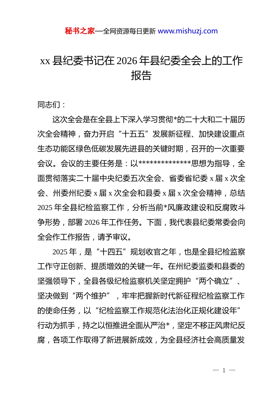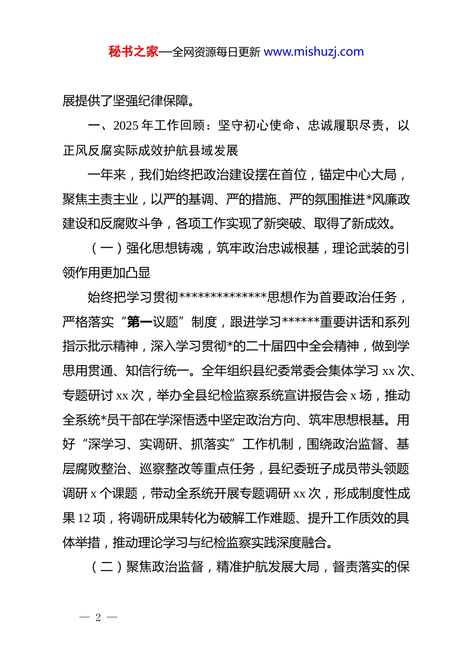 秘书之家—全网资源每日更新 www.mishuzj.comxx 县纪委书记在 2026 年县纪委全会上的工作报告同志们:这次全会是在全县上下深入学习贯彻*的二十大和二十届历次全会精神,奋力开启“十五五”发展新征程、加快建设重点生态功能区绿色低碳发展先进县的关键时期,召开的一次重要会议。会议的主要任务是:以**************思想为指导,全面贯彻落实二十届中央纪委五次全会、省委省纪委 x 届 x 次全会、州委州纪委 x 届 x 次全会和县委 x 届 x 次全会精神,总结2025 年全县纪检监察工作,分析当前*风廉政建设和反腐败斗争形势,部署 2026 年工作任务。下面,我代表县纪委常委会向全会作工作报告,请予审议。2025 年,是“十四五”规划收官之年,也是全县纪检监察工作守正创新、提质增效的关键一年。在州纪委监委和县委的坚强领导下,全县各级纪检监察机关坚定拥护“两个确立”、坚决做到“两个维护”,牢牢把握新时代新征程纪检监察工作的使命任务,以“纪检监察工作规范化法治化正规化建设年”行动为抓手,持之以恒推进全面从严治*,坚定不移正风肃纪反腐,各项工作取得了新进展新成效,为全县经济社会高质量发— 1 —秘书之家—全网资源每日更新 www.mishuzj.com展提供了坚强纪律保障。一、2025 年工作回顾:坚守初心使命、忠诚履职尽责,以正风反腐实际成效护航县域发展一年来,我们始终把政治建设摆在首位,锚定中心大局,聚焦主责主业,以严的基调、严的措施、严的氛围推进*风廉政建设和反腐败斗争,各项工作实现了新突破、取得了新成效。(一)强化思想铸魂,筑牢政治忠诚根基,理论武装的引领作用更加凸显始终把学习贯彻**************思想作为首要政治任务,严格落实“第一议题”制度,跟进学习******重要讲话和系列指示批示精神,深入学习贯彻*的二十届四中全会精神,做到学思用贯通、知信行统一。全年组织县纪委常委会集体学习 xx 次、专题研讨 xx 次,举办全县纪检监察系统宣讲报告会 x 场,推动全系统*员干部在学深悟透中坚定政治方向、筑牢思想根基。用好“深学习、实调研、抓落实”工作机制,围绕政治监督、基层腐败整治、巡察整改等重点任务,县纪委班子成员带头领题调研 x 个课题,带动全系统开展专题调研 xx 次,形成制度性成果 12 项,将调研成果转化为破解工作难题、提升工作质效的具体举措,推动理论学习与纪检监察实践深度融合。(二)聚焦政治监督,精准护航发展大局,督责落实的保— 2 —秘书之家—全网资源每日更新 www.mishuzj.com障作用更加有效牢牢把握政治监督根本定位,把贯彻落实**********批示精神作为政治监督的首要任务,建立清单化、项目化监督机制,围绕生态保护、乡村振兴、绿色低碳发展等****批示,督改问题 31 个,推动*中央决策部署在我县落地生根。紧盯省、州、县大事要事强化监督,紧扣重点生态功能区建设、产业转型升级、民生保障等中心工作,分领域细化监督内容 21 项,开展专项监督检查 xx 次,督改问题 259 个,确保政令畅通。紧盯“一把手”和领导班子成员这个“关键少数”,健全完善严管严治机制,全年共处理处分“一把手”及领导班子成员 54 人,留置4 人,移送司法机关 3 人,以严管强约束推动“关键少数”严以律己、严负其责、严管所辖。健全政治要件闭环监督机制,分层分类对 9 个乡镇、57 个县直单位、2 个县属重点企业开展政治生态全覆盖评价,精准画像、靶向施策,交办整改问题 171个,推动各级*组织不断净化政治生态。(三)深化作风建设,严守中央八项规定,纪律建设的刚性约束更加牢固扎实开展深入贯彻中央八项规定精神学习教育,把纪律教育融入日常、抓在经常。组织全县各级*组织开展违反中央八项规定精神典型案例学习剖析活动 xx 场次,制作警示教育片《牌— 3 —秘书之家—全网资源每日更新 www.mishuzj.com“局”深渊》,组织*员干部观看学习 x 万余人次,引导*员干部知敬畏、存戒惧、守底线。多渠道、常态化开展*规 dj 宣传解读,通过“清廉 xx”微信公众号、政务网等平台发布纪律教育内容 xx 条,通报典型案例 12 期,用身边事教育身边人。坚持...