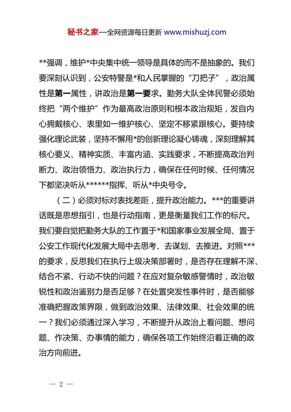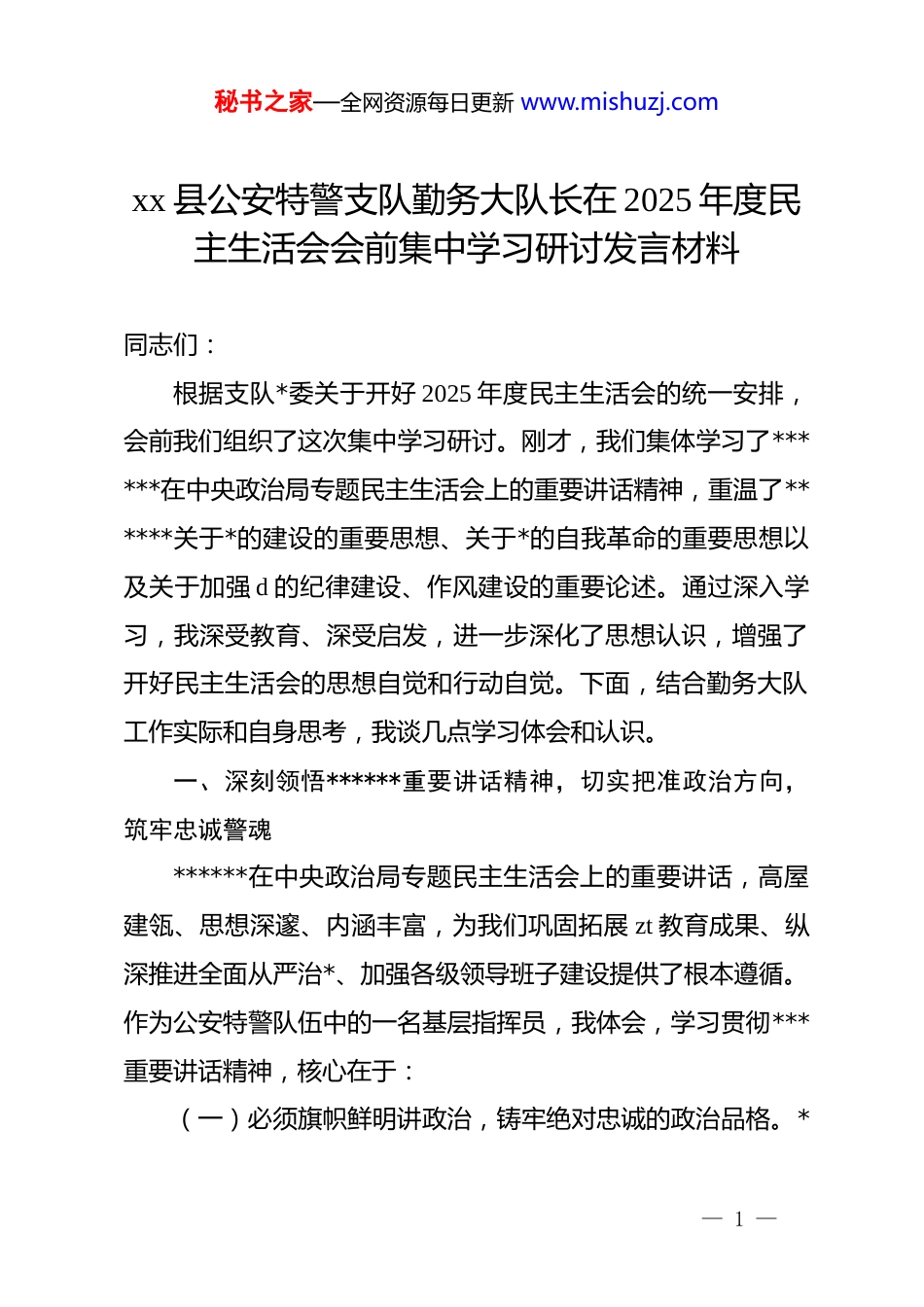 秘书之家—全网资源每日更新 www.mishuzj.comxx 县公安特警支队勤务大队长在 2025 年度民主生活会会前集中学习研讨发言材料同志们:根据支队*委关于开好 2025 年度民主生活会的统一安排,会前我们组织了这次集中学习研讨。刚才,我们集体学习了******在中央政治局专题民主生活会上的重要讲话精神,重温了******关于*的建设的重要思想、关于*的自我革命的重要思想以及关于加强 d 的纪律建设、作风建设的重要论述。通过深入学习,我深受教育、深受启发,进一步深化了思想认识,增强了开好民主生活会的思想自觉和行动自觉。下面,结合勤务大队工作实际和自身思考,我谈几点学习体会和认识。一、深刻领悟******重要讲话精神,切实把准政治方向,筑牢忠诚警魂******在中央政治局专题民主生活会上的重要讲话,高屋建瓴、思想深邃、内涵丰富,为我们巩固拓展 zt 教育成果、纵深推进全面从严治*、加强各级领导班子建设提供了根本遵循。作为公安特警队伍中的一名基层指挥员,我体会,学习贯彻***重要讲话精神,核心在于:(一)必须旗帜鲜明讲政治,铸牢绝对忠诚的政治品格。*— 1 —秘书之家—全网资源每日更新 www.mishuzj.com**强调,维护*中央集中统一领导是具体的而不是抽象的。我们要深刻认识到,公安特警是*和人民掌握的“刀把子”,政治属性是第一属性,讲政治是第一要求。勤务大队全体民警必须始终把“两个维护”作为最高政治原则和根本政治规矩,发自内心拥戴核心、表里如一维护核心、坚定不移紧跟核心。要持续强化理论武装,坚持不懈用*的创新理论凝心铸魂,深刻理解其核心要义、精神实质、丰富内涵、实践要求,不断提高政治判断力、政治领悟力、政治执行力,确保在任何时候、任何情况下都坚决听从******指挥、听从*中央号令。(二)必须对标对表找差距,提升政治能力。***的重要讲话既是思想指引,也是行动指南,更是衡量我们工作的标尺。我们要自觉把勤务大队的工作置于*和国家事业发展全局、置于公安工作现代化发展大局中去思考、去谋划、去推进。对照***的要求,反思我们在执行上级决策部署时,是否存在理解不深、结合不紧、行动不快的问题?在应对复杂敏感警情时,政治敏锐性和政治鉴别力是否足够?在处置突发性事件时,是否能够准确把握政策界限,做到政治效果、法律效果、社会效果的统一?我们必须通过深入学习,不断提升从政治上看问题、想问题、作决策、办事情的能力,确保各项工作始终沿着正确的政治方向前进。— 2 —秘书之家—全网资源每日更新 www.mishuzj.com(三)必须站稳人民立场,践行初心使命。***强调,要始终把人民放在心中最高位置。我们特警勤务大队,无论是街面巡逻、应急处突,还是重大活动安保,都与人民群众的安全感、满意度息息相关。我们要时刻牢记“我是谁、为了谁、依靠谁”,把维护好人民群众的根本利益作为一切工作的出发点和落脚点。在日常勤务中,要规范文明执法执勤,用心用情解决群众“急难愁盼”问题,不断提升服务群众的本领,努力使人民群众在每一起案件办理、每一次执法活动中都能感受到公平正义和公安温度。二、深入践行******关于*的建设的重要思想,锻造坚强有力的特警战斗堡垒******关于*的建设的重要思想,是马克思主义建*学说中国化时代化的最新成果,为我们推进新时代*的建设新的伟大工程提供了总遵循、总依据。作为基层大队,贯彻落实这一重要思想,关键在于:(一)着力强化政治功能和组织功能。大队*支部是*在公安特警队伍中的基础组织,担负着直接教育*员、管理*员、监督*员和组织群众、宣传群众、凝聚群众、服务群众的职责。我们要以提升组织力为重点,突出政治功能,严格落实“三会一课”、组织生活会、民主评议*员等基本制度,不断增强*内政— 3 —秘书之家—全网资源每日更新 www.mishuzj.com治生活的政治性、时代性、原则性、战斗性。要把政治标准和政治要求贯穿于*支部建设的全过程各方面,把*支部建设成为宣传*的主张、贯彻*的决定、领导基层治理、团结动员群众、推动改革发展的坚强战斗堡垒,让*旗在特警勤务一线高高飘扬。(二)着力建设高素质专业化特警队伍。***强调,光有思路和部署,没有...
