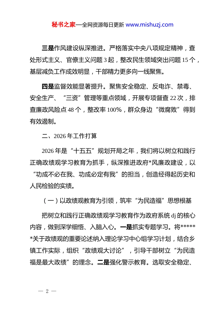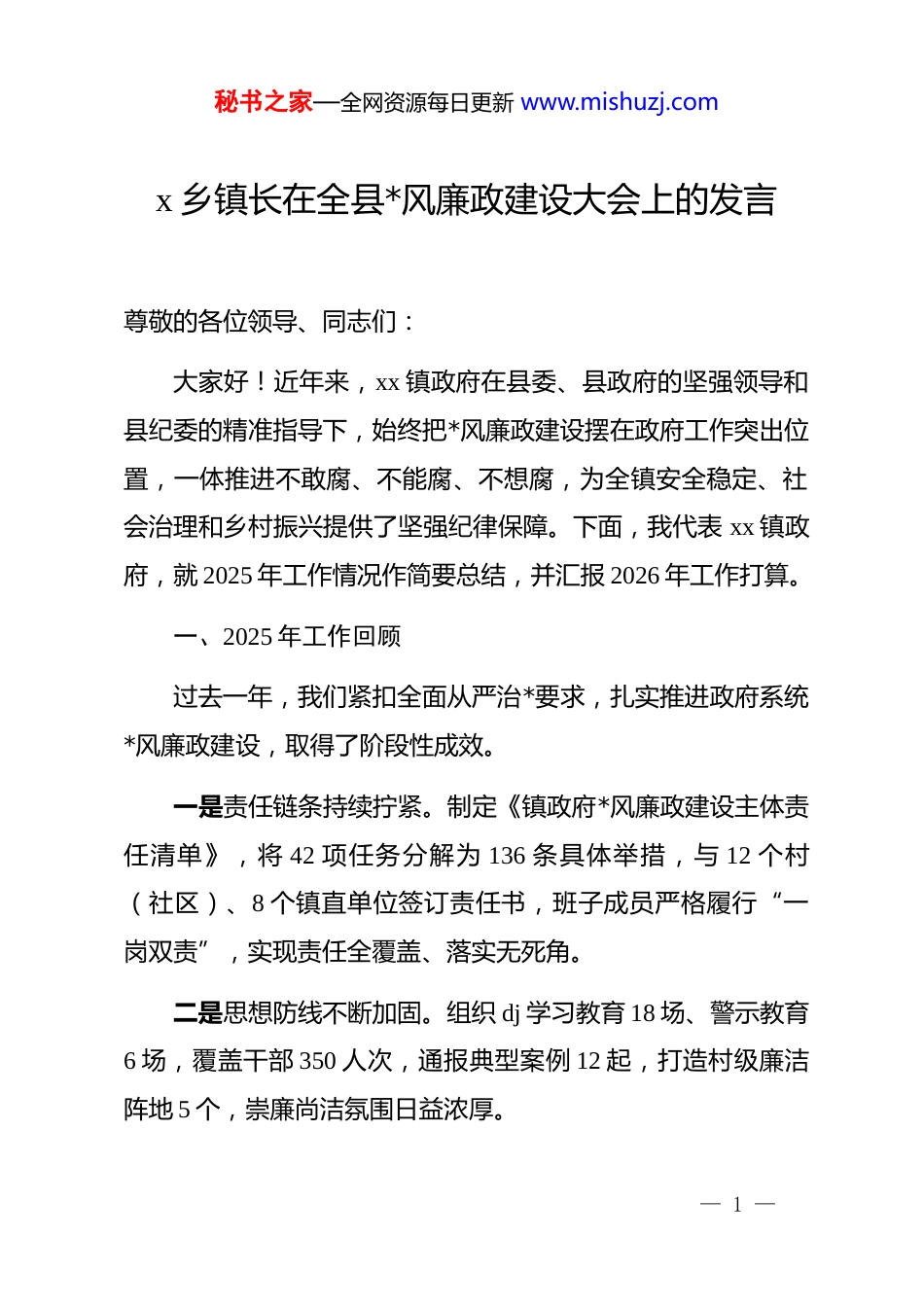 秘书之家—全网资源每日更新 www.mishuzj.comx 乡镇长在全县*风廉政建设大会上的发言尊敬的各位领导、同志们:大家好!近年来,xx 镇政府在县委、县政府的坚强领导和县纪委的精准指导下,始终把*风廉政建设摆在政府工作突出位置,一体推进不敢腐、不能腐、不想腐,为全镇安全稳定、社会治理和乡村振兴提供了坚强纪律保障。下面,我代表 xx 镇政府,就 2025 年工作情况作简要总结,并汇报 2026 年工作打算。一、2025 年工作回顾过去一年,我们紧扣全面从严治*要求,扎实推进政府系统*风廉政建设,取得了阶段性成效。一是责任链条持续拧紧。制定《镇政府*风廉政建设主体责任清单》,将 42 项任务分解为 136 条具体举措,与 12 个村(社区)、8 个镇直单位签订责任书,班子成员严格履行“一岗双责”,实现责任全覆盖、落实无死角。二是思想防线不断加固。组织 dj 学习教育 18 场、警示教育6 场,覆盖干部 350 人次,通报典型案例 12 起,打造村级廉洁阵地 5 个,崇廉尚洁氛围日益浓厚。— 1 —秘书之家—全网资源每日更新 www.mishuzj.com三是作风建设纵深推进。严格落实中央八项规定精神,查处形式主义、官僚主义问题 3 起,整改民生领域突出问题 15 个,基层减负工作成效明显,干部精力更多向一线聚焦。四是监督效能显著提升。聚焦安全稳定、反电诈、禁毒、安全生产、“三资”管理等重点领域,开展专项督查 22 次,排查廉政风险点 48 个,整改率 100%,群众身边“微腐败”得到有效遏制。二、2026 年工作打算2026 年是“十五五”规划开局之年,我们将以树立和践行正确政绩观学习教育为抓手,纵深推进政府*风廉政建设,以“功成不必在我、功成必定有我”的担当,创造经得起历史和人民检验的实绩。(一)以政绩观教育为引领,筑牢“为民造福”思想根基把树立和践行正确政绩观学习教育作为政府系统 dj 的核心内容,做到深学细悟、入脑入心。一是抓实专题学习。将******关于政绩观的重要论述纳入理论学习中心组学习计划,结合乡镇工作实际,组织“政绩观大讨论”,引导干部树立“为民造福是最大政绩”的理念。二是强化警示教育。选取安全稳定、— 2 —秘书之家—全网资源每日更新 www.mishuzj.com民生保障等领域的典型案例,开展“用身边事教育身边人”活动,组织干部参观警示教育基地,撰写心得体会,从思想上杜绝“政绩工程”“形象工程”。三是厚植廉洁文化。挖掘 xx 本土廉洁元素,打造“廉洁文化长廊”,开展廉洁家风建设活动,让廉洁理念融入工作生活。(二)以政绩观践行为核心,健全“实干担当”制度体系将政绩观要求融入政府工作全流程,用制度保障实干导向一是压实主体责任。修订完善*风廉政建设责任清单,将政绩观践行情况纳入班子成员“一岗双责”考核,形成“主要领导负总责、分管领导具体抓、各部门抓落实”的工作格局。二是完善考核评价。建立“民生导向、实干导向、长效导向”的考核体系,增设安全稳定、反电诈、安全生产、民生改善等指标权重,实施“短期评估+长期跟踪”动态考核,探索政绩追溯机制。三是规范权力运行。健全村级小微权力清单,聚焦行政审批、项目建设、资金使用等关键环节,推行“清单化管理、阳光化运行”,确保权力在监督下规范行使。(三)以政绩观落地为抓手,锤炼“求真务实”工作作风把践行正确政绩观转化为干事创业的实际行动,以优良作— 3 —秘书之家—全网资源每日更新 www.mishuzj.com风推动工作落实。一是深化作风整治。持续整治形式主义,精简会议文件,减少不必要的督查考核,让干部腾出更多精力抓落实。坚决纠治“不作为、慢作为、乱作为”,树立“重实干、重实绩”的用人导向。二是聚焦民生实事。围绕群众急难愁盼,实施人居环境整治、养老服务提升、医疗资源下沉等 10 件民生实事,建立“清单化推进、销号式管理”机制,确保事事有回音、件件有着落。三是强化担当作为。在安全稳定、反电诈、禁毒、乡村振兴等一线设立“攻坚岗”,鼓励干部迎难而上,对表现突出的予以表彰奖励,让实干者有舞台、有为者有位。(四)以政绩观护航为保障,绷紧“廉洁自律”纪律之弦坚持严的基调不...