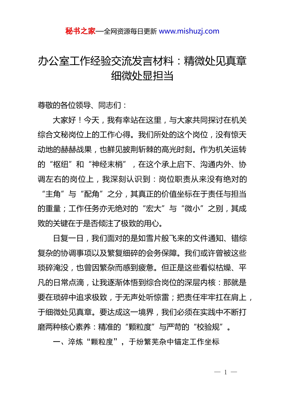 秘书之家—全网资源每日更新 www.mishuzj.com办公室工作经验交流发言材料:精微处见真章细微处显担当尊敬的各位领导、同志们:大家好!今天,我有幸站在这里,与大家共同探讨在机关综合文秘岗位上的工作心得。我们所处的这个岗位,没有惊天动地的赫赫战果,也鲜见披荆斩棘的高光时刻。作为机关运转的“枢纽”和“神经末梢”,在这个承上启下、沟通内外、协调左右的岗位上,我深刻认识到:岗位职责从来没有绝对的“主角”与“配角”之分,其真正的价值坐标在于责任与担当的重量;工作任务亦无绝对的“宏大”与“微小”之别,其成败的关键在于是否倾注了极致的用心。日复一日,我们面对的是如雪片般飞来的文件通知、错综复杂的协调事项以及繁复细碎的会务保障。我们或许曾被这些琐碎淹没,也曾因繁杂而感到疲惫。但正是这些看似枯燥、平凡的日常点滴,让我逐渐体悟到综合岗位的深层内核:那就是要在琐碎中追求极致,于无声处听惊雷;把责任牢牢扛在肩上,于细微处见真章。要达成这一境界,我们必须在实践中不断打磨两种核心素养:精准的“颗粒度”与严苛的“校验规”。一、淬炼“颗粒度”,于纷繁芜杂中锚定工作坐标— 1 —秘书之家—全网资源每日更新 www.mishuzj.com综合工作常被比作机关的“万花筒”,事务繁杂、头绪万千,且往往面临着高频次、快节奏的考验。初入此岗,难免会感到手忙脚乱、顾此失彼。然而,经过长期的沉淀与摸索,我发现这“乱花渐欲迷人眼”的表象之下,实则隐藏着清晰的运行逻辑与脉络。要破解这一难题,关键在于不断细化工作的“颗粒度”,在精度、深度、时效上狠下功夫,精准把握工作的每一个环节。(一)从“交卷”到“达标”,跨越责任意识的颗粒度。曾几何时,我也曾陷入“任务完成论”的误区。领导交办下发通知,只要按时发出了便觉得万事大吉;要求起草汇报材料,只要按时交稿便心安理得。然而,一次深刻的教训彻底敲醒了我。那是一份涉及多部门协同的紧急通知,我虽然准时发送,但由于未在标题处醒目地标注“特急”字样,也未在正文开篇提炼出核心要求与完成时限,导致部分牵头部门未能第一时间识别出其紧迫性,最终导致了后续环节的严重延误。这件事如同当头棒喝,让我豁然开朗:“完成”与“达标”之间,看似只有一步之遥,实则隔着沉甸甸的责任心与用户思维。自此以后,我给自己立下规矩:下发通知,必须确保标题醒目、要点清晰、接收对象明确无误;办理文件,必须力求格式规范、内容精准、逻辑严密。我们不仅要当好“传声筒”,更要确保— 2 —秘书之家—全网资源每日更新 www.mishuzj.com“接收方听得懂、记得牢”。这“达标”的颗粒度,正是我们彰显专业素养的第一块试金石。(二)变“被动”为“主动”,提升前瞻预判的颗粒度。综合岗位往往处于信息流的中转站,是各类任务的“接收端”。但这绝不意味着我们只能像算盘珠子一样,“拨一拨才动一动”。真正的效能飞跃,源于将“被动接收指令”升华为“主动解析需求”。我曾习惯于领导交代一项任务才去执行一项任务,后来在实践中逐渐悟出,高效的机关工作者往往能够“想在领导前面”。例如,在筹备重要会议时,我不再仅仅满足于做好基础的会务保障工作,而是在会议结束后的第一时间,主动根据会议讨论的焦点、议定的核心事项,草拟出包含“决策内容、责任部门、完成时限、协同要求”的会议纪要初稿,呈送领导审阅。这种“向前一步”的主动解析与预判,不仅极大地提升了机关的运转效率,减轻了领导的案头负担,更是在无声中丈量着我们工作的前瞻性与价值颗粒度。(三)化“模糊”为“清晰”,界定精准执行的颗粒度。在日常工作中,我们经常会接到一些方向性、框架性甚至略显模糊的指令,比如“把这几份材料整合一下”“牵头拿个方案出来”。如果此时贸然动手,极易陷入事倍功半的窘境,甚至南辕北辙。我逐渐摸索出一个行之有效的方法:在接到此类任— 3 —秘书之家—全网资源每日更新 www.mishuzj.com务时,先静下心来花几分钟进行“需求澄清”。这份材料的最终用途是什么?汇报对象是谁?希望达到的核心效果是什么?有没有需要特别强化的重点或者必须规避的敏感点?这几个问题看似基...