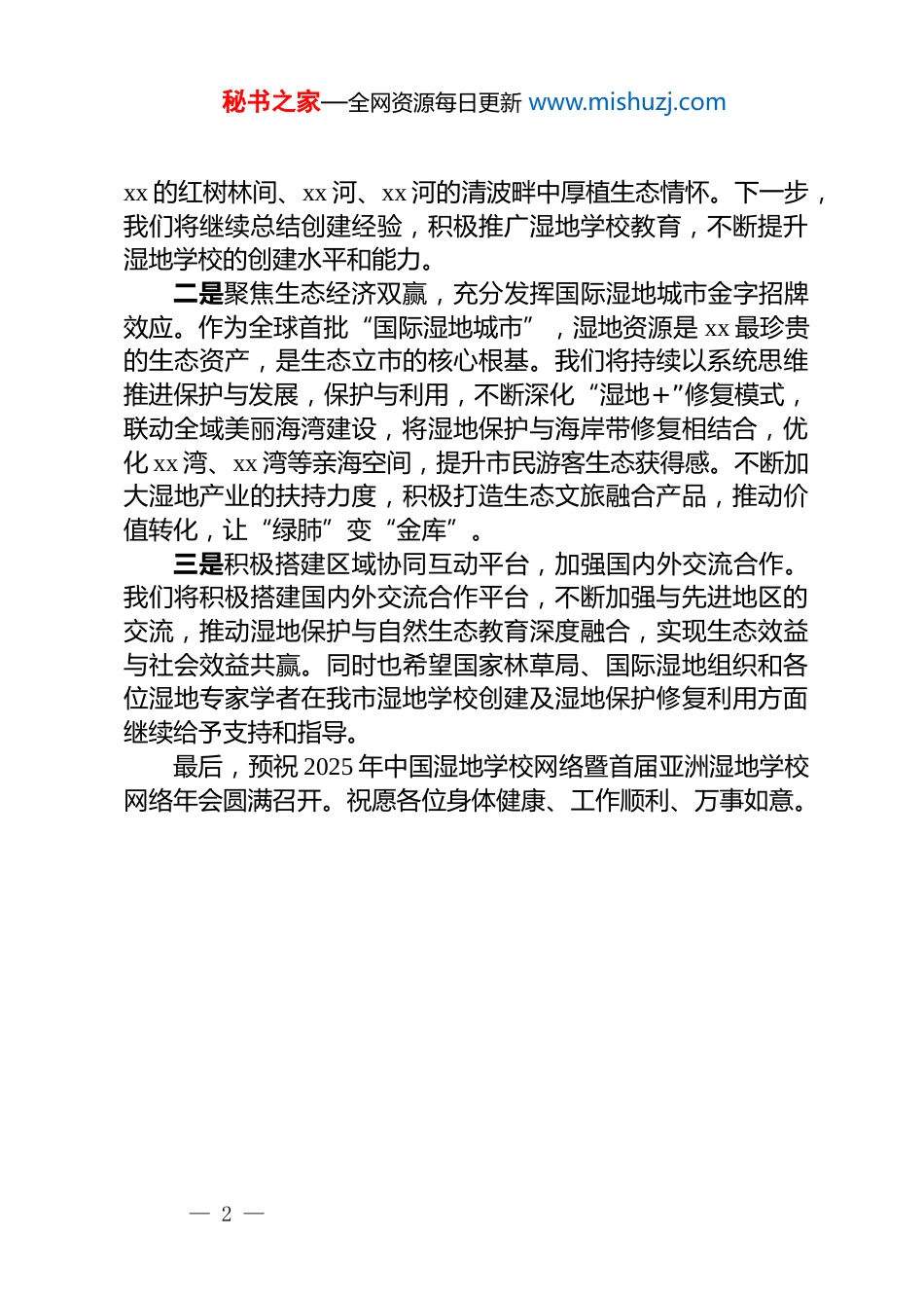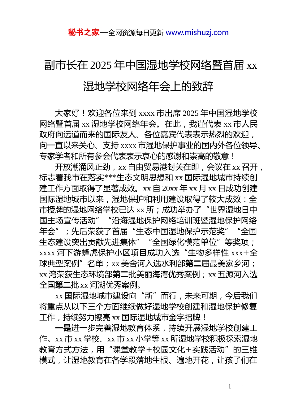 秘书之家—全网资源每日更新 www.mishuzj.com副市长在 2025 年中国湿地学校网络暨首届 xx湿地学校网络年会上的致辞大家好!欢迎各位来到 xxxx 市出席 2025 年中国湿地学校网络暨首届 xx 湿地学校网络年会。在此,我谨代表 xx 市人民政府向远道而来的国际友人、各位嘉宾代表表示热烈的欢迎,向一直以来关心、支持 xxxx 市湿地保护事业的国内外各位领导、专家学者和所有参会代表表示衷心的感谢和崇高的敬意!开放潮涌风正劲,xx 自由贸易港封关在即,会议在 xx 召开,标志着我市在落实***生态文明思想和 xx 国际湿地城市持续创建工作方面取得了显著成效。xx 自 20xx 年 xx 月 xx 日成功创建国际湿地城市以来,湿地保护和利用建设取得了较大成效:全市授牌的湿地网络学校已达 xx 所;成功举办了“世界湿地日中国主场宣传活动”“沿海湿地保护网络培训班暨湿地保护网络年会”;先后荣获了首届“生态中国湿地保护示范奖”“全国生态建设突出贡献先进集体”“全国绿化模范单位”等奖项;xxxx 河下游蜂虎保护小区项目成功入选“生物多样性 xxx+全球典型案例”名单;xx 美舍河入选水利部第二届最美家乡河;xx 湾荣获生态环境部第二批美丽海湾优秀案例;xx 五源河入选全国第二批 xx 河湖优秀案例。xx 国际湿地城市建设向“新”而行,未来可期,今后我们将重点从以下三个方面继续做好湿地学校创建和湿地保护修复工作,持续努力擦亮 xx 国际湿地城市金字招牌!一是进一步完善湿地教育体系,持续开展湿地学校创建工作。xx 市 xx 学校、xx 市 xx 小学等 xx 所湿地学校积极探索湿地教育方式方法,用“课堂教学+校园文化+实践活动”的三维模式,让湿地教育在各学段落地生根、遍地开花,让孩子们在— 1 —秘书之家—全网资源每日更新 www.mishuzj.comxx 的红树林间、xx 河、xx 河的清波畔中厚植生态情怀。下一步,我们将继续总结创建经验,积极推广湿地学校教育,不断提升湿地学校的创建水平和能力。二是聚焦生态经济双赢,充分发挥国际湿地城市金字招牌效应。作为全球首批“国际湿地城市”,湿地资源是 xx 最珍贵的生态资产,是生态立市的核心根基。我们将持续以系统思维推进保护与发展,保护与利用,不断深化“湿地+”修复模式,联动全域美丽海湾建设,将湿地保护与海岸带修复相结合,优化 xx 湾、xx 湾等亲海空间,提升市民游客生态获得感。不断加大湿地产业的扶持力度,积极打造生态文旅融合产品,推动价值转化,让“绿肺”变“金库”。三是积极搭建区域协同互动平台,加强国内外交流合作。我们将积极搭建国内外交流合作平台,不断加强与先进地区的交流,推动湿地保护与自然生态教育深度融合,实现生态效益与社会效益共赢。同时也希望国家林草局、国际湿地组织和各位湿地专家学者在我市湿地学校创建及湿地保护修复利用方面继续给予支持和指导。最后,预祝 2025 年中国湿地学校网络暨首届亚洲湿地学校网络年会圆满召开。祝愿各位身体健康、工作顺利、万事如意。— 2 —