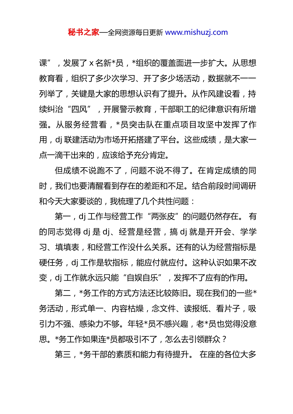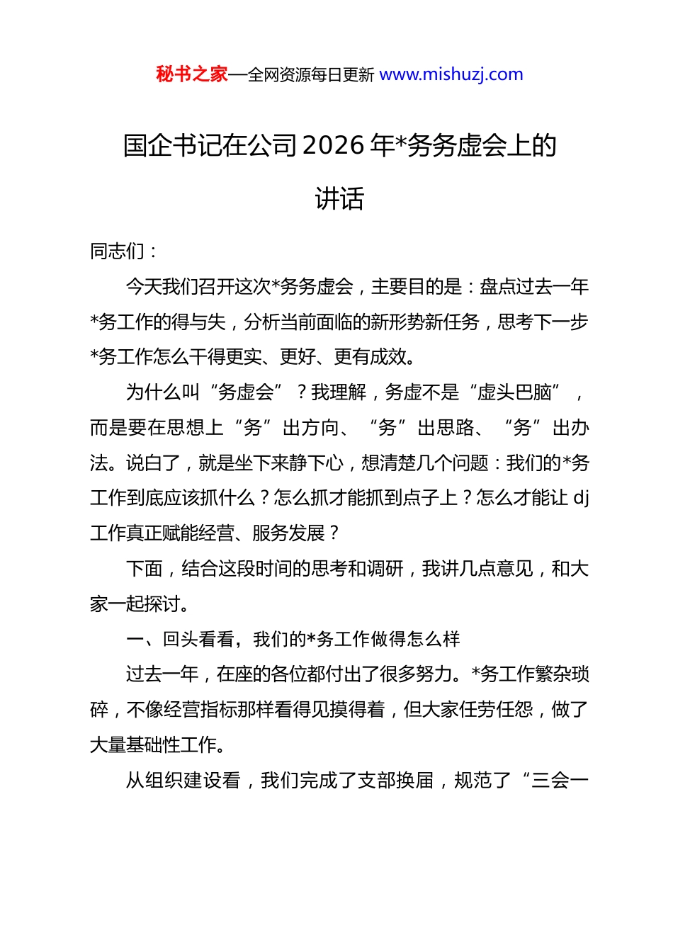 秘书之家—全网资源每日更新 www.mishuzj.com国企书记在公司 2026 年*务务虚会上的讲话同志们:今天我们召开这次*务务虚会,主要目的是:盘点过去一年*务工作的得与失,分析当前面临的新形势新任务,思考下一步*务工作怎么干得更实、更好、更有成效。为什么叫“务虚会”?我理解,务虚不是“虚头巴脑”,而是要在思想上“务”出方向、“务”出思路、“务”出办法。说白了,就是坐下来静下心,想清楚几个问题:我们的*务工作到底应该抓什么?怎么抓才能抓到点子上?怎么才能让 dj工作真正赋能经营、服务发展?下面,结合这段时间的思考和调研,我讲几点意见,和大家一起探讨。一、回头看看,我们的*务工作做得怎么样过去一年,在座的各位都付出了很多努力。*务工作繁杂琐碎,不像经营指标那样看得见摸得着,但大家任劳任怨,做了大量基础性工作。从组织建设看,我们完成了支部换届,规范了“三会一秘书之家—全网资源每日更新 www.mishuzj.com课”,发展了 x 名新*员,*组织的覆盖面进一步扩大。从思想教育看,组织了多少次学习、开了多少场活动,数据就不一一列举了,关键是大家的思想认识有了提升。从作风建设看,持续纠治“四风”,开展警示教育,干部职工的纪律意识有所增强。从服务经营看,*员突击队在重点项目攻坚中发挥了作用,dj 联建活动为市场开拓搭建了平台。这些成绩,是大家一点一滴干出来的,应该给予充分肯定。但成绩不说跑不了,问题不说不得了。在肯定成绩的同时,我们也要清醒看到存在的差距和不足。结合前段时间调研和今天大家要谈的,我梳理了几个共性问题:第一,dj 工作与经营工作“两张皮”的问题仍然存在。 有的同志觉得 dj 是 dj、经营是经营,搞 dj 就是开开会、学学习、填填表,和经营工作没什么关系。还有的认为经营指标是硬任务,dj 工作是软指标,能应付就应付。这种认识如果不改变,dj 工作就永远只能“自娱自乐”,发挥不了应有的作用。第二,*务工作的方式方法还比较陈旧。现在我们的一些*务活动,形式单一、内容枯燥,念文件、读报纸、看片子,吸引力不强、感染力不够。年轻*员不感兴趣,老*员也觉得没意思。*务工作如果连*员都吸引不了,怎么去引领群众?第三,*务干部的素质和能力有待提升。 在座的各位大多秘书之家—全网资源每日更新 www.mishuzj.com是兼职做*务,本身还有业务工作要忙。*务工作又是专业性很强的工作,不学习、不研究,就很难做好。有的同志对*务知识一知半解,开展工作没有章法;有的同志主动性不够,推一推动一动,不推不动。第四,dj 工作的实效性需要加强。 我们搞了这么多活动,花了这么多精力,到底对经营工作有没有促进?对职工群众有没有帮助?有没有形成一些可复制、可推广的经验?这些问题,恐怕还经不起深问。这些问题,有的是老问题,有的是新表现,都需要我们认真思考、切实解决。二、抬头看看,我们面临什么样的新形势*务工作不是孤立的,必须放在大局中去思考、去谋划。当前,我们面临什么样的形势?从宏观层面看,全面从严治*向纵深推进。*的二十大以来,*中央对 dj 工作提出了一系列新要求,强调要“把*的建设作为一项伟大工程来抓”,对我们的*务工作提出了更高标准。从行业层面看,建筑市场正在发生深刻变革。传统基建增速放缓,新兴领域门槛较高,同质化竞争愈演愈烈。企业要生存、要发展,必须转型升级、提质增效。这个过程中,dj 工作怎么发挥作用?怎么凝聚人心、鼓舞士气?怎么防范风险、守秘书之家—全网资源每日更新 www.mishuzj.com住底线?都是需要我们回答的课题。从我们自身看,正处于爬坡过坎的关键时期。今年经营任务重、压力大。越是在这样的时候,越需要强有力的 dj 工作来保障。人心散了,队伍就带不动;作风坏了,企业就要出问题。可以说,*务工作不是可有可无,而是不可或缺;不是负担,而是支撑。在座的各位,肩上的担子不轻。三、静心想,*务工作到底该怎么抓关于下一步的*务工作,我想从五个方面和大家交流一些想法。(一)抓思想引领,把人心聚起来思想是行动的先导。一个人思想不通,干什么都提不起劲;一群人思想不统一,干什么都形不成合力。一要抓...
