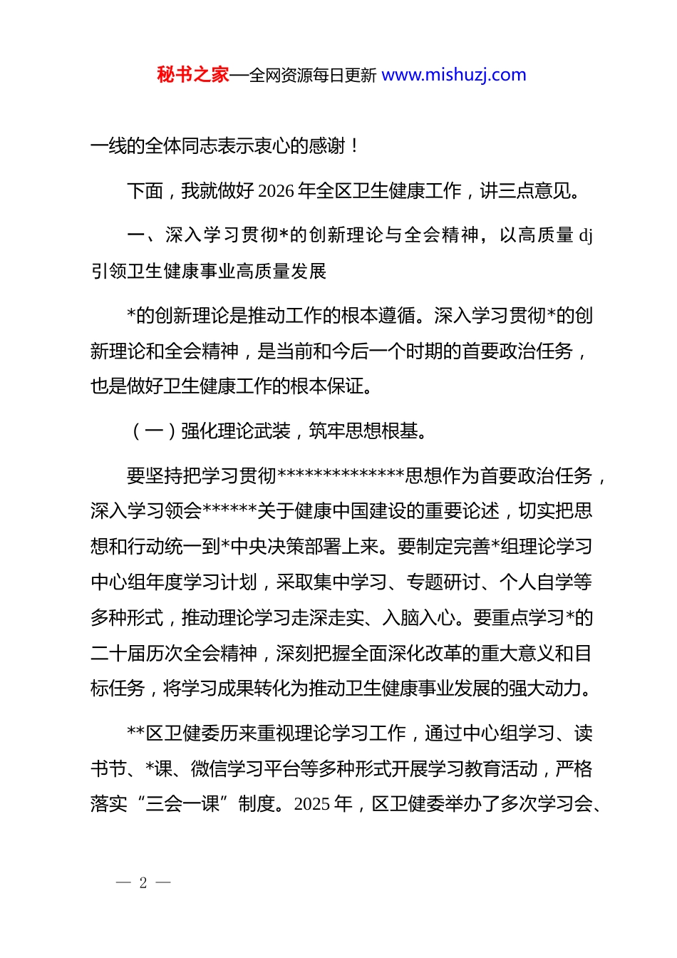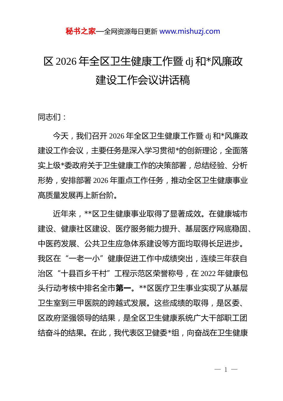 秘书之家—全网资源每日更新 www.mishuzj.com区 2026 年全区卫生健康工作暨 dj 和*风廉政建设工作会议讲话稿同志们:今天,我们召开 2026 年全区卫生健康工作暨 dj 和*风廉政建设工作会议,主要任务是深入学习贯彻*的创新理论,全面落实上级*委政府关于卫生健康工作的决策部署,总结经验、分析形势,安排部署 2026 年重点工作任务,推动全区卫生健康事业高质量发展再上新台阶。近年来,**区卫生健康事业取得了显著成效。在健康城市建设、健康社区建设、医疗服务能力提升、基层医疗网底稳固、中医药发展、公共卫生应急体系建设等方面均取得长足进步。我区在“一老一小”健康促进工作中成绩突出,连续三年获自治区“十县百乡千村”工程示范区荣誉称号,在 2022 年健康包头行动考核中排名全市第一。**区医疗卫生事业实现了从基层卫生室到三甲医院的跨越式发展。这些成绩的取得,是区委、区政府坚强领导的结果,是全区卫生健康系统广大干部职工团结奋斗的结果。在此,我代表区卫健委*组,向奋战在卫生健康— 1 —秘书之家—全网资源每日更新 www.mishuzj.com一线的全体同志表示衷心的感谢!下面,我就做好 2026 年全区卫生健康工作,讲三点意见。一、深入学习贯彻*的创新理论与全会精神,以高质量 dj引领卫生健康事业高质量发展*的创新理论是推动工作的根本遵循。深入学习贯彻*的创新理论和全会精神,是当前和今后一个时期的首要政治任务,也是做好卫生健康工作的根本保证。(一)强化理论武装,筑牢思想根基。要坚持把学习贯彻**************思想作为首要政治任务,深入学习领会******关于健康中国建设的重要论述,切实把思想和行动统一到*中央决策部署上来。要制定完善*组理论学习中心组年度学习计划,采取集中学习、专题研讨、个人自学等多种形式,推动理论学习走深走实、入脑入心。要重点学习*的二十届历次全会精神,深刻把握全面深化改革的重大意义和目标任务,将学习成果转化为推动卫生健康事业发展的强大动力。**区卫健委历来重视理论学习工作,通过中心组学习、读书节、*课、微信学习平台等多种形式开展学习教育活动,严格落实“三会一课”制度。2025 年,区卫健委举办了多次学习会、— 2 —秘书之家—全网资源每日更新 www.mishuzj.com读书班和特色讲堂,深入学习贯彻**************思想及***关于健康中国建设的重要论述。2026 年,我们要继续深化这一工作,确保理论学习常态化、制度化、规范化。(二)强化政治建设,压实主体责任。要坚持把*的政治建设摆在首位,全面落实新时代*的建设总要求,切实履行全面从严治*主体责任。要制定完善落实全面从严治*主体责任清单,明确责任分工,层层传导压力,形成齐抓共管的工作格局。要严格执行民主集中制、“三重一大”决策制度,严肃*内政治生活,营造风清气正的政治生态。要严格落实“一岗双责”,各级*组织书记要切实履行第一责任人职责,班子成员要抓好分管领域的*风廉政建设工作。要建立健全 dj 工作考核评价机制,将 dj 工作与业务工作同部署、同推进、同考核,推动 dj 工作与业务工作深度融合、相互促进。(三)强化作风建设,推进*风廉政建设。要持之以恒正风肃纪,严格落实中央八项规定及其实施细则精神,坚决纠治“四风”问题特别是形式主义、官僚主义。**区卫健委已上线“医药领域廉洁教育”专栏,深入开展廉洁自律教育,持续开展警示教育和廉政教育活动。要深化“清廉医— 3 —秘书之家—全网资源每日更新 www.mishuzj.com院”建设,推进廉洁文化进医院、进科室、进病房,营造崇廉尚洁的良好氛围。要将学习教育与*风廉政建设和反腐败斗争、卫生健康重点工作紧密结合,力戒形式主义。要加强对重点领域、关键环节的监督执纪,规范医药采购、项目建设、人事管理等重点工作流程,坚决整治群众身边的不正之风和腐败问题,以严明的纪律保障卫生健康事业健康发展。(四)强化队伍建设,激发干事创业活力。要坚持*管干部、*管人才原则,大力实施“聚才引智”工程,加强高层次人才和急需紧缺人才引进培养工作。要完善干部选拔任用机制,注重在疫情防控、医疗服务、基层一线等工作中考察识别干部...