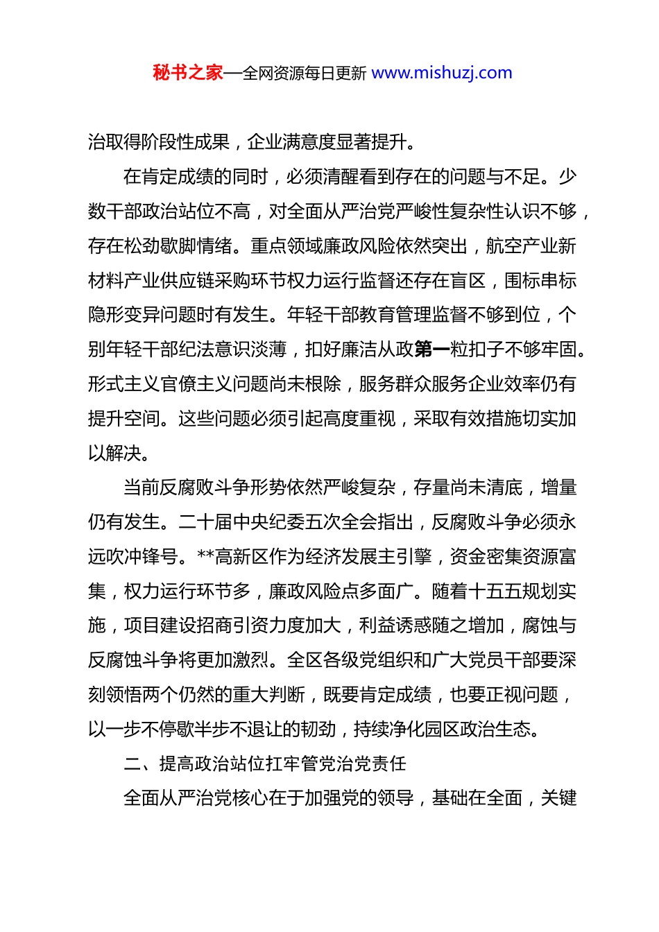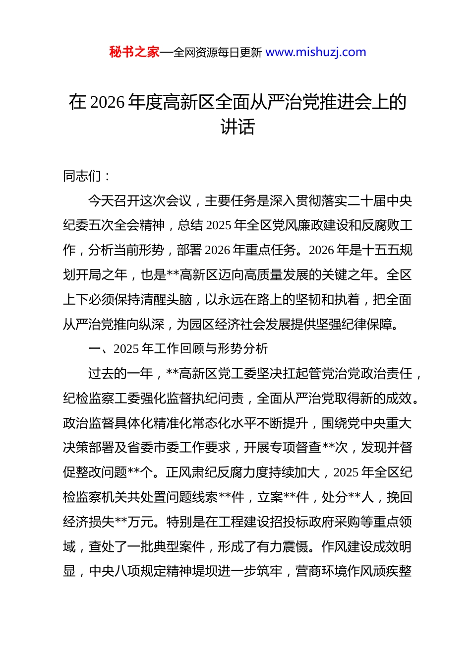 秘书之家—全网资源每日更新 www.mishuzj.com在 2026 年度高新区全面从严治党推进会上的讲话 同志们:今天召开这次会议,主要任务是深入贯彻落实二十届中央纪委五次全会精神,总结 2025 年全区党风廉政建设和反腐败工作,分析当前形势,部署 2026 年重点任务。2026 年是十五五规划开局之年,也是**高新区迈向高质量发展的关键之年。全区上下必须保持清醒头脑,以永远在路上的坚韧和执着,把全面从严治党推向纵深,为园区经济社会发展提供坚强纪律保障。一、2025 年工作回顾与形势分析过去的一年,**高新区党工委坚决扛起管党治党政治责任,纪检监察工委强化监督执纪问责,全面从严治党取得新的成效。政治监督具体化精准化常态化水平不断提升,围绕党中央重大决策部署及省委市委工作要求,开展专项督查**次,发现并督促整改问题**个。正风肃纪反腐力度持续加大,2025 年全区纪检监察机关共处置问题线索**件,立案**件,处分**人,挽回经济损失**万元。特别是在工程建设招投标政府采购等重点领域,查处了一批典型案件,形成了有力震慑。作风建设成效明显,中央八项规定精神堤坝进一步筑牢,营商环境作风顽疾整秘书之家—全网资源每日更新 www.mishuzj.com治取得阶段性成果,企业满意度显著提升。在肯定成绩的同时,必须清醒看到存在的问题与不足。少数干部政治站位不高,对全面从严治党严峻性复杂性认识不够,存在松劲歇脚情绪。重点领域廉政风险依然突出,航空产业新材料产业供应链采购环节权力运行监督还存在盲区,围标串标隐形变异问题时有发生。年轻干部教育管理监督不够到位,个别年轻干部纪法意识淡薄,扣好廉洁从政第一粒扣子不够牢固。形式主义官僚主义问题尚未根除,服务群众服务企业效率仍有提升空间。这些问题必须引起高度重视,采取有效措施切实加以解决。当前反腐败斗争形势依然严峻复杂,存量尚未清底,增量仍有发生。二十届中央纪委五次全会指出,反腐败斗争必须永远吹冲锋号。**高新区作为经济发展主引擎,资金密集资源富集,权力运行环节多,廉政风险点多面广。随着十五五规划实施,项目建设招商引资力度加大,利益诱惑随之增加,腐蚀与反腐蚀斗争将更加激烈。全区各级党组织和广大党员干部要深刻领悟两个仍然的重大判断,既要肯定成绩,也要正视问题,以一步不停歇半步不退让的韧劲,持续净化园区政治生态。二、提高政治站位扛牢管党治党责任全面从严治党核心在于加强党的领导,基础在全面,关键秘书之家—全网资源每日更新 www.mishuzj.com在严,要害在治。各级领导干部要不断提高政治判断力政治领悟力政治执行力,把讲政治贯穿于工作全过程。要强化政治忠诚。始终把党的政治建设摆在首位,坚定拥护两个确立,坚决做到两个维护。严格执行新形势下党内政治生活若干准则,认真落实三会一课民主生活会组织生活会等制度,增强党内政治生活政治性时代性原则性战斗性。要把学习贯彻二十届中央纪委五次全会精神作为当前重要政治任务,与学习贯彻党的二十大精神结合起来,与推动园区中心工作结合起来,确保党中央决策部署在**高新区落地生根。要扛牢政治责任。党工委要切实履行主体责任,书记要履行好第一责任人职责,班子成员要履行好一岗双责。要把党风廉政建设与业务工作同谋划同部署同推进同考核,防止两张皮。区党群工作部综合管理局投资促进局科技发展局合盛公司等部门单位要聚焦第一责任人责任及行业领域风险防控,亮承诺明举措,确保责任落实到位。纪检监察工委要履行好监督责任,强化对一把手和领导班子监督,推动各类监督贯通协调,形成监督合力。要树立正确政绩观。引导干部把精力投向招商引资项目建设新质生产力发展等中心工作。十五五时期是**高新区产业发展的关键期,航空产业新材料产业新能源产业需要大量资源投秘书之家—全网资源每日更新 www.mishuzj.com入。干部要树立正确的权力观政绩观事业观,既要做显功,也要做潜功,切忌急功近利搞形象工程政绩工程。要以开局就是决战起步就要冲刺的状态担当作为,在推动高质量发展中展现新作为。三、聚焦关键环节健全权力运行监督体系权力运行到哪里,监督就要跟进到哪里。要紧盯工程建设招投标政...