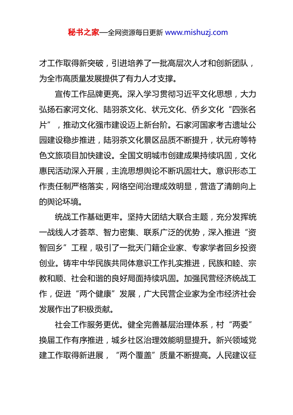 秘书之家—全网资源每日更新 www.mishuzj.com在 2026 年度全市党建工作会议上的讲话 同志们:今天会议以“四会合一”形式召开,对 2026 年组织、宣传、统战、社会工作进行集中部署,充分体现了市委对党建工作的高度重视,也体现了精简会议、务实高效的工作作风。刚才,会议宣读了 2025 年度组织、宣传、统战、社会工作表扬通报,相关先进单位和个人受到了表彰。在此,向受到表扬的单位和个人表示热烈祝贺。下面,就做好今年全市党建工作,讲几点意见。一、充分肯定过去一年党建工作取得的新成效2025 年,全市各级党组织坚持以习近平新时代中国特色社会主义思想为指导,认真贯彻落实党中央决策部署和省委工作要求,围绕中心、服务大局,推动党建工作取得显著成效。组织工作活力更足。深入开展“干部素质提升年”活动,创新构建“3+17+N”特色培训体系,全年举办理论与业务培训班 41 个,市级业务培训 21 场次,覆盖干部 6000 人次。扎实开展定制培训 30 余期,2000 余名干部参与其中,干部队伍政治素质和专业能力得到全面提升。高质量推进村“两委”换届工作,选优配强基层班子,基层党组织战斗堡垒作用进一步增强。人秘书之家—全网资源每日更新 www.mishuzj.com才工作取得新突破,引进培养了一批高层次人才和创新团队,为全市高质量发展提供了有力人才支撑。宣传工作品牌更亮。深入学习贯彻习近平文化思想,大力弘扬石家河文化、陆羽茶文化、状元文化、侨乡文化“四张名片”,推动文化强市建设迈上新台阶。石家河国家考古遗址公园建设稳步推进,陆羽茶文化景区品质不断提升,状元府等特色文旅项目加快建设。全国文明城市创建成果持续巩固,文化惠民活动深入开展,主流思想舆论不断巩固壮大。意识形态工作责任制严格落实,网络空间治理成效明显,营造了清朗向上的舆论环境。统战工作基础更牢。坚持大团结大联合主题,充分发挥统一战线人才荟萃、智力密集、联系广泛的优势,深入推进“资智回乡”工程,吸引了一批天门籍企业家、专家学者回乡投资创业。铸牢中华民族共同体意识工作扎实推进,民族和睦、宗教和顺、社会和谐的良好局面持续巩固。加强民营经济统战工作,促进“两个健康”发展,广大民营企业家为全市经济社会发展作出了积极贡献。社会工作服务更优。健全完善基层治理体系,村“两委”换届工作有序推进,城乡社区治理效能明显提升。新兴领域党建工作取得新进展,“两个覆盖”质量不断提高。人民建议征秘书之家—全网资源每日更新 www.mishuzj.com集办理工作深入开展,信访难题化解力度加大,志愿服务事业蓬勃发展,社会工作专业人员队伍不断壮大,为基层治理注入了新的活力。这些成绩的取得,是全市各级党组织和广大党员干部真抓实干、团结奋斗的结果,为**跨越赶超发展提供了坚强的组织保障、良好的舆论环境和广泛的力量支持。二、深刻认识做好今年党建工作的重大意义2026 年是“十五五”开局之年,是全面建设社会主义现代化国家、向第二个百年奋斗目标进军的关键之年,也是**加快建成新时代侨乡的奋进之年。抓好今年党建工作,意义重大、责任重大。要从政治高度认识党建工作。党的十八大以来,习近平总书记围绕建设什么样的长期执政的马克思主义政党、怎样建设长期执政的马克思主义政党这一重大时代课题,提出了一系列新理念新思想新战略,形成了习近平总书记关于党的建设的重要思想,为深入推进新时代党的建设新的伟大工程提供了根本遵循。要深刻领悟“两个确立”的决定性意义,增强“四个意识”、坚定“四个自信”、做到“两个维护”,不断提高政治判断力、政治领悟力、政治执行力,确保党建工作始终沿着正确方向前进。秘书之家—全网资源每日更新 www.mishuzj.com要从发展全局把握党建工作。当前,**正处于战略机遇叠加期、政策红利释放期、蓄势跃升突破期,“五期叠加”的发展机遇前所未有。“十五五”时期,全市上下将聚焦高质量发展首要任务,明确产业发展方向和路径,推动经济社会实现跨越式发展。实现这些目标,必须充分发挥党建工作的引领保障作用,把党的政治优势、组织优势转化为发展优势、治理效能,以高质量党建引领保障高质量发展。...