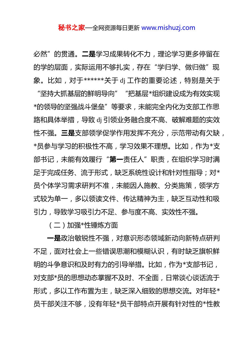 秘书之家—全网资源每日更新 www.mishuzj.com(28 篇)2025 年度组织生活会对照检查材料汇编(含支部班子、书记、委员、*员对照检查)区直机关工委*支部书记 2025 年度组织生活会个人对照检查材料根据区直机关工委关于开好 2025 年度组织生活会的相关通知要求,本人紧扣会议主题,聚焦“学习贯彻*的二十大精神、落实新时代*的建设总要求”主线,在深入学习*的创新理论、广泛征求意见建议、扎实开展谈心谈话的基础上,紧密联系个人思想、学习和工作实际,重点围绕规定内容,深入查摆自身存在的差距和不足,深刻剖析问题根源,明确了今后的努力方向和改进措施。现将个人对照检查情况报告如下。一、存在的突出问题(一)学习贯彻*的创新理论方面一是政治理论学习广度和深度不够,存在实用主义倾向,缺乏全面深入的研究,学习效果不理想。比如,组织支部学习,虽然严格落实“第一议题”制度,但多是通过读文件、学原著等方式,结合学习内容联系实际工作不够紧密,未能有效引导*员从理论中找方向、找方法、找答案,导致学习成果停留在“知其然”层面,尚未完全实现“知其所以然”与“知其所以秘书之家—全网资源每日更新 www.mishuzj.com必然”的贯通。二是学习成果转化不力,理论学习更多停留在的学的层面,实际运用不够扎实,存在“学归学、做归做”现象。比如,对于******关于 dj 工作的重要论述,特别是关于“坚持大抓基层的鲜明导向”“把基层*组织建设成为有效实现*的领导的坚强战斗堡垒”等要求,未能完全内化为支部工作思路和具体举措,导致 dj 引领业务融合度不高、破解难题的实效性不强。三是支部领学促学作用发挥不充分,示范带动有欠缺,*员参与学习的积极性不高,学习效果不理想。比如,作为*支部书记,未能有效履行“第一责任人”职责,在组织学习时满足于完成任务、流于形式,缺乏系统性设计和针对性指导;对*员个体学习需求研判不准,未能因人施教、分类施策,领学方式较为单一,多以领读文件、传达精神为主,缺乏互动性和吸引力,导致学习吸引力不足、参与度不高、实效性不强。(二)加强*性锤炼方面一是政治敏锐性不强,对意识形态领域新动向新特点研判不足,面对社会上一些错误思潮和模糊认识,有时缺乏旗帜鲜明的斗争意识和及时有力的引导举措。比如,作为*支部书记,对支部*员的思想动态掌握不及时、不全面,日常谈心谈话流于形式,多以工作布置为主,缺乏深入细致的思想交流。对年轻*员干部关注不够,没有年轻*员干部特点开展有针对性的*性教秘书之家—全网资源每日更新 www.mishuzj.com育,部分年轻*员干部政治意识不强,思想觉悟不高。二是带头加强*性锤炼不够自觉主动,存在“重业务轻*性”倾向,未能始终以高标准严要求检视自身言行。比如,在落实“三会一课”、组织生活会等制度时,有时强调程序合规多于政治淬炼,批评与自我批评“辣味”不足,对自身存在的标准不高、要求不严等问题剖析不深。在组织开展支部主题*日活动时,存在重形式轻实效、重过程轻效果倾向,活动内容与业务工作结合不紧,未能有效发挥锤炼*性、凝聚共识、推动落实的综合功能。三是在发展*员方面把关不严,对入*积极分子的培养考察不够深入,政治审查存在“重材料轻实绩、重程序轻思想”倾向。比如,在近期发展的一名入*积极分子培养过程中,有个别入*积极分子长期未提交思想汇报,支部未能及时提醒督促,也未深入分析其思想动态变化原因;对入*积极分子日常表现的跟踪考察多停留在工作业绩层面,对其在重大考验面前的政治立场、价值取向和现实表现缺乏常态化观察与纪实,政治把关的穿透力和实效性有待提升。(三)联系服务群众方面一是组织*员志愿服务活动覆盖面不广、频次不高、实效不强,存在“为活动而活动”倾向。比如,根据*支部工作计划,每季度至少开展一次*员志愿服务活动,实际执行过程中,由于秘书之家—全网资源每日更新 www.mishuzj.com过多考虑会影响业务进度、协调资源难度大等因素,*员参与率偏低、活动形式单一,实际效果不明显。二是落实双报到双服务制度有偏差,部分*员未能真正沉入社区、融入群众,存在形式主义倾向。比如,部分*员到社区报到后仅完...