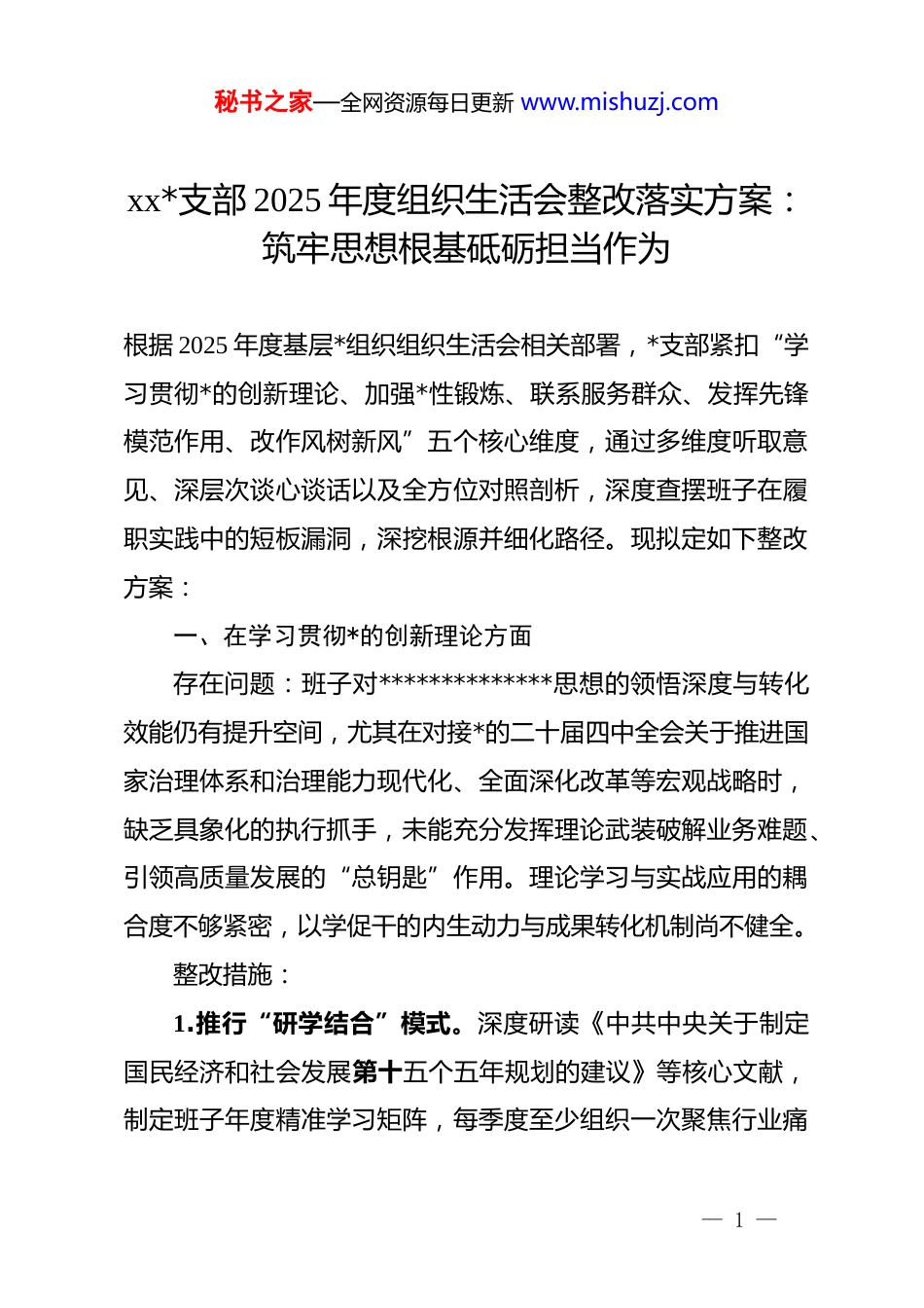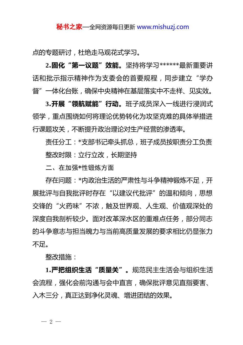 秘书之家—全网资源每日更新 www.mishuzj.comxx*支部 2025 年度组织生活会整改落实方案:筑牢思想根基砥砺担当作为根据 2025 年度基层*组织组织生活会相关部署,*支部紧扣“学习贯彻*的创新理论、加强*性锻炼、联系服务群众、发挥先锋模范作用、改作风树新风”五个核心维度,通过多维度听取意见、深层次谈心谈话以及全方位对照剖析,深度查摆班子在履职实践中的短板漏洞,深挖根源并细化路径。现拟定如下整改方案:一、在学习贯彻*的创新理论方面存在问题:班子对**************思想的领悟深度与转化效能仍有提升空间,尤其在对接*的二十届四中全会关于推进国家治理体系和治理能力现代化、全面深化改革等宏观战略时,缺乏具象化的执行抓手,未能充分发挥理论武装破解业务难题、引领高质量发展的“总钥匙”作用。理论学习与实战应用的耦合度不够紧密,以学促干的内生动力与成果转化机制尚不健全。整改措施:1.推行“研学结合”模式。深度研读《中共中央关于制定国民经济和社会发展第十五个五年规划的建议》等核心文献,制定班子年度精准学习矩阵,每季度至少组织一次聚焦行业痛— 1 —秘书之家—全网资源每日更新 www.mishuzj.com点的专题研讨,杜绝走马观花式学习。2.固化“第一议题”效能。坚持将学习******最新重要讲话和批示指示精神作为支委会的首要规程,同步建立“学办督”一体化台账,确保中央精神在基层落实中不走样、见实效。3.开展“领航赋能”行动。班子成员深入一线进行浸润式领学,重点围绕如何将理论优势转化为攻坚克难的具体举措进行课题攻关,不断提升政治理论对生产经营的渗透率。责任分工:*支部书记牵头抓总,班子成员按职责分工负责整改时限:立行立改,长期坚持二、在加强*性锻炼方面存在问题:*内政治生活的严肃性与斗争精神锻炼不足,开展批评与自我批评时存在“以建议代批评”的温和倾向,思想交锋的“火药味”不浓,触及世界观、人生观、价值观深处的深度自我剖析较少。面对改革深水区的重难点任务,部分同志的斗争意志与担当魄力与当前高质量发展的要求相比仍显张力不足。整改措施:1.严把组织生活“质量关”。规范民主生活会与组织生活会流程,强化会前沟通与会中直言,确保批评意见直指要害、入木三分,真正达到净化灵魂、增进团结的效果。— 2 —秘书之家—全网资源每日更新 www.mishuzj.com2.增强政治教育“仪式感”。每半年依托红色教育基地开展一次沉浸式*性教育,通过集体过“政治生日”、宣誓承诺等形式,常态化淬炼*性魂魄,稳固信仰根基。3.完善履职表现“评价表”。建立支委成员素质档案,将应对突发事件、落实廉洁自律及践行宗旨意识的表现作为考评关键指标,作为班子成员选拔使用的重要依据。责任分工:*支部书记履行第一责任人职责,纪检委员协同监督整改时限:2026 年 6 月底前取得阶段性成果,持续推进三、在联系服务群众方面存在问题:班子成员深入基层进行“解剖麻雀”式调研的覆盖面不够广,感知职工急难愁盼问题的触角不够灵敏,解决基层痛点难题的反应速度与精准度仍有温差。群众意见的闭环处理链路存在梗阻,部分反馈事项办理周期较长,导致职工群众的获得感与满意度未能达到理想状态。整改措施:1.深化“全员挂钩”机制。落实支委班组联系制,每位成员对口联系基层单元,每月至少开展一次蹲点式调研,确保决策声音直达底层、基层诉求直通班子。2.打造“民生响应”闭环。整合线上反馈渠道与线下服务— 3 —秘书之家—全网资源每日更新 www.mishuzj.com窗口,明晰诉求登记、分办、销号的全流程标准,承诺办结时限,确保基层反映的每一件事都有着落。3.构建“共商共建”载体。定期邀请职工代表列席支委扩大会,围绕岗位待遇、职业成长、工作环境等热点议题开展面对面协商,提升民主参与度和决策科学性。责任分工:组织委员具体协调,全体班子成员协同执行整改时限:2026 年 3 月底前完成机制迭代并全面运行四、在发挥先锋模范作用方面存在问题:班子在牵头破解业务壁垒时的“头雁效应”不够显著,面对产业转型或技术革新中的挑战,主动跨前、协同攻坚的锐气有所退化。*员责任区、先锋岗等活动载体的实效性下降...