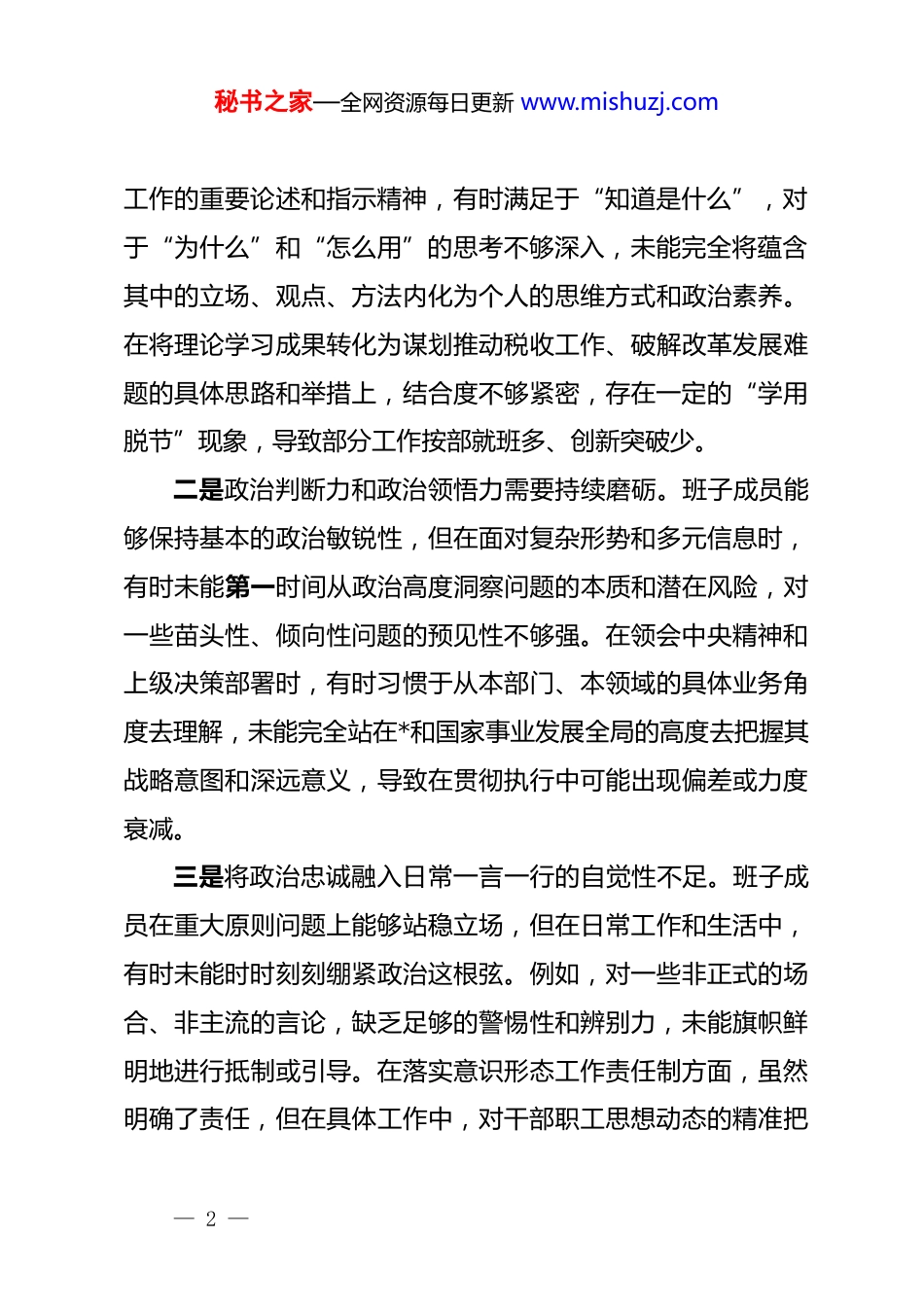 秘书之家—全网资源每日更新 www.mishuzj.comxx 市税务局机关*支部班子 2025 年组织生活会对照检查材料根据市局*委关于召开 2025 年度组织生活会的统一部署和要求,本支部班子紧扣会议主题,在深入开展学习研讨、广泛征求意见建议、普遍进行谈心谈话的基础上,紧密联系支部班子思想和工作实际,对照“带头强化政治忠诚,提高政治能力”、“带头固本培元,增强*性”、“带头敬畏人民、敬畏组织、敬畏法纪”、“带头干事创业,担当作为”、“带头坚决扛起管*治*责任”等五个方面,深入查摆了存在的突出问题,深刻剖析了问题产生的根源,明确了今后努力方向和整改措施。现将对照检查情况报告如下:一、存在的主要问题(一)在带头强化政治忠诚,提高政治能力方面支部班子能够自觉在思想上政治上行动上同*中央保持高度一致,坚决维护*中央权威和集中统一领导。但对照更高标准、更严要求,仍存在一些差距和不足:一是政治理论学习的深度和转化效率有待提升。班子成员虽然能够按时参加集体学习,完成规定篇目的学习,但在学深悟透、融会贯通上还欠火候。对*的创新理论,特别是关于税收— 1 —秘书之家—全网资源每日更新 www.mishuzj.com工作的重要论述和指示精神,有时满足于“知道是什么”,对于“为什么”和“怎么用”的思考不够深入,未能完全将蕴含其中的立场、观点、方法内化为个人的思维方式和政治素养。在将理论学习成果转化为谋划推动税收工作、破解改革发展难题的具体思路和举措上,结合度不够紧密,存在一定的“学用脱节”现象,导致部分工作按部就班多、创新突破少。二是政治判断力和政治领悟力需要持续磨砺。班子成员能够保持基本的政治敏锐性,但在面对复杂形势和多元信息时,有时未能第一时间从政治高度洞察问题的本质和潜在风险,对一些苗头性、倾向性问题的预见性不够强。在领会中央精神和上级决策部署时,有时习惯于从本部门、本领域的具体业务角度去理解,未能完全站在*和国家事业发展全局的高度去把握其战略意图和深远意义,导致在贯彻执行中可能出现偏差或力度衰减。三是将政治忠诚融入日常一言一行的自觉性不足。班子成员在重大原则问题上能够站稳立场,但在日常工作和生活中,有时未能时时刻刻绷紧政治这根弦。例如,对一些非正式的场合、非主流的言论,缺乏足够的警惕性和辨别力,未能旗帜鲜明地进行抵制或引导。在落实意识形态工作责任制方面,虽然明确了责任,但在具体工作中,对干部职工思想动态的精准把— 2 —秘书之家—全网资源每日更新 www.mishuzj.com握和有效引导还不够到位,未能完全做到润物细无声地将政治要求融入日常管理。(二)在带头固本培元,增强*性方面支部班子能够重视*性修养,努力锤炼坚强*性。但对照*章*规和先进典型,仍存在以下不足:一是理想信念教育的实效性有待增强。在组织开展*性教育活动时,有时形式相对单一,满足于开会、听报告、参观红色基地,缺乏更具感染力、针对性的教育载体和方法。对如何引导*员干部将理想信念内化于心、外化于行,触动思想灵魂深处,思考和实践不够深入。个别班子成员在面对繁重工作压力或遇到挫折时,偶尔会产生思想上的波动,需要不断加强自我修炼,拧紧世界观、人生观、价值观这个“总开关”。二是宗旨意识践行不够彻底。班子成员能够牢记为人民服务的宗旨,但在实际工作中,有时“以人民为中心”的发展思想树得不够牢固。例如,在制定税收政策落实措施或优化纳税服务流程时,更多地是从便于管理的角度出发,对纳税人、缴费人的实际感受和潜在需求调研不够充分、考虑不够周全。深入基层一线调研的次数和深度有待加强,与群众面对面交流、心贴心沟通不够经常,对群众反映的“急难愁盼”问题,有时解决不够及时、不够彻底。— 3 —秘书之家—全网资源每日更新 www.mishuzj.com三是*内政治生活的政治性、时代性、原则性、战斗性有待强化。支部组织生活虽然能够正常开展,但有时存在“好人主义”倾向,批评与自我批评不够大胆、不够直接。自我批评时,谈工作问题多、谈思想根源少;相互批评时,提希望建议多、点实质问题少,辣味不足,未能真正起到红脸出汗、排毒治病的效果。在运用批评...