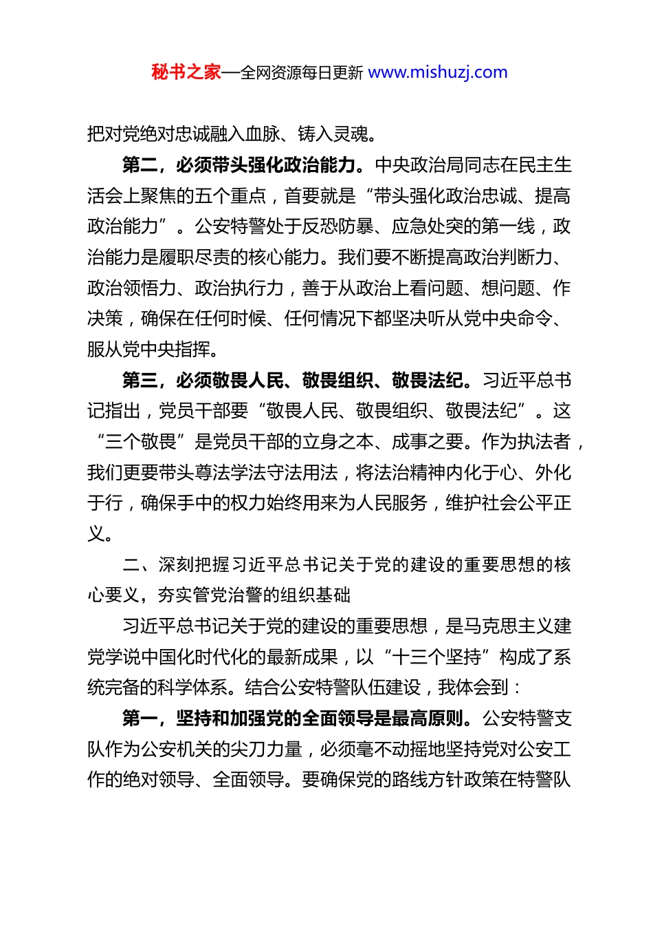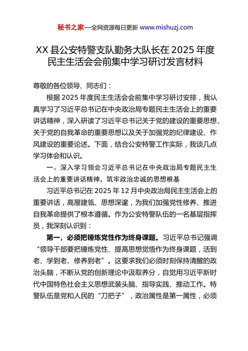 秘书之家—全网资源每日更新 www.mishuzj.comXX 县公安特警支队勤务大队长在 2025 年度民主生活会会前集中学习研讨发言材料尊敬的各位领导、同志们:根据 2025 年度民主生活会会前集中学习研讨安排,我认真学习了习近平总书记在中央政治局专题民主生活会上的重要讲话精神,深入研读了习近平总书记关于党的建设的重要思想、关于党的自我革命的重要思想以及关于加强党的纪律建设、作风建设的重要论述。下面,结合公安特警工作实际,我谈几点学习体会和认识。一、深入学习领会习近平总书记在中央政治局专题民主生活会上的重要讲话精神,筑牢政治忠诚的思想根基习近平总书记在 2025 年 12 月中央政治局民主生活会上的重要讲话,高屋建瓴、思想深邃,为我们加强党性修养、推进自我革命提供了根本遵循。作为公安特警队伍的一名基层指挥员,我深刻认识到:第一,必须把锤炼党性作为终身课题。习近平总书记强调“领导干部要把锤炼党性、提高思想觉悟作为终身课题,活到老、学到老、修养到老”。这要求我们必须时刻保持清醒的政治头脑,不断从党的创新理论中汲取养分,自觉用习近平新时代中国特色社会主义思想武装头脑、指导实践、推动工作。特警队伍是党和人民的“刀把子”,政治属性是第一属性,必须秘书之家—全网资源每日更新 www.mishuzj.com把对党绝对忠诚融入血脉、铸入灵魂。第二,必须带头强化政治能力。中央政治局同志在民主生活会上聚焦的五个重点,首要就是“带头强化政治忠诚、提高政治能力”。公安特警处于反恐防暴、应急处突的第一线,政治能力是履职尽责的核心能力。我们要不断提高政治判断力、政治领悟力、政治执行力,善于从政治上看问题、想问题、作决策,确保在任何时候、任何情况下都坚决听从党中央命令、服从党中央指挥。第三,必须敬畏人民、敬畏组织、敬畏法纪。习近平总书记指出,党员干部要“敬畏人民、敬畏组织、敬畏法纪”。这“三个敬畏”是党员干部的立身之本、成事之要。作为执法者,我们更要带头尊法学法守法用法,将法治精神内化于心、外化于行,确保手中的权力始终用来为人民服务,维护社会公平正义。二、深刻把握习近平总书记关于党的建设的重要思想的核心要义,夯实管党治警的组织基础习近平总书记关于党的建设的重要思想,是马克思主义建党学说中国化时代化的最新成果,以“十三个坚持”构成了系统完备的科学体系。结合公安特警队伍建设,我体会到:第一,坚持和加强党的全面领导是最高原则。公安特警支队作为公安机关的尖刀力量,必须毫不动摇地坚持党对公安工作的绝对领导、全面领导。要确保党的路线方针政策在特警队秘书之家—全网资源每日更新 www.mishuzj.com伍中得到不折不扣的贯彻执行,将党的领导贯穿于勤务指挥、训练管理、队伍建设全过程,确保这支队伍绝对忠诚、绝对纯洁、绝对可靠。第二,坚持严密党的组织体系是关键支撑。党的力量来自组织。勤务大队作为基层战斗单元,必须把党支部建设成为坚强的战斗堡垒。要严格落实“三会一课”、组织生活会、民主评议党员等制度,增强党内政治生活的政治性、时代性、原则性、战斗性,充分发挥党员在急难险重任务中的先锋模范作用。第三,坚持造就忠诚干净担当的高素质干部队伍是重要保障。公安特警任务特殊、责任重大,对干部队伍的素质要求更高。必须坚持新时代好干部标准,突出政治标准,注重在实战中考察识别干部,把那些政治过硬、本领高强、作风优良的干部选出来、用起来,打造一支让党放心、人民满意的高素质专业化特警铁军。三、全面贯彻习近平总书记关于党的自我革命的重要思想的实践要求,永葆公安特警的生机活力习近平总书记关于党的自我革命的重要思想,系统回答了我们党为什么要自我革命、为什么能自我革命、怎样推进自我革命等重大问题,明确了“九个以”的实践要求。对于公安特警队伍而言:第一,自我革命是跳出历史周期率的第二个答案,也是队伍永葆战斗力的根本途径。特警队伍并非生活在真空之中,也秘书之家—全网资源每日更新 www.mishuzj.com会面临各种风险和考验。只有勇于自我革命,才能及时清除思想尘埃、作风积弊,有效抵御“糖衣炮弹”的侵蚀,确保队伍肌体健...