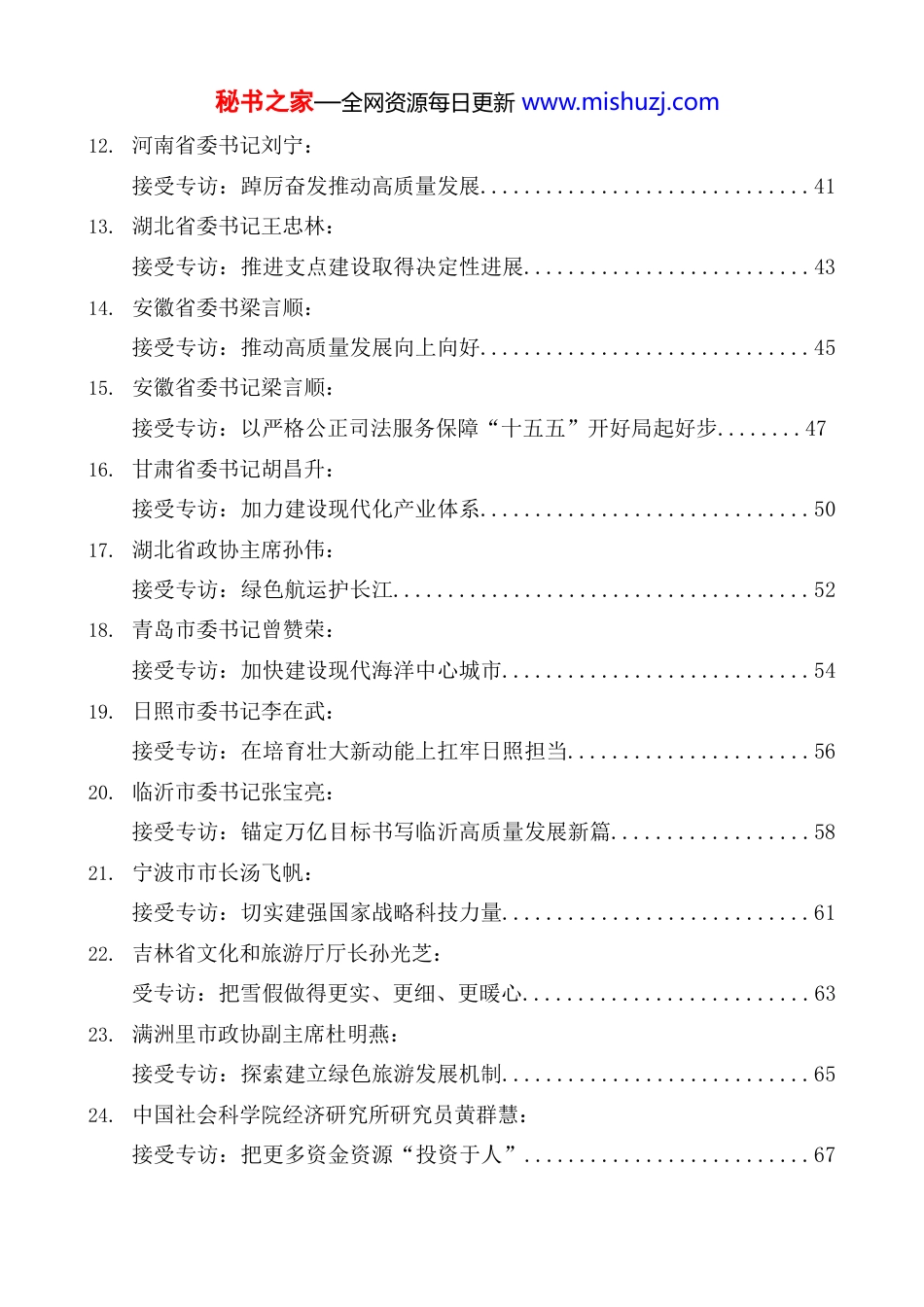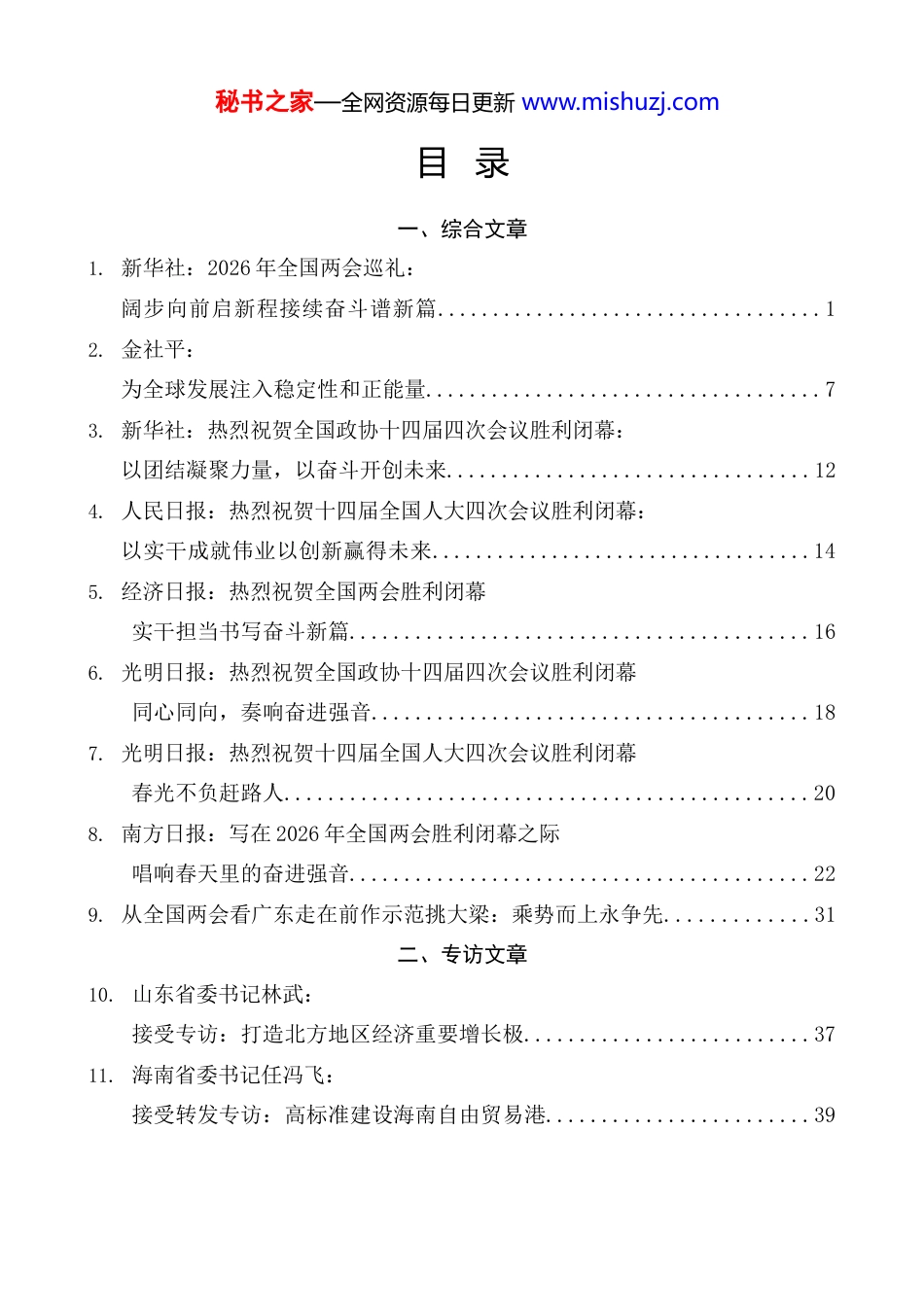 秘书之家—全网资源每日更新 www.mishuzj.com目 录一、综合文章1. 新华社:2026 年全国两会巡礼: 阔步向前启新程接续奋斗谱新篇...................................1 2. 金社平: 为全球发展注入稳定性和正能量....................................7 3. 新华社:热烈祝贺全国政协十四届四次会议胜利闭幕: 以团结凝聚力量,以奋斗开创未来.................................12 4. 人民日报:热烈祝贺十四届全国人大四次会议胜利闭幕: 以实干成就伟业以创新赢得未来...................................14 5. 经济日报:热烈祝贺全国两会胜利闭幕 实干担当书写奋斗新篇..........................................16 6. 光明日报:热烈祝贺全国政协十四届四次会议胜利闭幕 同心同向,奏响奋进强音........................................18 7. 光明日报:热烈祝贺十四届全国人大四次会议胜利闭幕 春光不负赶路人................................................20 8. 南方日报:写在 2026 年全国两会胜利闭幕之际 唱响春天里的奋进强音..........................................22 9. 从全国两会看广东走在前作示范挑大梁:乘势而上永争先.............31 二、专访文章10. 山东省委书记林武: 接受专访:打造北方地区经济重要增长极..........................37 11. 海南省委书记任冯飞: 接受转发专访:高标准建设海南自由贸易港........................39 秘书之家—全网资源每日更新 www.mishuzj.com12. 河南省委书记刘宁: 接受专访:踔厉奋发推动高质量发展..............................41 13. 湖北省委书记王忠林: 接受专访:推进支点建设取得决定性进展..........................43 14. 安徽省委书梁言顺: 接受专访:推动高质量发展向上向好..............................45 15. 安徽省委书记梁言顺: 接受专访:以严格公正司法服务保障“十五五”开好局起好步........47 16. 甘肃省委书记胡昌升: 接受专访:加力建设现代化产业体系..............................50 17. 湖北省政协主席孙伟: 接受专访:绿色航运护长江......................................52 18. 青岛市委书记曾赞荣: 接受专访:加快建设现代海洋中心城市............................54 19. 日照市委书记李在武: 接受专访:在培育壮大新动能上扛牢日照担当......................56 20. 临沂市委书记张宝亮: 接受专访:锚定万亿目标书写临沂高质量发展新篇..................58 21. 宁波市市长汤飞帆: 接受专访:切实建强国家战略科技力量............................61 22. 吉林省文化和旅游厅厅长孙光芝: 受专访:把雪假做得更实、更细、更暖心..........................63 23. 满洲里市政协副主席杜明燕: 接受专访:探索建立绿色旅游发展机制............................65 24. 中国社会科学院经济研究所研究员黄群慧: 接受专访:把更多资金资源“投资于人”..........................67 秘书之家—全网资源每日更新 www.mishuzj.com25. 上海航天信息科技研究院院长伍爱群: 接受专访:五大维度助力低空经济“飞出效益”....................69 26. 接受专访:以高水平安全锻造发展韧性............................71 27. 福建师范大学校长郑家建: 接受专访:坚守教育初心助力区域发展............................74 28. 中国药科大学校长郝海平: 接受专访:提升原创能力培养复合人才............................76 29. 中山大学校长高松: 接受专访:系统发力营造高教优质生态............................78 30. 江西农业大学副校长刘木华: 接受专访:心系乡村振兴积极履职尽责............................80 31. 河南大学校长张锁江: 接受专访:扎根中原大地办好一流大学............................82 32. 南昌大学校长陈晔光: 接受专访:一体谋划构建育人“三个协同”........................84 三、其他文章33. “好房子”建设进入新阶段....