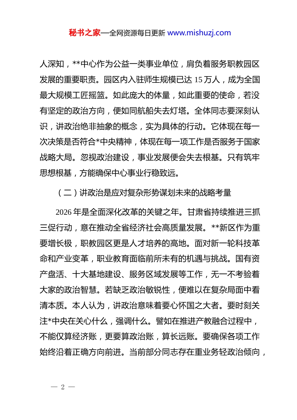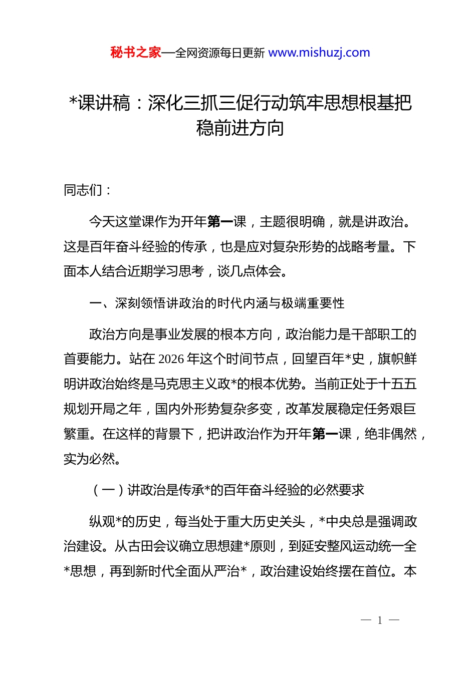 秘书之家—全网资源每日更新 www.mishuzj.com*课讲稿:深化三抓三促行动筑牢思想根基把稳前进方向同志们:今天这堂课作为开年第一课,主题很明确,就是讲政治。这是百年奋斗经验的传承,也是应对复杂形势的战略考量。下面本人结合近期学习思考,谈几点体会。一、深刻领悟讲政治的时代内涵与极端重要性政治方向是事业发展的根本方向,政治能力是干部职工的首要能力。站在 2026 年这个时间节点,回望百年*史,旗帜鲜明讲政治始终是马克思主义政*的根本优势。当前正处于十五五规划开局之年,国内外形势复杂多变,改革发展稳定任务艰巨繁重。在这样的背景下,把讲政治作为开年第一课,绝非偶然,实为必然。(一)讲政治是传承*的百年奋斗经验的必然要求纵观*的历史,每当处于重大历史关头,*中央总是强调政治建设。从古田会议确立思想建*原则,到延安整风运动统一全*思想,再到新时代全面从严治*,政治建设始终摆在首位。本— 1 —秘书之家—全网资源每日更新 www.mishuzj.com人深知,**中心作为公益一类事业单位,肩负着服务职教园区发展的重要职责。园区内入驻师生规模已达 15 万人,成为全国最大规模工匠摇篮。如此庞大的体量,如此重要的使命,若没有坚定的政治方向,便如同航船失去灯塔。全体同志要深刻认识,讲政治绝非抽象的概念,实为具体的行动。它体现在每一次决策是否符合*中央精神,体现在每一项工作是否服务于国家战略大局。忽视政治建设,事业发展便会失去根基。只有筑牢思想根基,方能确保中心事业行稳致远。(二)讲政治是应对复杂形势谋划未来的战略考量2026 年是全面深化改革的关键之年。甘肃省持续推进三抓三促行动,意在推动全省经济社会高质量发展。**新区作为重要增长极,职教园区更是人才培养的高地。面对新一轮科技革命和产业变革,职业教育面临前所未有的机遇与挑战。国有资产盘活、十大基地建设、服务区域发展等工作,无一不考验着大家的政治智慧。若缺乏政治敏锐性,便难以在复杂局面中看清本质。本人认为,讲政治意味着要心怀国之大者。要时刻关注*中央在关心什么,强调什么。譬如在推进产教融合过程中,不能仅算经济账,更要算政治账,算长远账。要确保各项工作始终沿着正确方向前进。当前部分同志存在重业务轻政治倾向,— 2 —秘书之家—全网资源每日更新 www.mishuzj.com此种现象必须纠正。业务能力固然重要,政治能力才是统领。唯有政治过硬,本领方能高强。(三)讲政治是凝聚思想共识推动发展的根本保证中心上下思想统一,行动方能一致。三抓三促行动开展以来,中心面貌焕然一新。但也要看到,思想松懈的风险依然存在。讲政治目的在于凝聚共识。要通过强化政治引领,让全体职工明白为何而干,为谁而干。2025 年中心召开了务虚会,强调了国有资产使用率、经济产值增长等亮点。成绩属于过去,未来仍需努力。若思想不统一,步调便不一致。本人希望,大家要将讲政治融入日常。在谋划工作时,先看政治要求。在推进工作时,先想政治影响。在总结工作时,先查政治偏差。只有这样,方能形成强大合力。政治自觉、思想自觉和行动自觉,三者缺一不可。增强这三种自觉,是每位同志的必修课。二、准确把握讲政治的核心要求着力提升政治三力讲政治并非空洞口号,实为立业之本,创业之基。核心在于提升政治判断力,政治领悟力,政治执行力。这三力构成了政治能力的完整链条。本人结合中心职能定位,谈谈如何着力提升。— 3 —秘书之家—全网资源每日更新 www.mishuzj.com(一)锤炼政治判断力做到眼睛亮见事早行动快政治判断力是辨别是非,保持定力的能力。在**中心工作中,面临诸多利益诱惑和复杂关系。譬如在国有资产盘活过程中,如何确保国有资产不流失,如何实现保值增值,这需要敏锐的政治眼光。要善于从一般事务中发现政治问题,从倾向性苗头性问题中发现政治端倪。2026 年,中心将继续深化产教融合,校企合作。在此过程中,难免遇到各种干扰。全体同志要时刻保持清醒头脑。对于违背原则的事,坚决不做。对于损害利益的事,坚决抵制。眼睛亮,意味着看得清。见事早,意味着反应快。行动快,意味着落实准。本人要求,大家在面对重大问题时,...