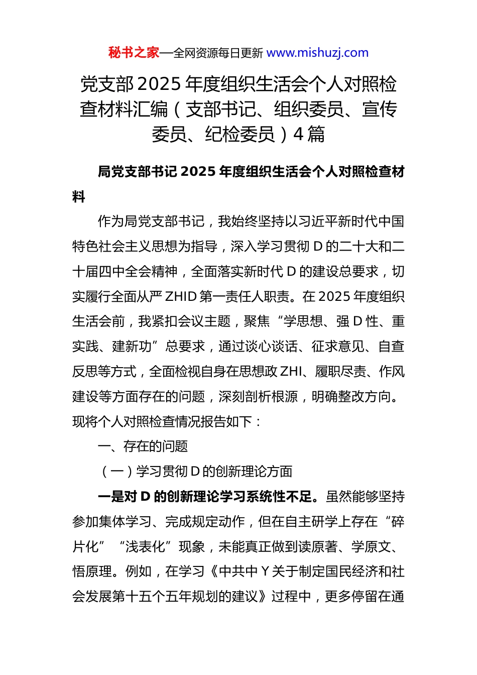 秘书之家—全网资源每日更新 www.mishuzj.com党支部 2025 年度组织生活会个人对照检查材料汇编(支部书记、组织委员、宣传委员、纪检委员)4 篇局党支部书记 2025 年度组织生活会个人对照检查材料作为局党支部书记,我始终坚持以习近平新时代中国特色社会主义思想为指导,深入学习贯彻 D 的二十大和二十届四中全会精神,全面落实新时代 D 的建设总要求,切实履行全面从严 ZHID 第一责任人职责。在 2025 年度组织生活会前,我紧扣会议主题,聚焦“学思想、强 D 性、重实践、建新功”总要求,通过谈心谈话、征求意见、自查反思等方式,全面检视自身在思想政 ZHI、履职尽责、作风建设等方面存在的问题,深刻剖析根源,明确整改方向。现将个人对照检查情况报告如下:一、存在的问题(一)学习贯彻 D 的创新理论方面一是对 D 的创新理论学习系统性不足。虽然能够坚持参加集体学习、完成规定动作,但在自主研学上存在“碎片化”“浅表化”现象,未能真正做到读原著、学原文、悟原理。例如,在学习《中共中 Y 关于制定国民经济和社会发展第十五个五年规划的建议》过程中,更多停留在通秘书之家—全网资源每日更新 www.mishuzj.com读文件层面,缺乏对战略部署内在逻辑的深度思考,导致在结合本单位实际谋划工作时,前瞻性不够、转化力不强这反映出我在理论武装上的主动性仍有欠缺,尚未完全把学习作为一种政 ZHI 责任和精神追求来对待。二是理论联系实际的能力有待提升。在推动 D 建与业务深度融合过程中,有时仍存在“两张皮”现象。比如,在推进“现代化产业体系建设”相关任务时,未能充分运用新发展理念指导基层 D 建工作创新,D 组织在服务重大项目、关键环节中的引领作用发挥得还不够充分。说明我对如何以 D 的创新理论破解发展难题的理解还不够透彻,学用结合的“最后一公里”尚未真正打通。(二)加强 D 性锻炼方面一是政 ZHI 判断力、政 ZHI 领悟力需进一步增强。面对复杂敏感问题时,个别时候从政 ZHI 高度观察分析问题的意识还不强。例如,在处理某次群众信访事项中,初期更多关注程序合规性,而对其背后可能涉及的民生诉求与社会稳定风险预判不足,后续经上级提醒才及时调整应对策略。暴露出我在政 ZHI 敏锐性和大局观上还有短板,没有时刻做到胸怀“国之大者”。二是 D 内政 ZHI 生活质量有待提高。作为支部书记,在主持组织生活会、开展批评与自我批评时,有时存在秘书之家—全网资源每日更新 www.mishuzj.com“老好人”思想,对班子成员提醒多、点问题少,怕伤和气、影响团结。个别同志指出,“红脸出汗”的效果打了折扣。这说明我在严肃 D 内政 ZHI 生活上还缺乏足够勇气和斗争精神,离高标准严要求尚有差距。(三)联系服务群众方面一是深入一线调研不够扎实。尽管制定了年度调研计划,但受事务性工作牵绊,真正沉到基层一线的时间偏少听汇报多、看材料多,面对面听取干部职工和服务对象意见建议相对不足。特别是在推动社区适老化改造项目中,前期征求居民意见不够广泛,导致部分设施建成后使用率不高。反映出我宗旨意识树得不牢,群众路线践行不到位。二是回应群众关切的时效性有待加强。对于一些历史遗留问题或跨部门协调事项,存在等待观望心态,主动攻坚克难的劲头不足。如某老旧小区加装电梯推进缓慢,虽多次开会研究,但实质性进展有限,群众满意度不高。说明我在担当作为上还需加压奋进,解决急难愁盼问题的力度亟待加大。(四)发挥先锋模范作用方面一是在重大任务面前示范引领作用发挥不充分。面对机构改革、职能调整等重点工作,虽然能够坚守岗位、履职尽责,但在带领团队闯关夺隘、开拓创新方面,带头冲秘书之家—全网资源每日更新 www.mishuzj.com锋的劲头有所减弱。个别年轻干部反映,“书记坐镇指挥多,一线冲锋少”。这表明我在关键时刻站得出、顶得上的先锋形象还需强化。二是带队伍抓班子的责任落实不够到位。对支委成员和其他 D 员干部的思想动态掌握不全面,谈心谈话频次偏低,压力传导层层递减。个别 D 小组组织生活流于形式,活动内容单一,吸引力不强。反映出我在抓班子、带队伍上的统筹...