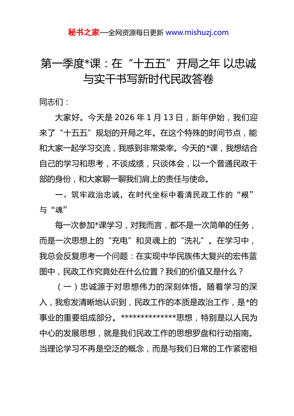 秘书之家—全网资源每日更新 www.mishuzj.com第一季度*课:在“十五五”开局之年 以忠诚与实干书写新时代民政答卷同志们:大家好。今天是 2026 年 1 月 13 日,新年伊始,我们迎来了“十五五”规划的开局之年。在这个特殊的时间节点,能和大家一起学习交流,我感到非常荣幸。今天的*课,我想结合自己的学习和思考,不谈成绩,只谈体会,以一个普通民政干部的身份,和大家聊一聊我们肩上的责任与使命。一、筑牢政治忠诚,在时代坐标中看清民政工作的“根”与“魂”每一次参加*课学习,对我而言,都不是一次简单的任务,而是一次思想上的“充电”和灵魂上的“洗礼”。在学习中,我总会反复思考一个问题:在实现中华民族伟大复兴的宏伟蓝图中,民政工作究竟处在什么位置?我们的价值又是什么?(一)忠诚源于对思想伟力的深刻体悟。随着学习的深入,我愈发清晰地认识到,民政工作的本质是政治工作,是*的事业的重要组成部分。**************思想,特别是以人民为中心的发展思想,就是我们民政工作的思想罗盘和行动指南。当理论学习不再是空泛的概念,而是与我们日常的工作紧密相秘书之家—全网资源每日更新 www.mishuzj.com连时,思想的伟力就真正显现出来。我们审批的每一笔低保金,走访的每一个困难家庭,建设的每一处养老设施,都是在践行*的初心使命,都是在厚植*的执政根基。这种从理论到实践的贯通,让我对*的理论认同感、政治认同感和情感认同感都达到了新的高度,也让我更加深刻地理解了“忠诚”二字的千钧之重。它不是一句口号,而是融入血脉、见诸行动的坚定信念。(二)忠诚体现于对“国之大者”的了然于胸。2026 年是“十五五”规划的开局之年。站在这个新的历史起点上,我们更要跳出“一亩三分地”的局限,将民政工作放到*和国家事业发展全局中去审视和谋划。所谓“国之大者”,就是人民的幸福生活。促进共同富裕、积极应对人口老龄化、加强和创新基层社会治理,这些都是“国之大者”,也恰恰是民政工作的核心职责所在。深刻把握民政工作的政治属性,要求我们必须胸怀大局,将*中央和省、市、县的决策部署,不折不扣地转化为服务群众的具体行动。从这个意义上说,我们手中的每一份文件、办理的每一项业务,都与国家的发展脉搏同频共振。看清了这一点,才能真正找到我们工作的坐标和方向,才能把忠诚刻在心上、落在行上。二、聚焦民生实事,在履职尽责中彰显民政干部的“情”秘书之家—全网资源每日更新 www.mishuzj.com与“为”民政工作面对的是人民群众最关心、最直接、最现实的利益问题,连接着民心,关系着国本。这份工作,需要有严谨的制度,更需要有温暖的情怀。我时常感到,我们不仅是在办业务,更是在传递*和政府的温度。(一)织密一张网,守住共同富裕的底线温度。社会救助是民政工作的基石,是保障基本民生、促进社会公平的兜底性制度安排。这张网织得牢不牢,直接关系到困难群众的生存与尊严。近年来,随着社会救助体系的不断完善,我们的工作也面临着新的挑战。如何确保救助的精准性,让每一分“救命钱”都用在刀刃上,是我时常感到压力和责任的地方。资金的使用与管理,是高压线,更是检验我们*性的试金石。根据民政部近年来的部署,社会救助正在向构建分层分类的救助体系和优化动态监测信息平台的方向发展,这意味着我们的工作要更加精细。对我而言,每一份申请材料背后,都是一个家庭的期盼;每一次入户核查,都是一次对群众生活最真切地感知。因此,健全廉政风险防控机制,不仅是对制度的敬畏,更是对人民的负责。只有用心、用情、用力,把群众的事当成自己的事,才能真正守住这条共同富裕的底线,让每一个身处困境的个体都能感受到社会的温暖。秘书之家—全网资源每日更新 www.mishuzj.com(二)绘好一幅图,应对人口老龄化的时代考题。我国人口老龄化程度持续加深,如何实现“老有所养、老有所依、老有所乐、老有所安”,是一道必须答好的时代考题。构建普惠可及的养老服务体系,是我们的核心任务。这项工作,一头连着夕阳红,一头连着千万家。近年来,从中央到地方都在大力推进养老服务体系建设,包括居家社区机构相协调、医养康养相结合...