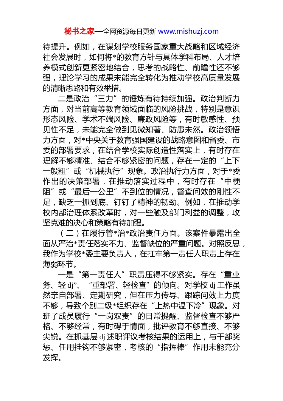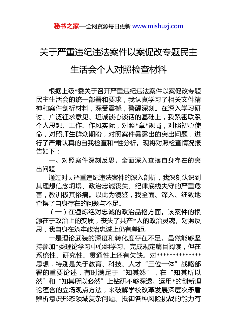 秘书之家—全网资源每日更新 www.mishuzj.com关于严重违纪违法案件以案促改专题民主生活会个人对照检查材料根据上级*委关于召开严重违纪违法案件以案促改专题民主生活会的统一部署和要求,我认真学习了相关文件精神和案件剖析材料,深受震撼,警醒深刻。在深入学习研讨、广泛征求意见、坦诚谈心谈话的基础上,我紧密联系个人思想、工作、作风实际,对照*章*规 dj,对照初心使命,对照师生群众期盼,对照案件暴露出的突出问题,进行了严肃认真的自我检查和*性分析。现将对照检查情况报告如下:一、对照案件深刻反思,全面深入查摆自身存在的突出问题通过对 x 严重违纪违法案件的深入剖析,我深刻认识到其理想信念坍塌、政治忠诚丧失、纪律底线失守的严重危害,教训极其惨痛。以此为镜鉴,我全面、深入、细致地查摆了自身存在的问题与不足。(一)在锤炼绝对忠诚的政治品格方面。该案件的根源在于政治上的变质,丧失了共产*人的政治灵魂。对照反思,我自身在筑牢政治忠诚上仍有差距。一是理论武装的深度和转化度存在不足。虽然能够坚持参加*委理论学习中心组学习、完成规定篇目阅读,但在系统性、研究性、贯通性上还有欠缺。对**************思想,特别是关于教育、科技、人才“三位一体”战略部署的重要论述,有时满足于“知其然”,在“知其所以然”和“知其所以必然”上钻研不够深透。运用*的创新理论蕴含的立场观点方法,来破解学校改革发展深层次矛盾辨析意识形态领域复杂问题、抵御各种风险挑战的能力有秘书之家—全网资源每日更新 www.mishuzj.com待提升。例如,在谋划学校服务国家重大战略和区域经济社会发展时,如何将*的教育方针与具体学科布局、人才培养模式创新更紧密地结合,思考的战略性、前瞻性还不够强,理论学习的成果未能完全转化为推动学校高质量发展的清晰思路和有效举措。二是政治“三力”的锤炼有待持续加强。政治判断力方面,对当前高等教育领域面临的风险挑战,特别是意识形态风险、学术不端风险、廉政风险等,有时敏感性、预见性不足,未能完全做到见微知著、防患未然。政治领悟力方面,对*中央关于教育强国建设的战略意图和省委、市委的部署要求,在结合学校实际创造性落实上,有时存在理解不够精准、结合不够紧密的问题,存在一定的“上下一般粗”或“机械执行”现象。政治执行力方面,对于*委作出的决策部署,在推动落实过程中,有时存在“中梗阻”或“最后一公里”不到位的情况,督查问效的刚性不足,缺乏一抓到底、钉钉子精神的韧劲。例如,在推动学校内部治理体系改革时,对一些触及部门利益的调整,攻坚克难的决心和策略有待加强。(二)在履行管*治*政治责任方面。该案件暴露出全面从严治*责任落实不力、监督缺位的严重问题。对照反思,我作为学校*委主要负责人,在扛牢第一责任人职责上存在薄弱环节。一是“第一责任人”职责压得不够紧实。存在“重业务、轻 dj”、“重部署、轻检查”的倾向。对学校 dj 工作虽然亲自部署、定期研究,但在压力传导、跟踪问效上力度不够,导致个别二级*组织存在“上热中温下冷”现象。对班子成员履行“一岗双责”的日常提醒、监督检查不够严格、不够经常,有时碍于情面,批评教育不够直接、不够尖锐。在抓基层 dj 述职评议考核结果的运用上,与干部奖惩、任用挂钩不够紧密,考核的“指挥棒”作用未能充分发挥。秘书之家—全网资源每日更新 www.mishuzj.com二是廉政风险防控的精准性和有效性有待提升。对学校重点领域和关键环节的廉政风险研判不够深入、动态。例如,在招生录取、人才引进、科研经费管理、基建工程招标采购、校办企业、附属单位管理等方面,虽然建立了制度,但对制度执行情况的监督检查不够深入细致,对潜在的风险点排查不够全面,防控措施有时滞后于形势发展对运用信息化手段加强廉政风险预警和动态监控的探索不够。结合高校特点,构建*委全面监督、纪委专责监督、*的工作部门职能监督、基层*组织日常监督、*员民主监督贯通协调的监督体系,思考谋划不够系统。三是意识形态工作责任制落实存在温差。对意识形态工作的极端重要性认识是到位的,但在具体落实中,有时存在“重部署、轻研判”...