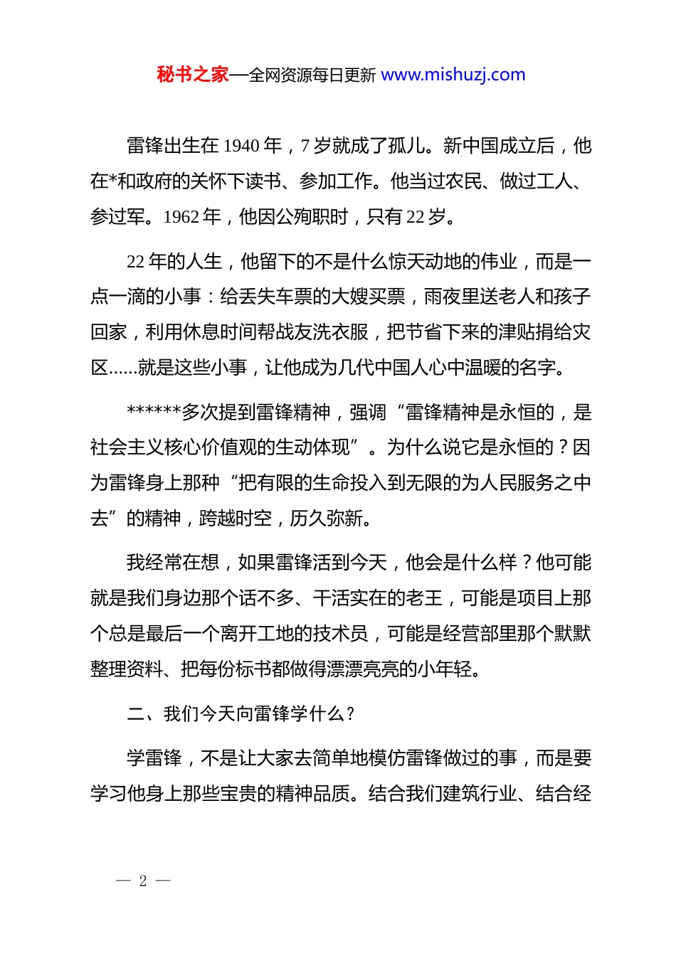 秘书之家—全网资源每日更新 www.mishuzj.com国企*委书记学雷锋宣传月专题*课同志们:今天,我们在这里召开专题*课,共同纪念雷锋同志,学习雷锋精神。三月是学雷锋宣传月,也是我们建筑企业一年一度经营工作全面铺开、项目建设加速推进的关键时期。在这个时间节点,和大家一起重温雷锋故事、感悟雷锋精神,我觉得特别有意义。刚才进门的时候,我看到宣传栏里贴着我们去年几个项目上的*员突击队照片。看着那些熟悉的面孔,我就想到一个问题:什么是我们这个时代的雷锋?在我们建筑行业,在我们经营一线,雷锋精神应该是什么样子?带着这个问题,我想和大家交流几点体会。一、雷锋是谁?他离我们并不遥远在座的有老同志,也有不少年轻面孔。可能有些年轻人觉得,雷锋是上世纪的人物,离我们太远了。但我想说的是,雷锋离我们并不遥远。— 1 —秘书之家—全网资源每日更新 www.mishuzj.com雷锋出生在 1940 年,7 岁就成了孤儿。新中国成立后,他在*和政府的关怀下读书、参加工作。他当过农民、做过工人、参过军。1962 年,他因公殉职时,只有 22 岁。22 年的人生,他留下的不是什么惊天动地的伟业,而是一点一滴的小事:给丢失车票的大嫂买票,雨夜里送老人和孩子回家,利用休息时间帮战友洗衣服,把节省下来的津贴捐给灾区……就是这些小事,让他成为几代中国人心中温暖的名字。******多次提到雷锋精神,强调“雷锋精神是永恒的,是社会主义核心价值观的生动体现”。为什么说它是永恒的?因为雷锋身上那种“把有限的生命投入到无限的为人民服务之中去”的精神,跨越时空,历久弥新。我经常在想,如果雷锋活到今天,他会是什么样?他可能就是我们身边那个话不多、干活实在的老王,可能是项目上那个总是最后一个离开工地的技术员,可能是经营部里那个默默整理资料、把每份标书都做得漂漂亮亮的小年轻。二、我们今天向雷锋学什么?学雷锋,不是让大家去简单地模仿雷锋做过的事,而是要学习他身上那些宝贵的精神品质。结合我们建筑行业、结合经— 2 —秘书之家—全网资源每日更新 www.mishuzj.com营工作的实际,我觉得有这么几点特别值得我们学习。第一,学习他“干一行爱一行”的敬业精神。雷锋一生换了多次岗位,从农民到工人,从工人到军人,每一次他都干得特别投入。他当拖拉机手,是优秀的拖拉机手;当推土机手,是优秀的推土机手;当汽车兵,是优秀的汽车兵。他在日记里写道:“对待工作要像夏天一样火热。”我们建筑行业,工作性质特殊。经营口的人常年出差,项目部的人常年驻守工地,办公室的人天天跟文件材料打交道。每个岗位都有每个岗位的辛苦,但也都有每个岗位的价值。去年,我们一个项目投标,同志们连续加班。最后,我们中标了,有个小伙子跟我说了一句话,让我印象特别深。他说:干活累不死人,就怕活儿干不好丢人。”这就是我们的“对待工作像夏天一样火热”。第二,学习他“挤”和“钻”的“钉子精神”。雷锋有句名言:“我们是国家的主人,应该处处为国家着想。在工作上,要向积极性最高的同志看齐;在生活上,要向水平最低的同志看齐。”他还说:“有些人说工作忙、没有时间学习。我认为问题不在工作忙,而在于你愿不愿意学习,会— 3 —秘书之家—全网资源每日更新 www.mishuzj.com不会挤时间。要学习的时间是有的,问题是我们善不善于挤,愿不愿意钻。”这就是著名的“钉子精神”——善于挤、善于钻。我们经营工作,压力大、竞争激烈。市场就这么大,你不去挤,就没有位置;你不去钻,就拿不到好项目。去年我们跟踪一个重点项目,对方刚开始对我们并不了解。我们带着团队,一遍遍跑、一次次沟通。靠的是什么?就是这种“挤”和“钻”的劲头。项目上的同志也是一样。我们一个老旧小区改造项目,给每户建立“一户一档”定制化改造方案,解决施工扰民问题。这不就是“钻”吗?第三,学习他“服务人民、助人为乐”的奉献精神。雷锋最打动人的,就是他那种“把别人的困难当成自己的困难,把同志的愉快看成自己的幸福”的品格。我们建筑行业,干的都是民生工程,哪一样不和老百姓的生活息息相关?我们把活干好了,就是在服务人民。去年,一个项目组织...