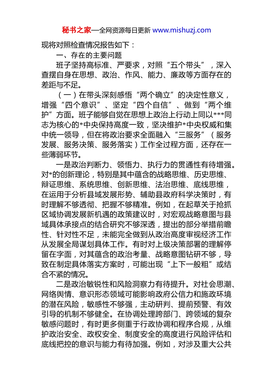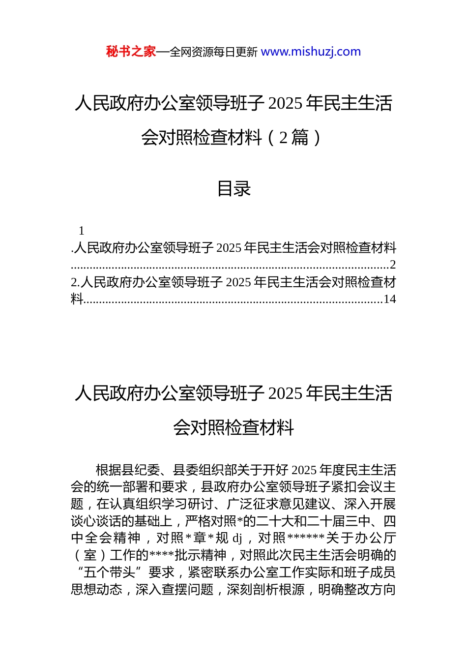 秘书之家—全网资源每日更新 www.mishuzj.com人民政府办公室领导班子 2025 年民主生活会对照检查材料(2 篇)目录1.人民政府办公室领导班子 2025 年民主生活会对照检查材料.....................................................................................................22.人民政府办公室领导班子 2025 年民主生活会对照检查材料...............................................................................................14人民政府办公室领导班子 2025 年民主生活会对照检查材料根据县纪委、县委组织部关于开好 2025 年度民主生活会的统一部署和要求,县政府办公室领导班子紧扣会议主题,在认真组织学习研讨、广泛征求意见建议、深入开展谈心谈话的基础上,严格对照*的二十大和二十届三中、四中全会精神,对照 *章*规 dj,对照******关于办公厅(室)工作的****批示精神,对照此次民主生活会明确的“五个带头”要求,紧密联系办公室工作实际和班子成员思想动态,深入查摆问题,深刻剖析根源,明确整改方向秘书之家—全网资源每日更新 www.mishuzj.com现将对照检查情况报告如下:一、存在的主要问题班子坚持高标准、严要求,对照“五个带头”,深入查摆自身在思想、政治、作风、能力、廉政等方面存在的差距与不足。(一)在带头深刻感悟“两个确立”的决定性意义,增强“四个意识”、坚定“四个自信”、做到“两个维护”方面。班子能够自觉在思想上政治上行动上同以***同志为核心的*中央保持高度一致,坚决维护*中央权威和集中统一领导,但在将政治要求全面融入“三服务”(服务发展、服务决策、服务落实)工作全过程方面,还存在一些薄弱环节。一是政治判断力、领悟力、执行力的贯通性有待增强。对*的创新理论,特别是其中蕴含的战略思维、历史思维、辩证思维、系统思维、创新思维、法治思维、底线思维,在运用于分析县域发展形势、辅助县政府科学决策时,有时理解不够透彻、把握不够精准。例如,在起草关于抢抓区域协调发展新机遇的政策建议时,对宏观战略意图与县域具体承接点的结合研究不够深透,提出的部分举措前瞻性、针对性不足,未能完全做到从政治高度审视经济工作从发展全局谋划具体工作。有时对上级决策部署的理解停留在字面,对其蕴含的政治考量、战略意图钻研不够,导致在制定具体落实方案时,可能出现“上下一般粗”或结合不紧的情况。二是政治敏锐性和风险洞察力有待提升。对社会思潮、网络舆情、意识形态领域可能影响政府公信力和施政环境的潜在风险,敏感性不够强,主动研判、提前预警、有效引导的机制不够健全。在协调处理跨部门、跨领域的复杂敏感问题时,有时更多侧重于行政协调和程序合规,从维护政治安全、政权安全、制度安全的高度进行风险评估和底线把控的意识与能力有待加强。例如,对涉及重大公共秘书之家—全网资源每日更新 www.mishuzj.com利益调整的政策出台前,对社会承受度和舆论反应的预判评估有时不够充分。三是推动决策部署落地见效的穿透力有待强化。对县委、县政府确定的重大决策、重要部署、重点任务,办公室在跟踪督办、推动落实上,虽然建立了机制,但有时存在“重布置、轻问效”,“重过程、轻结果”的现象。督查手段有时偏重于文来文往、电话催办,深入一线实地核查、暗访调研不够经常。对于落实过程中出现的“中梗阻”、“推拖绕”等问题,敢于较真碰硬、一督到底的韧劲和刚性不足。例如,在督办 2025 年度“深化‘放管服’改革优化营商环境”重点任务时,对部分单位存在的“明放暗不放”、数据壁垒等问题,牵头协调、推动实质性解决的力度和深度有待加大。(二)在带头用**************思想凝心铸魂方面。班子注重理论武装,但在推动学习往深里走、往实里走、往心里走,真正用以武装头脑、指导实践、推动工作上,还存在差距。一是理论学习的系统性和转化度有待提高。学习安排有时与办公室核心职能和阶段性重点任务结合不够紧密,存在一定的“任务化”倾向。对**************思想,特别是其中关于高质量发展、共同富裕、国家治理体系和治理能力现代化等重要论述,系统性、跟进性学习有安排,但在...