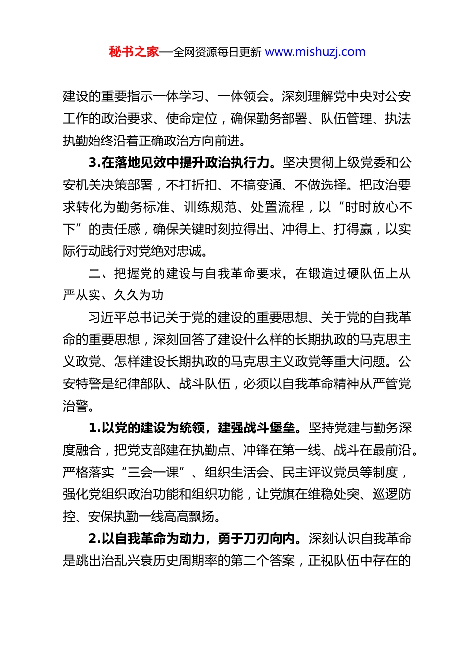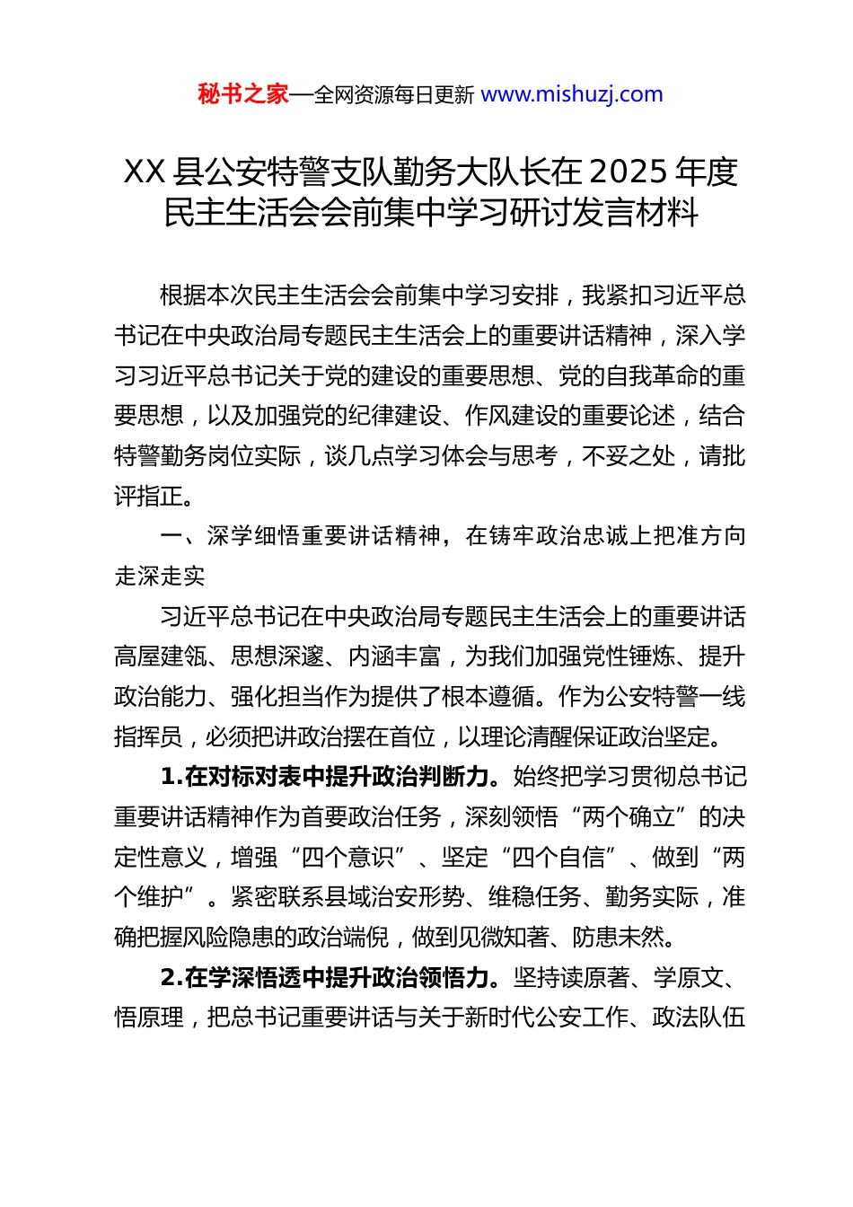 秘书之家—全网资源每日更新 www.mishuzj.comXX 县公安特警支队勤务大队长在 2025 年度民主生活会会前集中学习研讨发言材料根据本次民主生活会会前集中学习安排,我紧扣习近平总书记在中央政治局专题民主生活会上的重要讲话精神,深入学习习近平总书记关于党的建设的重要思想、党的自我革命的重要思想,以及加强党的纪律建设、作风建设的重要论述,结合特警勤务岗位实际,谈几点学习体会与思考,不妥之处,请批评指正。一、深学细悟重要讲话精神,在铸牢政治忠诚上把准方向走深走实习近平总书记在中央政治局专题民主生活会上的重要讲话高屋建瓴、思想深邃、内涵丰富,为我们加强党性锤炼、提升政治能力、强化担当作为提供了根本遵循。作为公安特警一线指挥员,必须把讲政治摆在首位,以理论清醒保证政治坚定。1.在对标对表中提升政治判断力。始终把学习贯彻总书记重要讲话精神作为首要政治任务,深刻领悟“两个确立”的决定性意义,增强“四个意识”、坚定“四个自信”、做到“两个维护”。紧密联系县域治安形势、维稳任务、勤务实际,准确把握风险隐患的政治端倪,做到见微知著、防患未然。2.在学深悟透中提升政治领悟力。坚持读原著、学原文、悟原理,把总书记重要讲话与关于新时代公安工作、政法队伍秘书之家—全网资源每日更新 www.mishuzj.com建设的重要指示一体学习、一体领会。深刻理解党中央对公安工作的政治要求、使命定位,确保勤务部署、队伍管理、执法执勤始终沿着正确政治方向前进。3.在落地见效中提升政治执行力。坚决贯彻上级党委和公安机关决策部署,不打折扣、不搞变通、不做选择。把政治要求转化为勤务标准、训练规范、处置流程,以“时时放心不下”的责任感,确保关键时刻拉得出、冲得上、打得赢,以实际行动践行对党绝对忠诚。二、把握党的建设与自我革命要求,在锻造过硬队伍上从严从实、久久为功习近平总书记关于党的建设的重要思想、关于党的自我革命的重要思想,深刻回答了建设什么样的长期执政的马克思主义政党、怎样建设长期执政的马克思主义政党等重大问题。公安特警是纪律部队、战斗队伍,必须以自我革命精神从严管党治警。1.以党的建设为统领,建强战斗堡垒。坚持党建与勤务深度融合,把党支部建在执勤点、冲锋在第一线、战斗在最前沿。严格落实“三会一课”、组织生活会、民主评议党员等制度,强化党组织政治功能和组织功能,让党旗在维稳处突、巡逻防控、安保执勤一线高高飘扬。2.以自我革命为动力,勇于刀刃向内。深刻认识自我革命是跳出治乱兴衰历史周期率的第二个答案,正视队伍中存在的秘书之家—全网资源每日更新 www.mishuzj.com苗头性、倾向性问题。常态化开展检视剖析、问题排查、整改提升,坚决克服麻痹思想、松劲心态、侥幸心理,以彻底的自我革命精神纯洁队伍、淬炼作风。3.以队伍过硬为目标,夯实履职根基。坚持严管厚爱结合、激励约束并重,突出政治标准、实战导向、纪律底线,加强思想淬炼、政治历练、实践锻炼、专业训练。引导全体民辅警把忠诚注入灵魂、把责任扛在肩上、把纪律挺在前面,打造“四个铁一般”的公安特警铁军。三、严守纪律规矩、锤炼优良作风,在正风肃纪上一严到底、常态长效习近平总书记反复强调,纪律是管党治党的“戒尺”,作风建设永远在路上。公安特警手握执法权、身处第一线、直面群众与风险,纪律作风直接关系公安形象、执法公信力和群众安全感。1.把纪律建设摆在突出位置,筑牢思想防线。深入学习新修订的《中国共产党纪律处分条例》,常态化开展党纪学习教育、警示教育、以案促改。引导全体队员知敬畏、存戒惧、守底线,严格遵守政治纪律、组织纪律、廉洁纪律、群众纪律、工作纪律、生活纪律,做到令行禁止、步调一致。2.把作风建设抓在经常严在日常,弘扬严实新风。锲而不舍落实中央八项规定及其实施细则精神,坚决纠治形式主义、官僚主义,严防享乐主义、奢靡之风反弹回潮。坚持实事求是、秘书之家—全网资源每日更新 www.mishuzj.com求真务实,深入执勤一线、队员中间、群众身边,察实情、出实招、求实效,以优良作风凝聚警心、赢得民心。3.把规范用权贯穿履职全过程,坚守公正底线。坚持依法执...