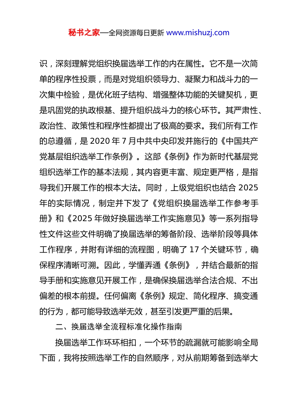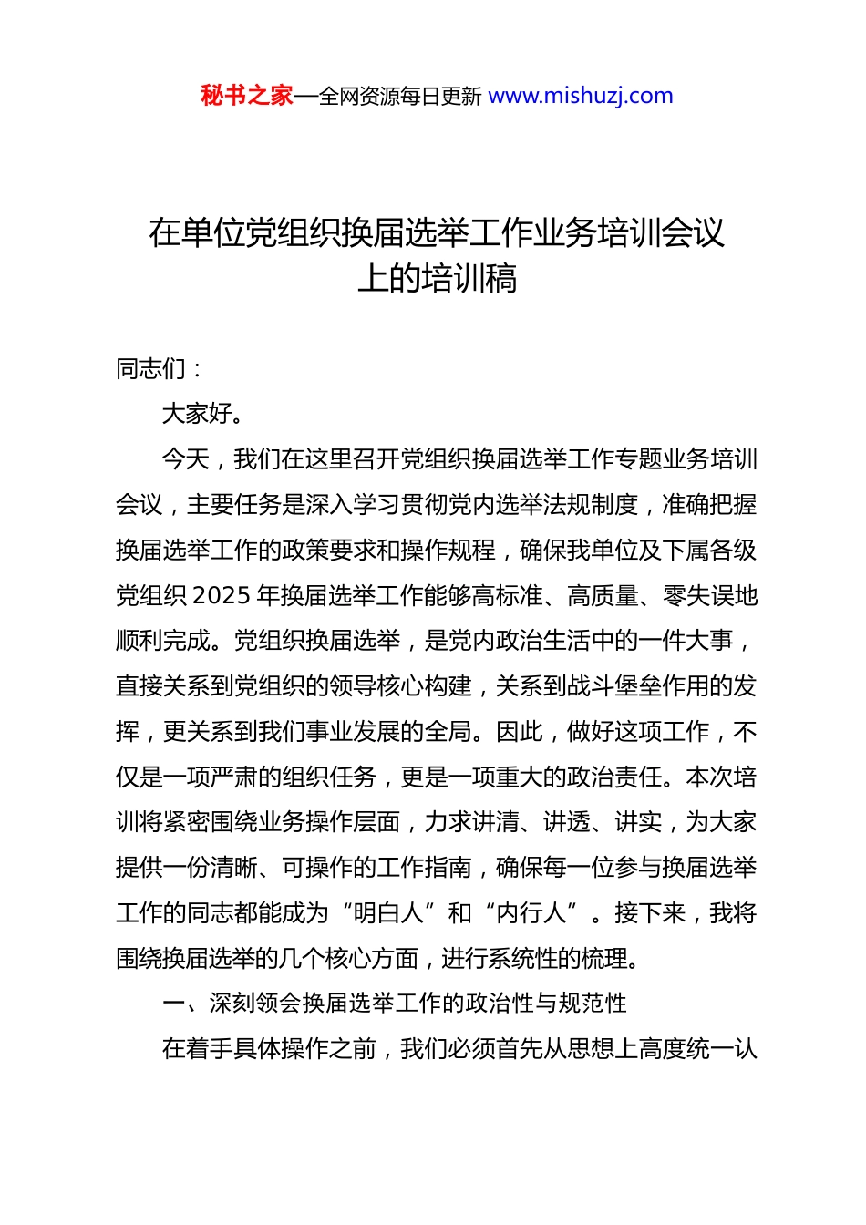 秘书之家—全网资源每日更新 www.mishuzj.com在单位党组织换届选举工作业务培训会议上的培训稿同志们:大家好。今天,我们在这里召开党组织换届选举工作专题业务培训会议,主要任务是深入学习贯彻党内选举法规制度,准确把握换届选举工作的政策要求和操作规程,确保我单位及下属各级党组织 2025 年换届选举工作能够高标准、高质量、零失误地顺利完成。党组织换届选举,是党内政治生活中的一件大事,直接关系到党组织的领导核心构建,关系到战斗堡垒作用的发挥,更关系到我们事业发展的全局。因此,做好这项工作,不仅是一项严肃的组织任务,更是一项重大的政治责任。本次培训将紧密围绕业务操作层面,力求讲清、讲透、讲实,为大家提供一份清晰、可操作的工作指南,确保每一位参与换届选举工作的同志都能成为“明白人”和“内行人”。接下来,我将围绕换届选举的几个核心方面,进行系统性的梳理。一、深刻领会换届选举工作的政治性与规范性在着手具体操作之前,我们必须首先从思想上高度统一认秘书之家—全网资源每日更新 www.mishuzj.com识,深刻理解党组织换届选举工作的内在属性。它不是一次简单的程序性投票,而是对党组织领导力、凝聚力和战斗力的一次集中检验,是优化班子结构、增强整体功能的关键契机,更是巩固党的执政根基、提升组织战斗力的核心环节。其严肃性、政治性、政策性和程序性都提出了极高的要求。我们所有工作的总遵循,是 2020 年 7 月中共中央印发并施行的《中国共产党基层组织选举工作条例》。这部《条例》作为新时代基层党组织选举工作的基本法规,其内容更丰富、规定更严格,是指导我们开展工作的根本大法。同时,上级党组织也结合 2025年的实际情况,制定并下发了《党组织换届选举工作参考手册》和《2025 年做好换届选举工作实施意见》等一系列指导性文件这些文件明确了换届选举的筹备阶段、选举阶段等具体工作程序,并附有详细的流程图,明确了 17 个关键环节,确保程序清晰可溯。因此,学懂弄通《条例》,并结合最新的指导手册和实施意见开展工作,是确保换届选举合法合规、不出偏差的根本前提。任何偏离《条例》规定、简化程序、搞变通的行为,都可能导致选举无效,甚至引发更严重的后果。二、换届选举全流程标准化操作指南换届选举工作环环相扣,一个环节的疏漏就可能影响全局下面,我将按照选举工作的自然顺序,对从前期筹备到选举大秘书之家—全网资源每日更新 www.mishuzj.com会召开的全流程进行分解说明,明确每个环节的“任务清单”和“操作要点”。第一阶段,选举前期筹备工作的关键环节。筹备工作是换届选举成功的基础,必须谋划在前、准备充分。首先,要成立换届选举工作领导小组和工作机构,在上级党组织指导下,负责整个换届选举的组织领导和具体实施。其次,要制定详尽的换届选举工作方案。方案内容应涵盖指导思想、换届选举的时间安排、新一届委员会的名额设置和构成原则、候选人的条件和产生办法、选举方式以及工作步骤等。这个方案需要报请上级党组织审查批准后方可实施,这是不可或缺的前置程序。方案一旦批准,就要严格按照时间节点推进。第三,要对本届委员会的工作进行全面总结,并对党组织和党员队伍的状况进行深入的摸底排查。这包括班子是否健全、委员是否存在缺额、组织生活是否正常、是否存在软弱涣散等情况。通过摸底,为新一届委员会的组成和工作方向提供决策依据。第四,要做好宣传动员和党员教育工作。通过多种形式,组织党员深入学习《中国共产党章程》和《条例》等党内法规,明确党员在选举中的权利和义务,引导党员正确行使民主权利,为换届选举营造风清气正的良好氛围。最后,根据本单位的实际情况和工作需要,科学确定新一届委员会的委员名额、书记、副书记职数,秘书之家—全网资源每日更新 www.mishuzj.com并就委员的构成提出指导性意见,这个事项同样需要提前向上级党组织请示并获得批复。第二阶段,候选人酝酿提名与资格审查的严密程序。选准配强领导班子是换届选举的核心目标,而候选人的质量直接决定了班子的质量。这个过程必须充分发扬党内民主,严格按照程序进行。候选人的酝酿提名一般采取...