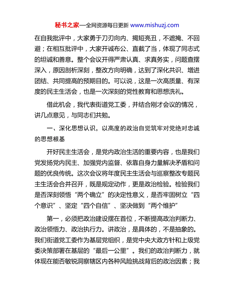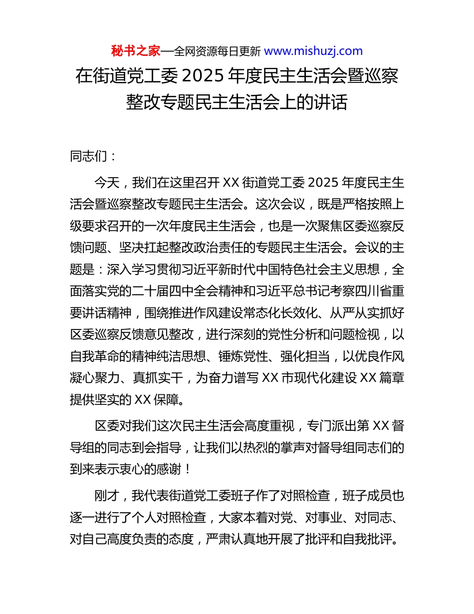 秘书之家—全网资源每日更新 www.mishuzj.com在街道党工委 2025 年度民主生活会暨巡察整改专题民主生活会上的讲话同志们:今天,我们在这里召开 XX 街道党工委 2025 年度民主生活会暨巡察整改专题民主生活会。这次会议,既是严格按照上级要求召开的一次年度民主生活会,也是一次聚焦区委巡察反馈问题、坚决扛起整改政治责任的专题民主生活会。会议的主题是:深入学习贯彻习近平新时代中国特色社会主义思想,全面落实党的二十届四中全会精神和习近平总书记考察四川省重要讲话精神,围绕推进作风建设常态化长效化、从严从实抓好区委巡察反馈意见整改,进行深刻的党性分析和问题检视,以自我革命的精神纯洁思想、锤炼党性、强化担当,以优良作风凝心聚力、真抓实干,为奋力谱写 XX 市现代化建设 XX 篇章提供坚实的 XX 保障。区委对我们这次民主生活会高度重视,专门派出第 XX 督导组的同志到会指导,让我们以热烈的掌声对督导组同志们的到来表示衷心的感谢!刚才,我代表街道党工委班子作了对照检查,班子成员也逐一进行了个人对照检查,大家本着对党、对事业、对同志、对自己高度负责的态度,严肃认真地开展了批评和自我批评。秘书之家—全网资源每日更新 www.mishuzj.com在自我批评中,大家勇于刀刃向内、揭短亮丑,不遮掩、不回避;在相互批评中,大家开诚布公、直截了当,体现了同志式的坦诚和善意。整个会议开得严肃认真、求真务实,问题查摆深入,原因剖析深刻,整改方向明确,达到了深化共识、增进团结、共同提高的预期目的。可以说,这是一次高质量、有深度的民主生活会,也是一次深刻的党性教育和思想洗礼。借此机会,我代表街道党工委,并结合刚才会议的情况,讲几点意见,与同志们共勉。一、深化思想认识,以高度的政治自觉筑牢对党绝对忠诚的思想根基开好民主生活会,是党内政治生活的重要内容,也是我们党发扬党内民主、加强党内监督、依靠自身力量解决矛盾和问题的优良传统。这次会议将年度民主生活会与巡察整改专题民主生活会合并召开,既是规定动作,更是政治检验。检验我们是否深刻领悟“两个确立”的决定性意义,是否牢固树立“四个意识”、坚定“四个自信”、坚决做到“两个维护”第一,必须把政治建设摆在首位,不断提高政治判断力、政治领悟力、政治执行力。讲政治,是具体的,不是抽象的。我们街道党工委作为基层党组织,是党中央大政方针和上级党委决策部署在基层的“最后一公里”。我们的政治判断力,就体现在能否敏锐洞察辖区内各种风险挑战背后的政治因素;我秘书之家—全网资源每日更新 www.mishuzj.com们的政治领悟力,就体现在能否完整、准确、全面地理解和把握上级精神,并与 XX 街道的实际紧密结合;我们的政治执行力,就体现在能否不折不扣、不偏不倚地将各项工作要求落到实处。巡察反馈的每一个问题,表面上看是具体工作中的偏差,但根子上都是政治站位、政治意识、政治能力的问题。我们必须坚持从政治上看问题、想问题、办事情,时刻对标对表党中央精神和上级要求,确保我们的各项工作始终沿着正确的政治方向前进。第二,必须坚持用党的创新理论凝心铸魂,做到真学真懂真信真用。思想是行动的先导。理论上清醒,政治上才能坚定。我们班子成员要带头持续深入学习习近平新时代中国特色社会主义思想,不能满足于读过了、学过了,更要往深里走、往实里走、往心里走。要深刻领会贯穿其中的世界观和方法论,掌握蕴含其中的道理学理哲理,真正用以武装头脑、指导实践、推动工作。特别是要把学习贯彻习近平总书记对四川省重要讲话和指示批示精神作为首要政治任务,逐字逐句研读,联系实际思考,搞清楚我们 XX 街道在新时代新征程中的定位是什么、使命是什么、应该干什么、怎么干得更好,从而把学习成果转化为谋划工作的思路、破解难题的办法和推动发展的实际成效。第三,必须坚决扛起巡察整改的政治责任,以实际行动诠释对党的忠诚。巡察是政治巡察,是上级党组织对下级党组织秘书之家—全网资源每日更新 www.mishuzj.com的政治体检。区委巡察组反馈的意见,代表的是区委的意见和要求,整改不落实,就是对党不忠诚、对人民不负责。我...