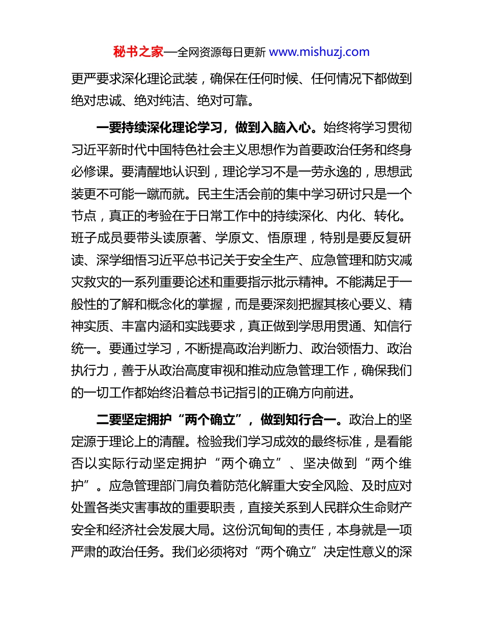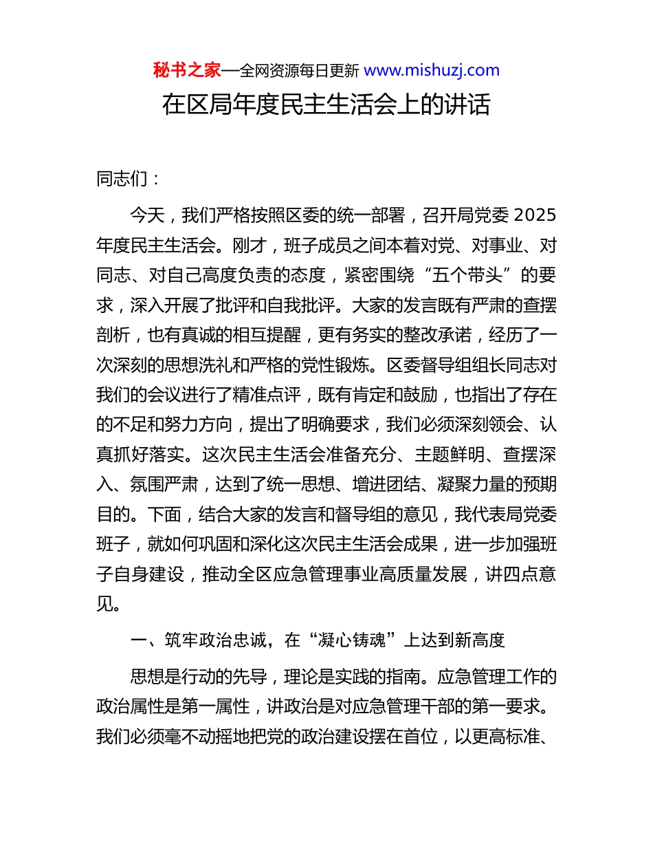 秘书之家—全网资源每日更新 www.mishuzj.com在区局年度民主生活会上的讲话同志们:今天,我们严格按照区委的统一部署,召开局党委 2025年度民主生活会。刚才,班子成员之间本着对党、对事业、对同志、对自己高度负责的态度,紧密围绕“五个带头”的要求,深入开展了批评和自我批评。大家的发言既有严肃的查摆剖析,也有真诚的相互提醒,更有务实的整改承诺,经历了一次深刻的思想洗礼和严格的党性锻炼。区委督导组组长同志对我们的会议进行了精准点评,既有肯定和鼓励,也指出了存在的不足和努力方向,提出了明确要求,我们必须深刻领会、认真抓好落实。这次民主生活会准备充分、主题鲜明、查摆深入、氛围严肃,达到了统一思想、增进团结、凝聚力量的预期目的。下面,结合大家的发言和督导组的意见,我代表局党委班子,就如何巩固和深化这次民主生活会成果,进一步加强班子自身建设,推动全区应急管理事业高质量发展,讲四点意见。一、筑牢政治忠诚,在“凝心铸魂”上达到新高度思想是行动的先导,理论是实践的指南。应急管理工作的政治属性是第一属性,讲政治是对应急管理干部的第一要求。我们必须毫不动摇地把党的政治建设摆在首位,以更高标准、秘书之家—全网资源每日更新 www.mishuzj.com更严要求深化理论武装,确保在任何时候、任何情况下都做到绝对忠诚、绝对纯洁、绝对可靠。一要持续深化理论学习,做到入脑入心。始终将学习贯彻习近平新时代中国特色社会主义思想作为首要政治任务和终身必修课。要清醒地认识到,理论学习不是一劳永逸的,思想武装更不可能一蹴而就。民主生活会前的集中学习研讨只是一个节点,真正的考验在于日常工作中的持续深化、内化、转化。班子成员要带头读原著、学原文、悟原理,特别是要反复研读、深学细悟习近平总书记关于安全生产、应急管理和防灾减灾救灾的一系列重要论述和重要指示批示精神。不能满足于一般性的了解和概念化的掌握,而是要深刻把握其核心要义、精神实质、丰富内涵和实践要求,真正做到学思用贯通、知信行统一。要通过学习,不断提高政治判断力、政治领悟力、政治执行力,善于从政治高度审视和推动应急管理工作,确保我们的一切工作都始终沿着总书记指引的正确方向前进。二要坚定拥护“两个确立”,做到知行合一。政治上的坚定源于理论上的清醒。检验我们学习成效的最终标准,是看能否以实际行动坚定拥护“两个确立”、坚决做到“两个维护”。应急管理部门肩负着防范化解重大安全风险、及时应对处置各类灾害事故的重要职责,直接关系到人民群众生命财产安全和经济社会发展大局。这份沉甸甸的责任,本身就是一项严肃的政治任务。我们必须将对“两个确立”决定性意义的深秘书之家—全网资源每日更新 www.mishuzj.com刻感悟,转化为履职尽责的强大动力和实际成效。在重大原则问题上,必须旗帜鲜明、立场坚定;在贯彻落实党中央和省委、市委、区委决策部署上,必须不折不扣、令行禁止。要坚决杜绝在执行中打折扣、搞变通,确保中央和各级党委的政令在 XX 区应急管理系统畅通无阻、落地生根。二、坚持问题导向,在“动真碰硬”上展现新作为民主生活会的目的,不仅在于“红脸出汗”,更在于“排毒治病”。查摆问题是基础,解决问题才是关键。对于会上查摆出的问题,无论是班子的共性问题,还是个人的具体问题,都必须以“钉钉子”的精神,拿出动真碰硬的勇气和抓铁有痕的决心,逐项销号、彻底整改,切实把民主生活会的“问题清单”转化为推动安全提质增效的“成果清单”。一要建立闭环管理机制,确保整改见底。会后,局党委要迅速研究制定班子整改方案,班子成员要结合会上相互批评的意见,进一步完善个人整改清单。要坚决摒弃“闯关”思想和“过关”心态,杜绝“纸上整改”“口头整改”。必须建立“台账管理、动态更新、销号落实”的闭环管理机制,明确整改目标、责任主体、整改措施和完成时限。对于能够立即整改的问题,要立行立改、马上就办;对于需要一定时间解决的问题,要持续跟踪、紧盯不放,直到问题彻底解决。局党委要定期听取整改落实情况汇报,对整改不力、敷衍塞责的,要严肃秘书之家—全网资源每日更新 www.mishu...