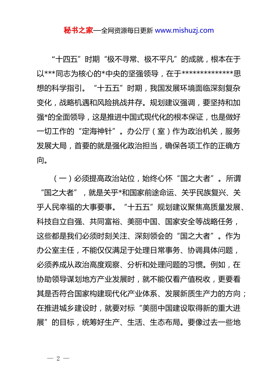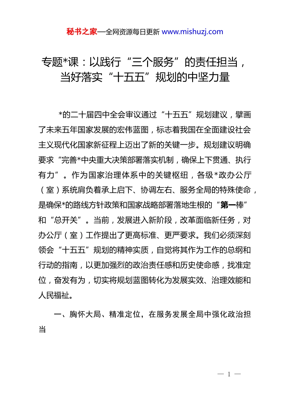 秘书之家—全网资源每日更新 www.mishuzj.com专题*课:以践行“三个服务”的责任担当,当好落实“十五五”规划的中坚力量 *的二十届四中全会审议通过“十五五”规划建议,擘画了未来五年国家发展的宏伟蓝图,标志着我国在全面建设社会主义现代化国家新征程上迈出了新的关键一步。规划建议明确要求“完善*中央重大决策部署落实机制,确保上下贯通、执行有力”。作为国家治理体系中的关键枢纽,各级*政办公厅(室)系统肩负着承上启下、协调左右、服务全局的特殊使命,是确保*的路线方针政策和国家战略部署落地生根的“第一棒”和“总开关”。当前,发展进入新阶段,改革面临新任务,对办公厅(室)工作提出了更高标准、更严要求。我们必须深刻领会“十五五”规划的精神实质,自觉将其作为工作的总纲和行动的指南,以更加强烈的政治责任感和历史使命感,找准定位,奋发有为,切实将规划蓝图转化为发展实效、治理效能和人民福祉。一、胸怀大局、精准定位,在服务发展全局中强化政治担当— 1 —秘书之家—全网资源每日更新 www.mishuzj.com“十四五”时期“极不寻常、极不平凡”的成就,根本在于以***同志为核心的*中央的坚强领导,在于**************思想的科学指引。“十五五”时期,我国发展环境面临深刻复杂变化,战略机遇和风险挑战并存。规划建议强调,要坚持和加强*的全面领导,这是推进中国式现代化的根本保证,也是做好一切工作的“定海神针”。办公厅(室)作为政治机关,服务发展大局,首要的就是强化政治担当,确保各项工作的正确方向。(一)必须提高政治站位,始终心怀“国之大者”。所谓“国之大者”,就是关乎*和国家前途命运、关乎民族复兴、关乎人民幸福的大事要事。“十五五”规划建议聚焦高质量发展、科技自立自强、共同富裕、美丽中国、国家安全等战略任务,这些都是我们必须时刻关注、深刻领会的“国之大者”。作为办公室主任,不能仅仅满足于处理日常事务、协调具体问题,必须养成从政治高度观察、分析和处理问题的习惯。例如,在协助领导谋划地方产业发展时,就不能仅看产值税收,更要看其是否符合国家构建现代化产业体系、发展新质生产力的方向;在推进城乡建设时,就要对标“美丽中国建设取得新的重大进展”的目标,统筹好生产、生活、生态布局。要像过去一些地— 2 —秘书之家—全网资源每日更新 www.mishuzj.com方中强调的“发挥地缘、交通、资源三大优势,建设重庆工业配套、特色农产品供应、休闲度假旅游三大基地”一样,自觉将地方发展置于国家区域协调发展战略中去思考和定位,主动融入,借力发展。(二)必须强化理论武装,统一思想意志行动。规划建议通篇贯穿着**************思想的灵魂,特别是其中关于新发展阶段、新发展理念、新发展格局,以及新质生产力等一系列重大理论和实践创新成果。办公室系统人员必须先学一步、学深一层,持续用*的创新理论武装头脑,深刻理解“十五五”时期“夯实基础、全面发力”的承前启后地位,理解“五个以”“两个推动”“一个确保”的发展要求,理解“六个坚持”的重大原则。只有理论上清醒,政治上才能坚定,行动上才能自觉。要避免“以其昏昏,使人昭昭”,要通过组织专题学习、政策研讨等形式,不断提升全系统干部把握政策、研判形势、筹划工作的能力,确保在起草文件、提出建议、推动落实时,能够准确体现中央精神,不偏差、不走样。(三)必须完善落实机制,确保政令畅通无阻。规划的生命力在于执行。建议特别指出要“完善*中央重大决策部署落实机制,确保上下贯通、执行有力”。这直接点明了办公室系统— 3 —秘书之家—全网资源每日更新 www.mishuzj.com的核心职责。我们要着力构建“部署—执行—反馈—优化”的工作闭环。在“部署”环节,要精准做好任务分解,将国家规划的大目标、大任务,细化为本地区、本部门可操作、可考核的年度计划、季度重点和月度安排,像过去抓“项目经济年”一样,形成清晰的任务书、时间表、路线图。在“执行”环节,要发挥好督查利剑作用,创新督查方式,既看“门面”和“窗口”,也看“角落”和“后院”,对规划涉及的重大项目、重点改革、重要民生工程进行跟踪问...