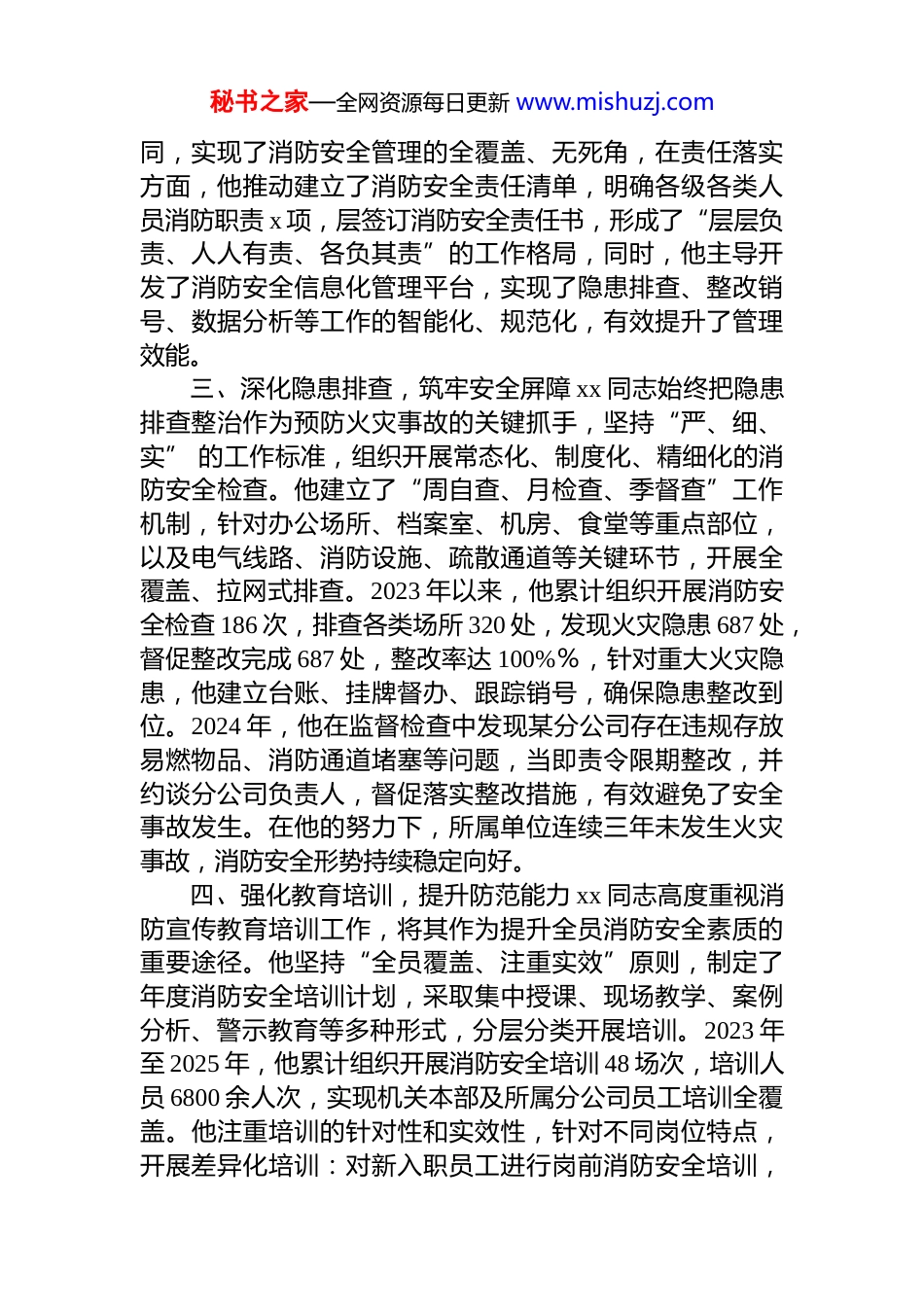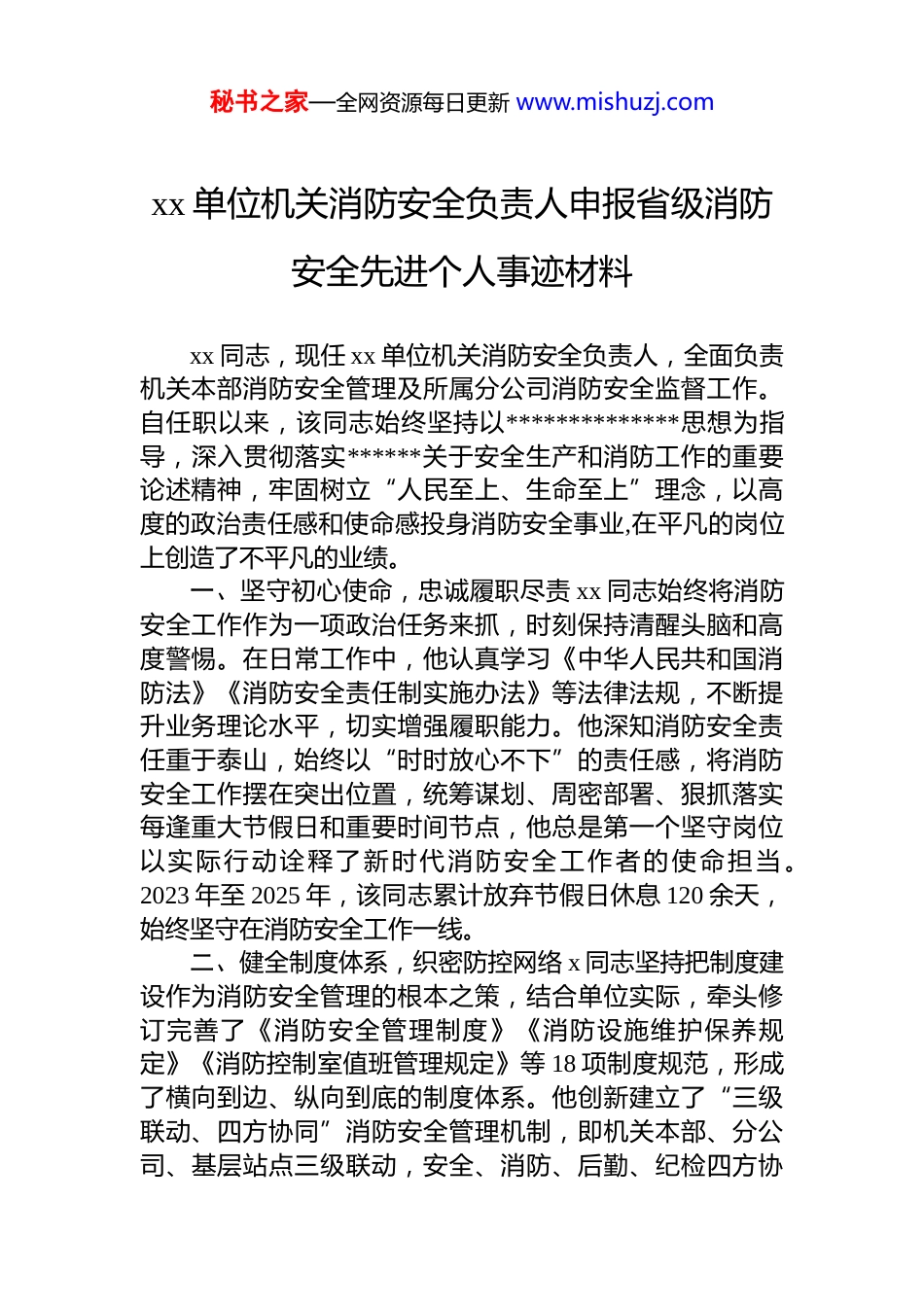 秘书之家—全网资源每日更新 www.mishuzj.comxx 单位机关消防安全负责人申报省级消防安全先进个人事迹材料xx 同志,现任 xx 单位机关消防安全负责人,全面负责机关本部消防安全管理及所属分公司消防安全监督工作。自任职以来,该同志始终坚持以**************思想为指导,深入贯彻落实******关于安全生产和消防工作的重要论述精神,牢固树立“人民至上、生命至上”理念,以高度的政治责任感和使命感投身消防安全事业,在平凡的岗位上创造了不平凡的业绩。一、坚守初心使命,忠诚履职尽责 xx 同志始终将消防安全工作作为一项政治任务来抓,时刻保持清醒头脑和高度警惕。在日常工作中,他认真学习《中华人民共和国消防法》《消防安全责任制实施办法》等法律法规,不断提升业务理论水平,切实增强履职能力。他深知消防安全责任重于泰山,始终以“时时放心不下”的责任感,将消防安全工作摆在突出位置,统筹谋划、周密部署、狠抓落实每逢重大节假日和重要时间节点,他总是第一个坚守岗位以实际行动诠释了新时代消防安全工作者的使命担当 。2023 年至 2025 年,该同志累计放弃节假日休息 120 余天,始终坚守在消防安全工作一线。二、健全制度体系,织密防控网络 x 同志坚持把制度建设作为消防安全管理的根本之策,结合单位实际,牵头修订完善了《消防安全管理制度》《消防设施维护保养规定》《消防控制室值班管理规定》等 18 项制度规范,形成了横向到边、纵向到底的制度体系。他创新建立了“三级联动、四方协同”消防安全管理机制,即机关本部、分公司、基层站点三级联动,安全、消防、后勤、纪检四方协秘书之家—全网资源每日更新 www.mishuzj.com同,实现了消防安全管理的全覆盖、无死角,在责任落实方面,他推动建立了消防安全责任清单,明确各级各类人员消防职责 x 项,层签订消防安全责任书,形成了“层层负责、人人有责、各负其责”的工作格局,同时,他主导开发了消防安全信息化管理平台,实现了隐患排查、整改销号、数据分析等工作的智能化、规范化,有效提升了管理效能。三、深化隐患排查,筑牢安全屏障 xx 同志始终把隐患排查整治作为预防火灾事故的关键抓手,坚持“严、细、实” 的工作标准,组织开展常态化、制度化、精细化的消防安全检查。他建立了“周自查、月检查、季督查”工作机制,针对办公场所、档案室、机房、食堂等重点部位,以及电气线路、消防设施、疏散通道等关键环节,开展全覆盖、拉网式排查。2023 年以来,他累计组织开展消防安全检查 186 次,排查各类场所 320 处,发现火灾隐患 687 处,督促整改完成 687 处,整改率达 100%%,针对重大火灾隐患,他建立台账、挂牌督办、跟踪销号,确保隐患整改到位。2024 年,他在监督检查中发现某分公司存在违规存放易燃物品、消防通道堵塞等问题,当即责令限期整改,并约谈分公司负责人,督促落实整改措施,有效避免了安全事故发生。在他的努力下,所属单位连续三年未发生火灾事故,消防安全形势持续稳定向好。四、强化教育培训,提升防范能力 xx 同志高度重视消防宣传教育培训工作,将其作为提升全员消防安全素质的重要途径。他坚持“全员覆盖、注重实效”原则,制定了年度消防安全培训计划,采取集中授课、现场教学、案例分析、警示教育等多种形式,分层分类开展培训。2023 年至 2025 年,他累计组织开展消防安全培训 48 场次,培训人员 6800 余人次,实现机关本部及所属分公司员工培训全覆盖。他注重培训的针对性和实效性,针对不同岗位特点,开展差异化培训:对新入职员工进行岗前消防安全培训,秘书之家—全网资源每日更新 www.mishuzj.com对消防控制室值班人员进行专业技能培训,对食堂操作人员开展燃气消防安全培训。他还创新开展“消防安全宣传月”活动,通过消防知识竞赛、应急疏散演练、消防器材实操等活动,营造了浓厚的消防安全氛围。在他的推动下,所属单位员工消防安全意识和自救互救能力显著提升。五、完善应急体系,锤炼实战本领 xx 同志坚持把应急能力建设作为消防安全工作的重要内容,不断健全完善应急预案体系,强化应急演练,提升应急处置能力。他...