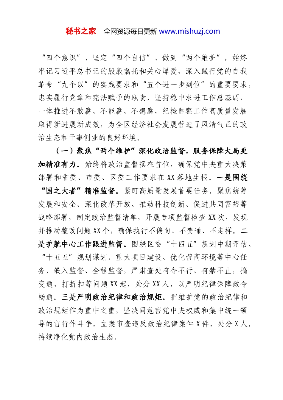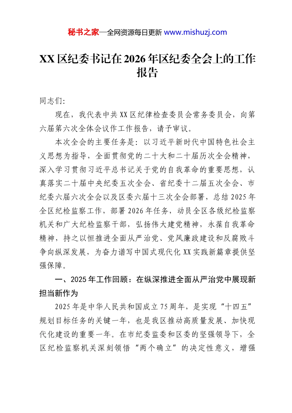 秘书之家—全网资源每日更新 www.mishuzj.comXX 区纪委书记在 2026 年区纪委全会上的工作报告同志们:现在,我代表中共 XX 区纪律检查委员会常务委员会,向第六届第六次全体会议作工作报告,请予审议。本次全会的主要任务是:以习近平新时代中国特色社会主义思想为指导,全面贯彻党的二十大和二十届历次全会精神,深入学习贯彻习近平总书记关于党的自我革命的重要思想,认真落实二十届中央纪委五次全会、省纪委十二届五次全会、市纪委六届六次全会以及区委六届十三次全会部署,总结 2025 年全区纪检监察工作,部署 2026 年任务,动员全区各级纪检监察机关和广大纪检监察干部,弘扬伟大建党精神,永葆自我革命精神,持之以恒推进全面从严治党、党风廉政建设和反腐败斗争向纵深发展,为奋力谱写中国式现代化 XX 实践新篇章提供坚强保障。一、2025 年工作回顾:在纵深推进全面从严治党中展现新担当新作为2025 年是中华人民共和国成立 75 周年,是实现“十四五”规划目标任务的关键一年,也是我区推动高质量发展、加快现代化建设的重要一年。在市纪委监委和区委的坚强领导下,全区纪检监察机关深刻领悟两个确立的决定性意义,增强“”秘书之家—全网资源每日更新 www.mishuzj.com四个意识、坚定四个自信、做到两个维护,始终“”“”“”牢记习近平总书记的殷殷嘱托和关心厚爱,深入践行党的自我革命九个以的实践要求和五个进一步到位的重要要求“”“”,忠实履行党章和宪法赋予的职责,坚持稳中求进工作总基调,一体推进不敢腐、不能腐、不想腐,纪检监察工作高质量发展取得新进展新成效,为全区经济社会发展营造了风清气正的政治生态和干事创业的良好环境。(一)聚焦两个维护深化政治监督,服务保障大局更“”加精准有力。始终将政治监督摆在首位,确保党中央重大决策部署和省委、市委、区委工作要求在 XX 落地生根。一是围绕国之大者精准监督。“”紧盯高质量发展首要任务,聚焦统筹发展和安全、深化改革开放、推动科技创新、促进共同富裕等战略部署,制定政治监督清单,开展专项监督检查 XX 次,发现并推动整改问题 XX 个,确保执行不偏向、不变通、不走样。二是护航中心工作跟进监督。围绕区委十四五规划中期评估“”、十五五规划谋划、重大项目建设、优化营商环境等中心任“”务,嵌入监督、全程监督,严肃查处有令不行、有禁不止,搞变通、打折扣等问题 XX 起,处分 XX 人,以严明纪律保障政令畅通。三是严明政治纪律和政治规矩。把维护党的政治纪律和政治规矩作为重中之重,坚决同危害党中央权威和集中统一领导的言行作斗争,立案审查违反政治纪律案件 X 件,处分 X 人,持续净化党内政治生态。秘书之家—全网资源每日更新 www.mishuzj.com(二)聚焦系统施治深化反腐败斗争,一体推进三不“腐”综合效能更加凸显。始终保持惩治腐败高压态势,坚持受贿行贿一起查,反腐败斗争压倒性胜利持续巩固发展。一是强化不敢腐的震慑。“”全年共接收信访举报 XX 件次,处置问题线索 XX 件,立案 XX 件,处分 XX 人(其中党纪处分 XX 人,政务处分 XX 人),移送司法机关 X 人。严肃查处了 XX 领域、XX 系统等一批有影响的案件,形成强大震慑。二是扎紧“不能腐”的笼子。坚持查办案件与堵塞漏洞、强化监管、促进治理相结合,针对案件暴露出的体制机制问题,发出纪检监察建议书 XX份,督促相关单位完善制度 XX 项,推动重点领域改革深化。三是增强不想腐的自觉。“”加强新时代廉洁文化建设,深入挖掘本地红色资源和优秀传统文化中的廉洁元素,打造清风“XX”廉洁文化品牌,开展警示教育 XX 场次,受教育党员干部 XX万余人次,引导党员干部筑牢拒腐防变的思想堤坝。(三)聚焦常态长效深化作风建设,新风正气更加充盈浓厚。锲而不舍落实中央八项规定及其实施细则精神,对四“风”问题露头就打、反复敲打。一是严查享乐主义、奢靡之风。紧盯违规吃喝、违规收送礼品礼金、违规发放津补贴等顽瘴痼疾,开展明察暗访 XX 轮次,查处相关问题 XX 起,处分 XX 人,通报曝光典型案例 X 起 X 人。二是力戒形式主义、官僚主义。...