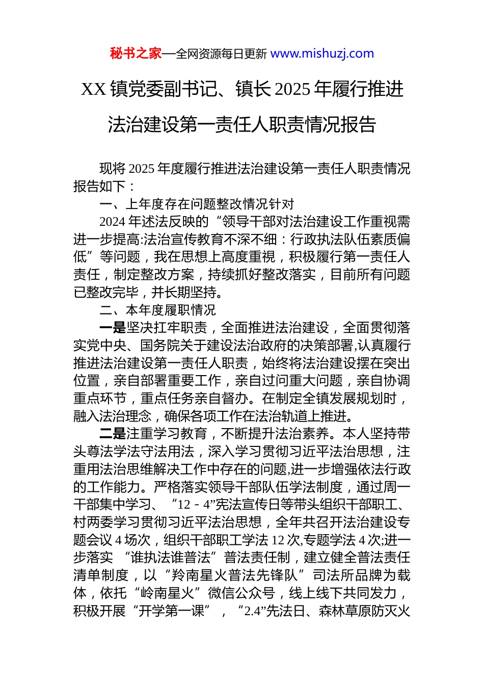 秘书之家—全网资源每日更新 www.mishuzj.comXX 镇党委副书记、镇长 2025 年履行推进法治建设第一责任人职责情况报告现将 2025 年度履行推进法治建设第一责任人职责情况报告如下:一、上年度存在问题整改情况针对2024 年述法反映的“领导干部对法治建设工作重视需进一步提高:法治宣传教育不深不细:行政执法队伍素质偏低”等问题,我在思想上高度重視,积极履行第一责任人责任,制定整改方案,持续抓好整改落实,目前所有问题已整改完毕,并长期坚持。二、本年度履职情况一是坚决扛牢职责,全面推进法治建设,全面贯彻落实党中央、国务院关于建设法治政府的决策部署,认真履行推进法治建设第一责任人职责,始终将法治建设摆在突出位置,亲自部署重要工作,亲自过问重大问题,亲自协调重点环节,重点任务亲自督办。在制定全镇发展规划时,融入法治理念,确保各项工作在法治轨道上推进。二是注重学习教育,不断提升法治素养。本人坚持带头尊法学法守法用法,深入学习贯彻习近平法治思想,注重用法治思维解决工作中存在的问题,进一步增强依法行政的工作能力。严格落实领导干部队伍学法制度,通过周一干部集中学习、“12-4”宪法宣传日等带头组织干部职工、村两委学习贯彻习近平法治思想,全年共召开法治建设专题会议 4 场次,组织干部职工学法 12 次,专题学法 4 次;进一步落实 “谁执法谁普法”普法责任制,建立健全普法责任清单制度,以“羚南星火普法先锋队”司法所品牌为载体,依托“岭南星火”微信公众号,线上线下共同发力,积极开展“开学第一课”,“2.4”先法日、森林草原防灭火秘书之家—全网资源每日更新 www.mishuzj.com等法治宣传教育,全年共组织法治宣传教育进学校、进农牧村、进机关等活动 28 次,参与干部群众 2000 余人次,发放普法宣传资料 3000 余份,发布音法短视频 8 条,阅读量3 万余次。三是坚持依法行政,着力提升依法履职效能。严格落实行政执法“三项制度”,以制度化规范化推动法治建设各项工作有序开展。结合涉企行政执法专项活动、优化法治化营商环境和“我为群众办实事”实践活动,深入开展纠正执法不公、随意执法、选择性执法等侵害群众利益问题专项整治工作,确保行政执法公开、公正、透明,全面落实行政执法人员资格管理制度,加强对执法人员的执法理论和执法业务培训,努力提高执法人员素质,目前全镇共有 6 名人员执有行政执法证。全年共开展执法检查 14 次,下发整改通知书 14 起。四是推进主动创稳、提升基层治理水平,坚持和发展新时代“枫桥经验”,聚焦邻里、家庭、债务、边界等纠纷、统筹综治中心、司法所、派出所、信访等部门协同配合,做到信息联通、矛盾联调、风险联控、命案联防;严格落实信访工作制、班子成员定期接访、变上访为下访的预防播施,明确重点信访问题领导包案、专班化解、镇村两级干部分级负责的工作责任制,进一步畅通信访渠道,规范信访程序,维护信访秩序,落实信访工作责任,健全及时就地解决群众合理诉求机制。三、存在问题一年来,我镇在法治政府建设上取得了一定的成绩,但对照法治政府建设的目标任务还存在一些问题和不足:一是开展法治宣传教育的力度还需要进一步加强,部分群众法律意识不强、法治观念淡薄,法治宣传教育在基层的渗透力不足,法治宣传在内容针对性、形式吸引力和传播覆盖面等方面存在短板;二是依法行政的能力和水平有待进一步提高,运用法治思维和法治方式处理复杂问题、化秘书之家—全网资源每日更新 www.mishuzj.com解矛盾纠纷的能力有待进一步提升,执法规范化水平与新时代法治建设要求存在一定差距;三是镇政府法治队伍建设仍然比较薄弱,虽然机构健全,但行政执法队伍中缺乏具备法律专业知识和实践经验的人才,导致执法水平参差不齐,执法证件的持有者数量有限,现只有 6 名干部持有执法证,难以满足当前行政执法工作的需要,影响了执法效率和公正性。四、下一步工作思路和主要措施一是强化精准普法,提升法治宣传渗透力。聚焦群众关心的婚姻家庭、邻里纠纷等高颊法律问题,以及青少年、老年人、社区矫正对象等不同群体开展“菜单式”普法。依托“xxx”’...