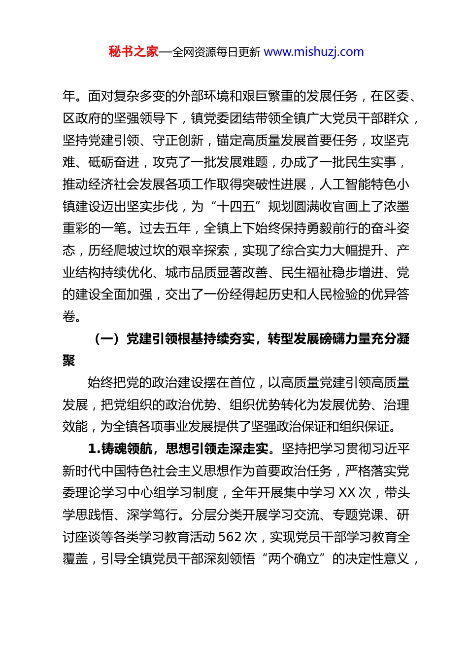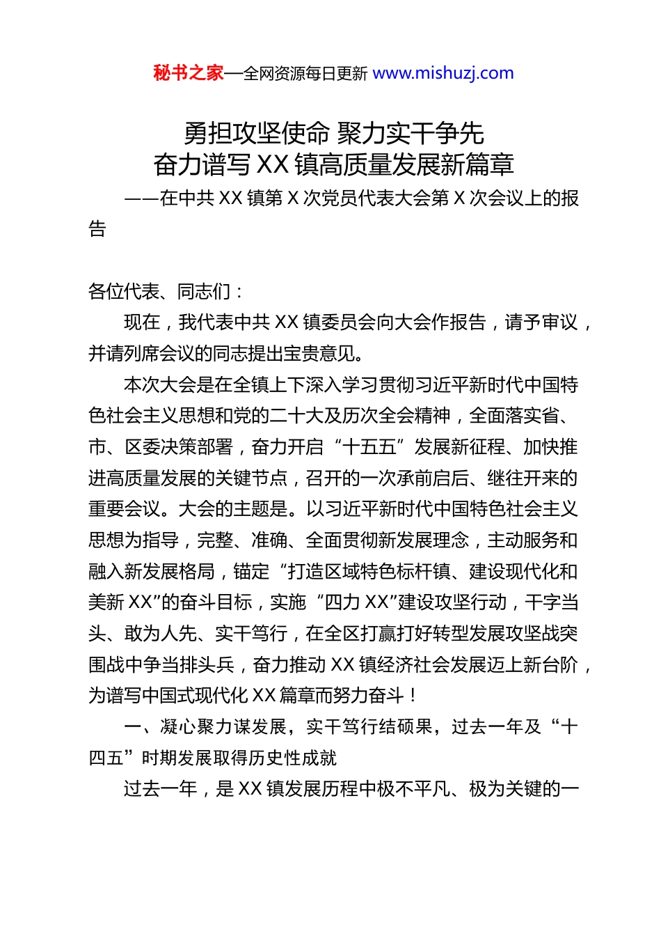 秘书之家—全网资源每日更新 www.mishuzj.com勇担攻坚使命 聚力实干争先奋力谱写 XX 镇高质量发展新篇章——在中共 XX 镇第 X 次党员代表大会第 X 次会议上的报告各位代表、同志们:现在,我代表中共 XX 镇委员会向大会作报告,请予审议,并请列席会议的同志提出宝贵意见。本次大会是在全镇上下深入学习贯彻习近平新时代中国特色社会主义思想和党的二十大及历次全会精神,全面落实省、市、区委决策部署,奋力开启“十五五”发展新征程、加快推进高质量发展的关键节点,召开的一次承前启后、继往开来的重要会议。大会的主题是。以习近平新时代中国特色社会主义思想为指导,完整、准确、全面贯彻新发展理念,主动服务和融入新发展格局,锚定“打造区域特色标杆镇、建设现代化和美新 XX”的奋斗目标,实施“四力 XX”建设攻坚行动,干字当头、敢为人先、实干笃行,在全区打赢打好转型发展攻坚战突围战中争当排头兵,奋力推动 XX 镇经济社会发展迈上新台阶,为谱写中国式现代化 XX 篇章而努力奋斗!一、凝心聚力谋发展,实干笃行结硕果,过去一年及“十四五”时期发展取得历史性成就过去一年,是 XX 镇发展历程中极不平凡、极为关键的一秘书之家—全网资源每日更新 www.mishuzj.com年。面对复杂多变的外部环境和艰巨繁重的发展任务,在区委、区政府的坚强领导下,镇党委团结带领全镇广大党员干部群众,坚持党建引领、守正创新,锚定高质量发展首要任务,攻坚克难、砥砺奋进,攻克了一批发展难题,办成了一批民生实事,推动经济社会发展各项工作取得突破性进展,人工智能特色小镇建设迈出坚实步伐,为“十四五”规划圆满收官画上了浓墨重彩的一笔。过去五年,全镇上下始终保持勇毅前行的奋斗姿态,历经爬坡过坎的艰辛探索,实现了综合实力大幅提升、产业结构持续优化、城市品质显著改善、民生福祉稳步增进、党的建设全面加强,交出了一份经得起历史和人民检验的优异答卷。(一)党建引领根基持续夯实,转型发展磅礴力量充分凝聚始终把党的政治建设摆在首位,以高质量党建引领高质量发展,把党组织的政治优势、组织优势转化为发展优势、治理效能,为全镇各项事业发展提供了坚强政治保证和组织保证。1.铸魂领航,思想引领走深走实。坚持把学习贯彻习近平新时代中国特色社会主义思想作为首要政治任务,严格落实党委理论学习中心组学习制度,全年开展集中学习 XX 次,带头学思践悟、深学笃行。分层分类开展学习交流、专题党课、研讨座谈等各类学习教育活动 562 次,实现党员干部学习教育全覆盖,引导全镇党员干部深刻领悟“两个确立”的决定性意义,秘书之家—全网资源每日更新 www.mishuzj.com增强“四个意识”、坚定“四个自信”、做到“两个维护”。坚持问题导向,深入开展调查研究,累计查摆整改各类思想认识、工作落实、作风建设等方面问题 112 个,推动学习成果转化为干事创业实际成效。立足新时代网络舆论工作要求,制定《关于加强 XX 镇网络评论工作的管理办法》,建强建优网络评论队伍,筑牢网络意识形态安全防线。2.强基固本,党建质效全面提升。深入学习贯彻上级党委重要讲话精神,举办专题培训班 1 期,实现镇、村(社区)、企业党组织负责人全覆盖培训。精心打造“XX 赋能营”党建品牌,分类开展“周末加油站”专题培训 8 次,培训党员干部300 余人次,有效提升干部队伍专业能力和履职水平。树立正确选人用人导向,坚持德才兼备、以德为先、任人唯贤,全年提任晋升科级干部 29 人,推动 16 名干部跨领域、跨层级挂职交流,优化干部队伍结构,激发干部队伍活力。扎实推进基层党组织标准化规范化建设,高质量完成 90 个基层党组织集中换届工作,选优配强党组织带头人,实现基层党组织政治功能和组织功能双提升。严格党员发展标准和程序,全年发展新党员 8 名,转正党员 17 名,不断为党组织注入新鲜血液,党员队伍整体素质持续提升。3.正风肃纪,干部作风锤炼过硬。坚决扛起全面从严治党主体责任,以永远在路上的坚韧和执着推进党风廉政建设和反腐败工作。扎实做好巡察整改“后半篇文章”,全面落实巡察秘书之家—全网资源每日更...
