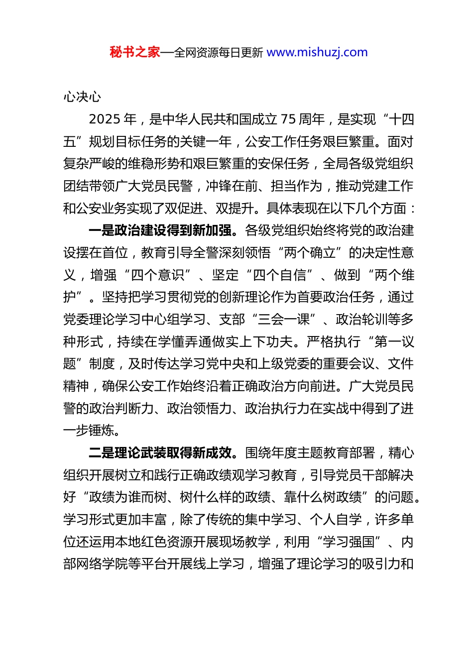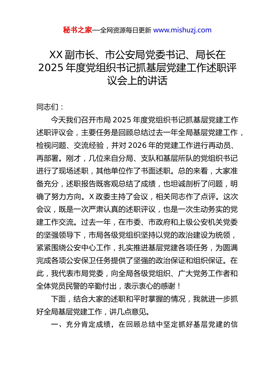 秘书之家—全网资源每日更新 www.mishuzj.comXX 副市长、市公安局党委书记、局长在2025 年度党组织书记抓基层党建工作述职评议会上的讲话同志们:今天我们召开市局 2025 年度党组织书记抓基层党建工作述职评议会,主要任务是回顾总结过去一年全局基层党建工作,检视问题、交流经验,并对 2026 年的党建工作进行再动员、再部署。刚才,几位来自分局、支队和基层所队的党组织书记进行了现场述职,其他单位作了书面述职。总的来看,大家准备充分,述职报告既客观总结了成绩,也坦诚剖析了问题,明确了努力方向。X 政委主持了会议,相关同志作了点评。这次会议,既是一次严肃认真的述职评议,也是一次生动务实的党建工作交流。过去一年,在市委、市政府和上级公安机关党委的坚强领导下,市局各级党组织坚持以党的政治建设为统领,紧紧围绕公安中心工作,扎实推进基层党建各项任务,为圆满完成各项公安保卫任务提供了坚强的政治保证和组织保证。在此,我代表市局党委,向全局各级党组织、广大党务工作者和全体党员民警的辛勤付出,表示衷心的感谢!下面,结合大家的述职和平时掌握的情况,我就进一步抓好全局基层党建工作,讲几点意见。一、充分肯定成绩,在回顾总结中坚定抓好基层党建的信秘书之家—全网资源每日更新 www.mishuzj.com心决心2025 年,是中华人民共和国成立 75 周年,是实现“十四五”规划目标任务的关键一年,公安工作任务艰巨繁重。面对复杂严峻的维稳形势和艰巨繁重的安保任务,全局各级党组织团结带领广大党员民警,冲锋在前、担当作为,推动党建工作和公安业务实现了双促进、双提升。具体表现在以下几个方面:一是政治建设得到新加强。各级党组织始终将党的政治建设摆在首位,教育引导全警深刻领悟“两个确立”的决定性意义,增强“四个意识”、坚定“四个自信”、做到“两个维护”。坚持把学习贯彻党的创新理论作为首要政治任务,通过党委理论学习中心组学习、支部“三会一课”、政治轮训等多种形式,持续在学懂弄通做实上下功夫。严格执行“第一议题”制度,及时传达学习党中央和上级党委的重要会议、文件精神,确保公安工作始终沿着正确政治方向前进。广大党员民警的政治判断力、政治领悟力、政治执行力在实战中得到了进一步锤炼。二是理论武装取得新成效。围绕年度主题教育部署,精心组织开展树立和践行正确政绩观学习教育,引导党员干部解决好“政绩为谁而树、树什么样的政绩、靠什么树政绩”的问题。学习形式更加丰富,除了传统的集中学习、个人自学,许多单位还运用本地红色资源开展现场教学,利用“学习强国”、内部网络学院等平台开展线上学习,增强了理论学习的吸引力和秘书之家—全网资源每日更新 www.mishuzj.com感染力。注重学习成果转化,努力把学习成效转化为谋划工作的思路、推动落实的举措,一些制约公安工作发展的难点问题在理论学习与调查研究的结合中找到了破解之道。三是组织基础实现新巩固。牢固树立大抓基层的鲜明导向,持续推进党支部标准化规范化建设。圆满完成了一批任期届满党组织的换届选举工作,选优配强了党组织班子特别是书记。严格落实党的组织生活制度,“三会一课”、组织生活会、民主评议党员、谈心谈话等制度得到较好落实,党内政治生活的政治性、时代性、原则性、战斗性不断增强。党员发展和教育管理工作更加规范,在重大任务、关键岗位上发展党员、考察识别党员的导向更加鲜明。今天现场述职的 XX 分局党委、XX镇分局党委,交管支队党总支,XX 公安局党支部等,在规范组织运行、建强战斗堡垒方面,都有一些值得肯定的做法。比如,有的建立了“支部月度任务清单”,有的推行了“党员积分量化管理”,有的打造了特色党建品牌,这些探索都为夯实组织基础注入了活力。四是融合发展迈出新步伐。坚持围绕中心抓党建、抓好党建促业务,积极探索党建工作与公安实战深度融合的有效路径。各级党组织在重大安保维稳、专项打击整治、疫情防控、抢险救灾等急难险重任务中,广泛设立“党员先锋岗”“党员突击队”,让党旗在斗争一线高高飘扬。许多单位将党建工作融入执法办案、窗口服务、社区警务的全过程,以党员先锋模范...
