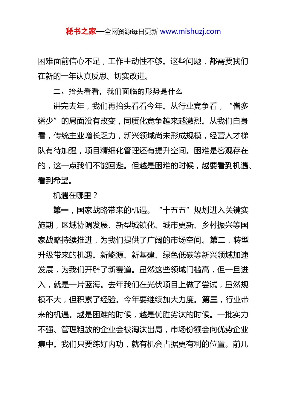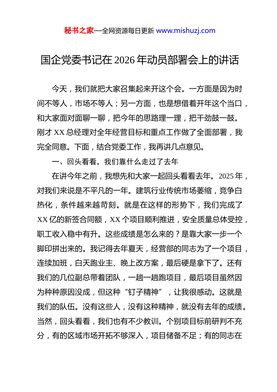 秘书之家—全网资源每日更新 www.mishuzj.com国企党委书记在 2026 年动员部署会上的讲话 今天,我们就把大家召集起来开这个会。一方面是因为时间不等人,市场不等人;另一方面,也是想借着开年这个当口,和大家面对面聊一聊,把今年的思路理一理,把干劲鼓一鼓。刚才 XX 总经理对全年经营目标和重点工作做了全面部署,我完全同意。下面,结合党委工作,我再讲几点意见。一、回头看看,我们靠什么走过了去年在讲今年之前,我想先和大家一起回头看看去年。2025 年,对我们来说是不平凡的一年。建筑行业传统市场萎缩,竞争白热化,条件越来越苛刻。就是在这样的形势下,我们完成了XX 亿的新签合同额,XX 个项目顺利推进,安全质量总体受控,职工收入稳中有升。这些成绩是怎么来的?是靠大家一步一个脚印拼出来的。我记得去年夏天,经营部的同志为了一个项目,连续加班,白天跑业主、晚上改方案,最后硬是拿下了。还有我们的几位副总带着团队,一趟一趟跑项目,最后项目虽然因为种种原因没成,但这种“钉子精神”,让我很感动。这就是我们的队伍。没有这些人,没有这种精神,就没有去年的成绩。当然,回头看看,我们也有不少教训。个别项目标前研判不充分,有的区域市场开拓不够深入,项目储备不足;有的同志在秘书之家—全网资源每日更新 www.mishuzj.com困难面前信心不足,工作主动性不够。这些问题,都需要我们在新的一年认真反思、切实改进。二、抬头看看,我们面临的形势是什么讲完去年,我们再抬头看看今年。从行业竞争看,“僧多粥少”的局面没有改变,同质化竞争越来越激烈。从我们自身看,传统主业增长乏力,新兴领域尚未形成规模,经营人才梯队有待加强,项目精细化管理还有提升空间。困难是客观存在的,这一点我们不能回避。但越是困难的时候,越要看到机遇、看到希望。机遇在哪里?第一,国家战略带来的机遇。“十五五”规划进入关键实施期,区域协调发展、新型城镇化、城市更新、乡村振兴等国家战略持续推进,为我们提供了广阔的市场空间。第二,转型升级带来的机遇。新能源、新基建、绿色低碳等新兴领域加速发展,为我们开辟了新赛道。虽然这些领域门槛高,但一旦进入,就是一片蓝海。去年我们在光伏项目上做了尝试,虽然规模不大,但积累了经验。今年要继续加大力度。第三,行业带来的机遇。越是困难的时候,越是优胜劣汰的时候。一批实力不强、管理粗放的企业会被淘汰出局,市场份额会向优势企业集中。我们只要练好内功,就有机会占据更有利的位置。前几秘书之家—全网资源每日更新 www.mishuzj.com天我看到一个材料,讲的是兄弟单位的一个项目。他们搞了“智慧工地”建设,通过数字化手段提升管理效率。结果业主非常满意,后续项目优先考虑他们。这说明什么?说明市场永远需要优质供给,永远奖励那些把活干得好、把管理做得精的企业。所以我的结论是:形势严峻,但机遇犹存;竞争激烈,但空间仍在。关键看我们怎么干。三、今年怎么干?刚才 XX 总经理已经把任务目标讲得很清楚了。我再从党委的角度,和大家交流几点想法。第一,要坚定信心,保持定力。信心比黄金更重要。越是困难的时候,越要有信心。我们的信心来自哪里?来自集团公司的坚强领导,来自我们这几年积累的基础,更来自在座每一位同志的拼搏精神。前几天我和经营部的一个老同志聊天。他在行业干了三十多年,经历过好几个周期。他说,行业就是这样,有高潮有低谷,但不管什么时候,总有人在干活。关键是你是不是那个坚持下来的人。这话让我很受触动。坚持下来的人,就是最后能分到蛋糕的人。所以今年,我希望大家无论遇到什么困难,都要坚定信心。项目难拿,就多跑几趟;客户难谈,就多想点办法;对手太强,就找找自己的优势。只要不放弃,总有办法。秘书之家—全网资源每日更新 www.mishuzj.com第二,要深耕区域,做实经营。经营是我们的命根子。没有项目,一切都是零。深耕区域,首先要做熟做透。我们在全国布局多年,有一定的市场基础。但基础不等于优势。你对当地的规划了解多少?对主要客户熟悉多少?对竞争对手掌握多少?这些才是决定你能不能拿到项目的关键。深耕区域,还要舍得投入...