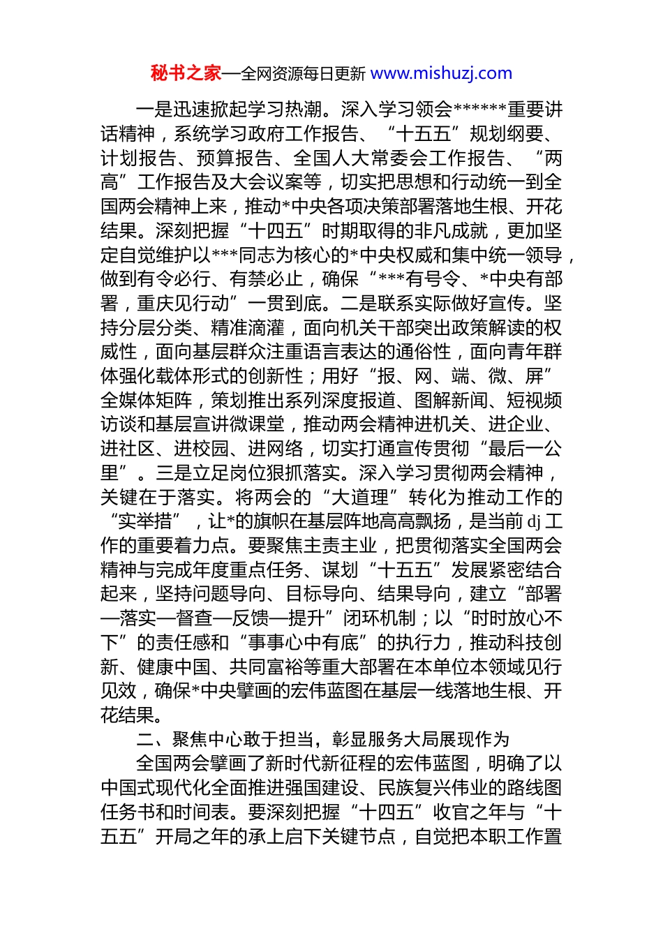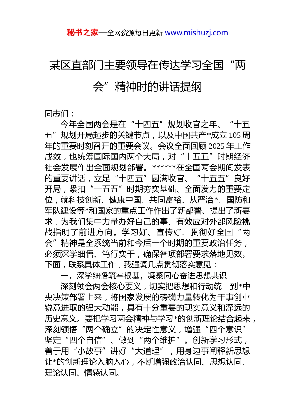 秘书之家—全网资源每日更新 www.mishuzj.com某区直部门主要领导在传达学习全国“两会”精神时的讲话提纲同志们:今年全国两会是在“十四五”规划收官之年、“十五五”规划开局起步的关键节点,以及中国共产*成立 105 周年的重要时刻召开的重要会议。会议全面回顾 2025 年工作成效,也统筹国际国内两个大局,对“十五五”时期经济社会发展作出全面规划部署。******在全国两会期间发表的重要讲话,立足“十四五”圆满收官、“十五五”良好开局,紧扣“十五五”时期夯实基础、全面发力的重要定位,就科技创新、健康中国、共同富裕、从严治*、国防和军队建设等*和国家的重点工作作出了新部署、提出了新要求,为我们集中力量办好自己的事、有效应对外部风险挑战指明了前进方向。学习好、宣传好、贯彻好全国“两会”精神是全系统当前和今后一个时期的重要政治任务,必须深学细悟、笃行实干,确保各项部署要求落地见效。下面,联系具体工作,我强调几点贯彻落实意见:一、深学细悟筑牢根基,凝聚同心奋进思想共识深刻领会两会核心要义,切实把思想和行动统一到*中央决策部署上来,将国家发展的磅礴力量转化为干事创业锐意进取的强大动能,具有十分重要的现实意义和深远的历史意义。要把学习两会精神与学习*的创新理论结合起来,深刻领悟“两个确立”的决定性意义,增强“四个意识”坚定“四个自信”、做到“两个维护”。创新学习形式,善于用“小故事”讲好“大道理”,用身边事阐释新思想让*的创新理论入脑入心,不断增强政治认同、思想认同、理论认同、情感认同。秘书之家—全网资源每日更新 www.mishuzj.com一是迅速掀起学习热潮。深入学习领会******重要讲话精神,系统学习政府工作报告、“十五五”规划纲要、计划报告、预算报告、全国人大常委会工作报告、“两高”工作报告及大会议案等,切实把思想和行动统一到全国两会精神上来,推动*中央各项决策部署落地生根、开花结果。深刻把握“十四五”时期取得的非凡成就,更加坚定自觉维护以***同志为核心的*中央权威和集中统一领导,做到有令必行、有禁必止,确保“***有号令、*中央有部署,重庆见行动”一贯到底。二是联系实际做好宣传。坚持分层分类、精准滴灌,面向机关干部突出政策解读的权威性,面向基层群众注重语言表达的通俗性,面向青年群体强化载体形式的创新性;用好“报、网、端、微、屏”全媒体矩阵,策划推出系列深度报道、图解新闻、短视频访谈和基层宣讲微课堂,推动两会精神进机关、进企业、进社区、进校园、进网络,切实打通宣传贯彻“最后一公里”。三是立足岗位狠抓落实。深入学习贯彻两会精神,关键在于落实。将两会的“大道理”转化为推动工作的“实举措”,让*的旗帜在基层阵地高高飘扬,是当前 dj 工作的重要着力点。要聚焦主责主业,把贯彻落实全国两会精神与完成年度重点任务、谋划“十五五”发展紧密结合起来,坚持问题导向、目标导向、结果导向,建立“部署—落实—督查—反馈—提升”闭环机制;以“时时放心不下”的责任感和“事事心中有底”的执行力,推动科技创新、健康中国、共同富裕等重大部署在本单位本领域见行见效,确保*中央擘画的宏伟蓝图在基层一线落地生根、开花结果。二、聚焦中心敢于担当,彰显服务大局展现作为全国两会擘画了新时代新征程的宏伟蓝图,明确了以中国式现代化全面推进强国建设、民族复兴伟业的路线图任务书和时间表。要深刻把握“十四五”收官之年与“十五五”开局之年的承上启下关键节点,自觉把本职工作置秘书之家—全网资源每日更新 www.mishuzj.com于*和国家事业发展全局中谋划推进,切实将两会部署的战略任务、政策取向、改革举措转化为可操作、可量化、可考核的具体行动,在服务国家重大战略、支撑区域高质量发展中勇挑重担、争当先锋。一要深刻把握因地制宜发展新质生产力的新指示新要求。坚持从区域资源禀赋、产业基础和发展阶段出发,找准科技创新与产业升级的结合点,加快构建以实体经济为支撑的现代化产业体系;聚焦人工智能、生物医药、绿色低碳等重点领域,强化企业创新主体地位,推动创新链、产业链、资金链、人才链深度融合,切实把发展新质生产力的战...