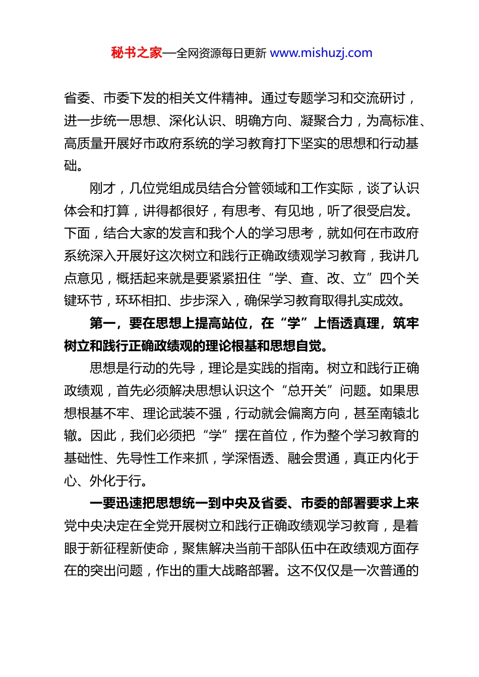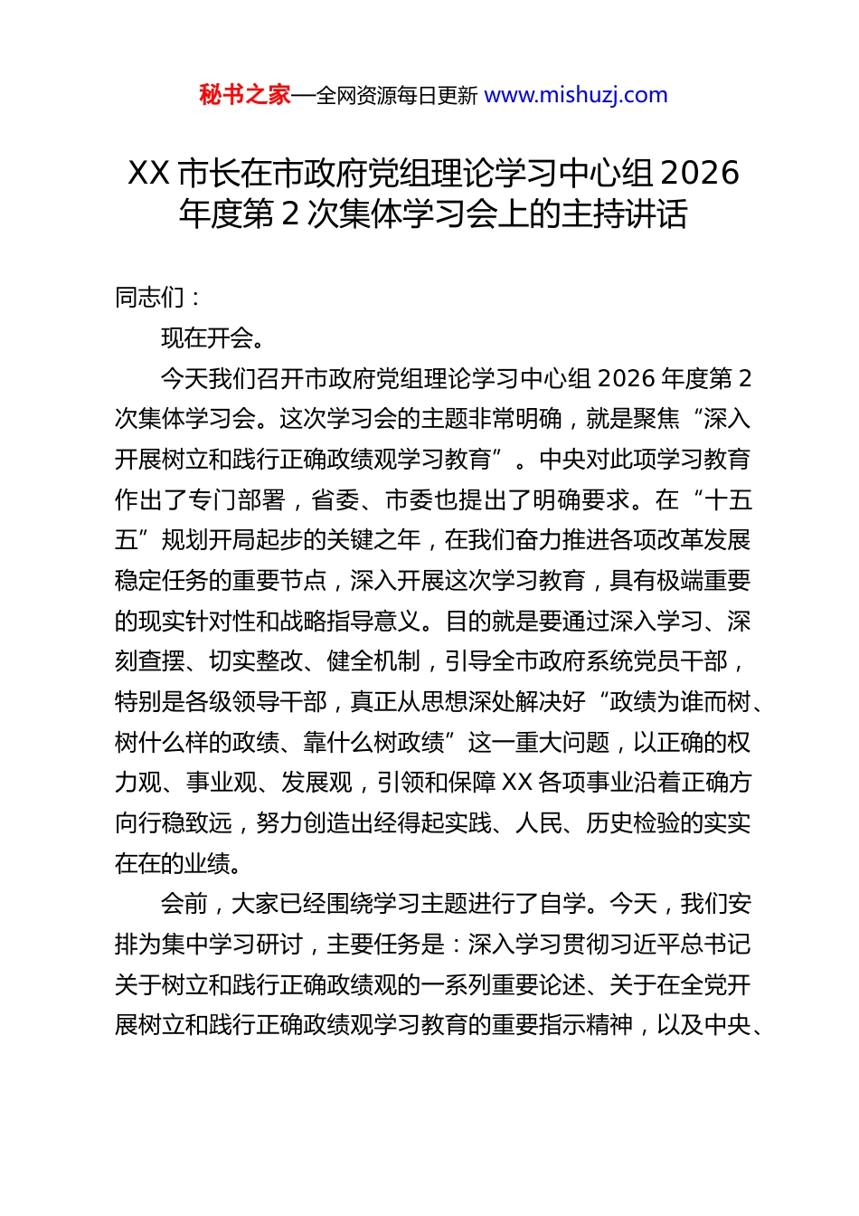 秘书之家—全网资源每日更新 www.mishuzj.comXX 市长在市政府党组理论学习中心组 2026年度第 2 次集体学习会上的主持讲话同志们:现在开会。今天我们召开市政府党组理论学习中心组 2026 年度第 2次集体学习会。这次学习会的主题非常明确,就是聚焦“深入开展树立和践行正确政绩观学习教育”。中央对此项学习教育作出了专门部署,省委、市委也提出了明确要求。在“十五五”规划开局起步的关键之年,在我们奋力推进各项改革发展稳定任务的重要节点,深入开展这次学习教育,具有极端重要的现实针对性和战略指导意义。目的就是要通过深入学习、深刻查摆、切实整改、健全机制,引导全市政府系统党员干部,特别是各级领导干部,真正从思想深处解决好“政绩为谁而树、树什么样的政绩、靠什么树政绩”这一重大问题,以正确的权力观、事业观、发展观,引领和保障 XX 各项事业沿着正确方向行稳致远,努力创造出经得起实践、人民、历史检验的实实在在的业绩。会前,大家已经围绕学习主题进行了自学。今天,我们安排为集中学习研讨,主要任务是:深入学习贯彻习近平总书记关于树立和践行正确政绩观的一系列重要论述、关于在全党开展树立和践行正确政绩观学习教育的重要指示精神,以及中央、秘书之家—全网资源每日更新 www.mishuzj.com省委、市委下发的相关文件精神。通过专题学习和交流研讨,进一步统一思想、深化认识、明确方向、凝聚合力,为高标准、高质量开展好市政府系统的学习教育打下坚实的思想和行动基础。刚才,几位党组成员结合分管领域和工作实际,谈了认识体会和打算,讲得都很好,有思考、有见地,听了很受启发。下面,结合大家的发言和我个人的学习思考,就如何在市政府系统深入开展好这次树立和践行正确政绩观学习教育,我讲几点意见,概括起来就是要紧紧扭住“学、查、改、立”四个关键环节,环环相扣、步步深入,确保学习教育取得扎实成效。第一,要在思想上提高站位,在“学”上悟透真理,筑牢树立和践行正确政绩观的理论根基和思想自觉。思想是行动的先导,理论是实践的指南。树立和践行正确政绩观,首先必须解决思想认识这个“总开关”问题。如果思想根基不牢、理论武装不强,行动就会偏离方向,甚至南辕北辙。因此,我们必须把“学”摆在首位,作为整个学习教育的基础性、先导性工作来抓,学深悟透、融会贯通,真正内化于心、外化于行。一要迅速把思想统一到中央及省委、市委的部署要求上来党中央决定在全党开展树立和践行正确政绩观学习教育,是着眼于新征程新使命,聚焦解决当前干部队伍中在政绩观方面存在的突出问题,作出的重大战略部署。这不仅仅是一次普通的秘书之家—全网资源每日更新 www.mishuzj.com理论学习,更是一次深刻的思想洗礼、严肃的党性锤炼、系统的作风整训。省委、市委结合地方实际,制定了具体的实施方案,提出了明确要求。市政府党组及各组成部门、各级领导干部,必须站在坚定拥护“两个确立”、坚决做到“两个维护”的政治高度,深刻认识开展这次学习教育的极端重要性和现实紧迫性。要以求真务实、不折不扣的态度,第一时间把思想和行动统一到党中央的决策部署上来,统一到省委、省政府和市委的工作要求上来,切实增强抓好学习教育的政治自觉、思想自觉和行动自觉。绝不能有任何观望等待、敷衍应付的想法,绝不能把学习教育看成是“软任务”,必须作为一项严肃重大的政治任务,高标准、高质量地组织好、落实好,确保不偏向、不走样、见实效。二要全面系统、深入持久地学习习近平总书记关于树立和践行正确政绩观的重要论述。党的十八大以来,习近平总书记围绕“政绩为谁而树、树什么样的政绩、靠什么树政绩”等重大问题,发表了一系列重要论述,深刻阐明了正确政绩观的丰富内涵、核心要义和实践要求。这些重要论述,是习近平新时代中国特色社会主义思想的重要组成部分,是我们认识、分析和解决政绩观问题的“金钥匙”。我们必须原原本本学、逐字逐句学、联系实际学。要重点学习总书记关于“人民对美好生活的向往就是我们的奋斗目标”、“江山就是人民,人民就是江山”的重要理念,深刻领悟“为谁创造业绩”的核心立场。秘书之家—全...