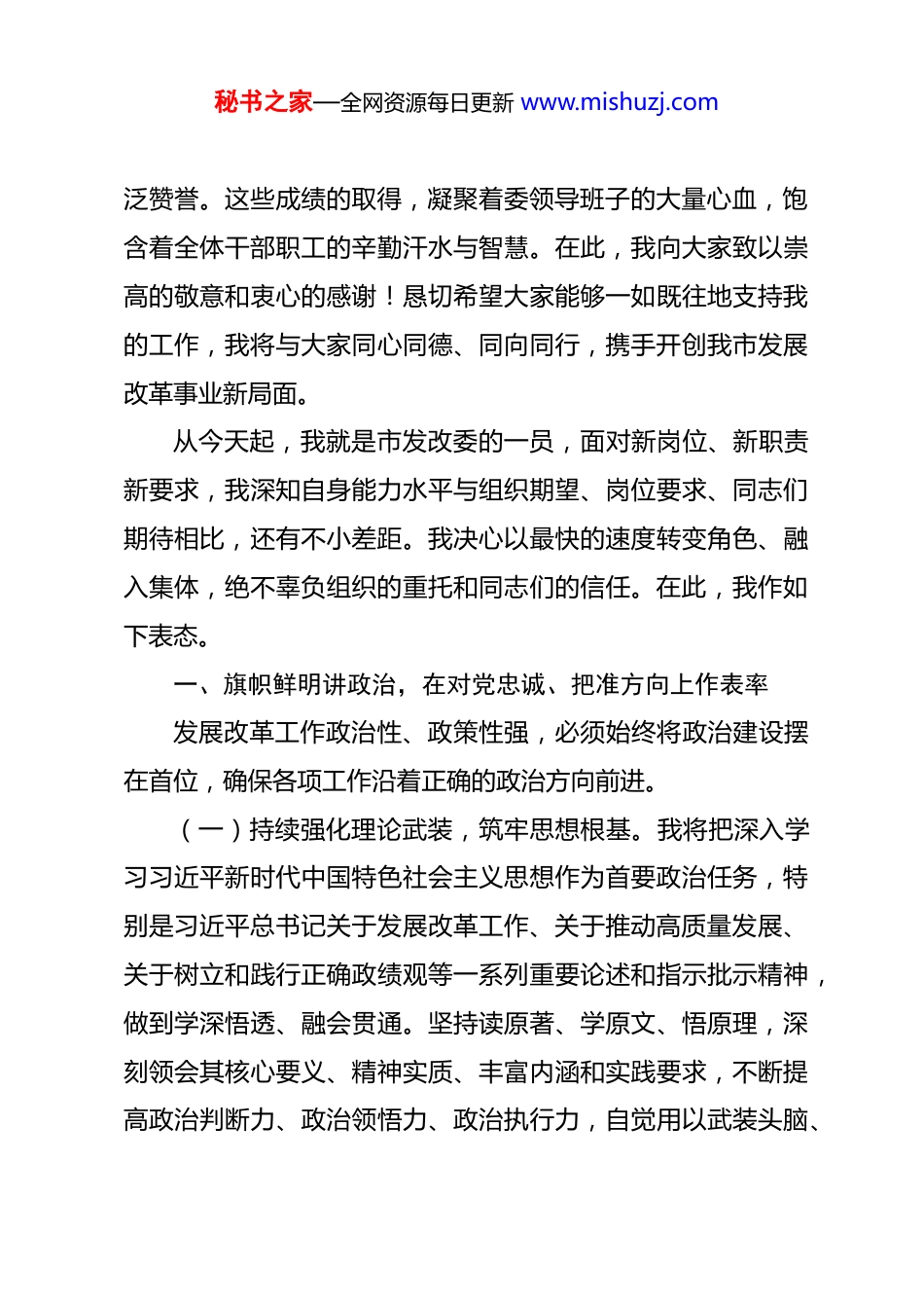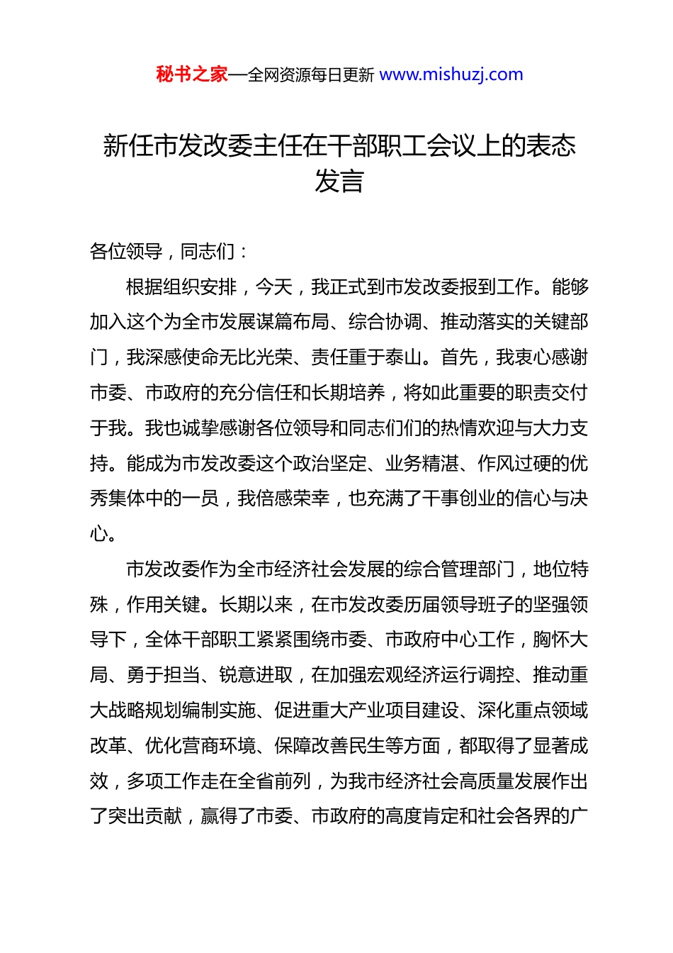 秘书之家—全网资源每日更新 www.mishuzj.com新任市发改委主任在干部职工会议上的表态发言 各位领导,同志们:根据组织安排,今天,我正式到市发改委报到工作。能够加入这个为全市发展谋篇布局、综合协调、推动落实的关键部门,我深感使命无比光荣、责任重于泰山。首先,我衷心感谢市委、市政府的充分信任和长期培养,将如此重要的职责交付于我。我也诚挚感谢各位领导和同志们们的热情欢迎与大力支持。能成为市发改委这个政治坚定、业务精湛、作风过硬的优秀集体中的一员,我倍感荣幸,也充满了干事创业的信心与决心。市发改委作为全市经济社会发展的综合管理部门,地位特殊,作用关键。长期以来,在市发改委历届领导班子的坚强领导下,全体干部职工紧紧围绕市委、市政府中心工作,胸怀大局、勇于担当、锐意进取,在加强宏观经济运行调控、推动重大战略规划编制实施、促进重大产业项目建设、深化重点领域改革、优化营商环境、保障改善民生等方面,都取得了显著成效,多项工作走在全省前列,为我市经济社会高质量发展作出了突出贡献,赢得了市委、市政府的高度肯定和社会各界的广秘书之家—全网资源每日更新 www.mishuzj.com泛赞誉。这些成绩的取得,凝聚着委领导班子的大量心血,饱含着全体干部职工的辛勤汗水与智慧。在此,我向大家致以崇高的敬意和衷心的感谢!恳切希望大家能够一如既往地支持我的工作,我将与大家同心同德、同向同行,携手开创我市发展改革事业新局面。从今天起,我就是市发改委的一员,面对新岗位、新职责新要求,我深知自身能力水平与组织期望、岗位要求、同志们期待相比,还有不小差距。我决心以最快的速度转变角色、融入集体,绝不辜负组织的重托和同志们的信任。在此,我作如下表态。一、旗帜鲜明讲政治,在对党忠诚、把准方向上作表率发展改革工作政治性、政策性强,必须始终将政治建设摆在首位,确保各项工作沿着正确的政治方向前进。(一)持续强化理论武装,筑牢思想根基。我将把深入学习习近平新时代中国特色社会主义思想作为首要政治任务,特别是习近平总书记关于发展改革工作、关于推动高质量发展、关于树立和践行正确政绩观等一系列重要论述和指示批示精神,做到学深悟透、融会贯通。坚持读原著、学原文、悟原理,深刻领会其核心要义、精神实质、丰富内涵和实践要求,不断提高政治判断力、政治领悟力、政治执行力,自觉用以武装头脑、秘书之家—全网资源每日更新 www.mishuzj.com指导实践、推动工作。(二)始终胸怀“国之大者”,站稳政治立场。坚定拥护“两个确立”,坚决做到“两个维护”,始终在思想上政治上行动上同以习近平同志为核心的党中央保持高度一致。不折不扣贯彻落实党中央、国务院,省委、省政府以及市委、市政府的各项决策部署,确保政令畅通、令行禁止。想问题、作决策、办事情,都自觉同党的基本理论、基本路线、基本方略对标对表,同党中央决策部署和省委、市委工作要求对标对表,确保发展改革工作始终服务大局、服从全局。(三)树立和践行正确政绩观,端正发展导向。深入开展树立和践行正确政绩观学习教育,引导全委干部深刻理解“政绩为谁而树、树什么样的政绩、靠什么树政绩”等重大问题,坚决反对形式主义、官僚主义,力戒急功近利、好大喜功,坚决防止搞“形象工程”、“政绩工程”。坚持把为民造福作为最大政绩,把打基础、利长远、惠民生的工作做实做细,努力创造经得起实践、人民、历史检验的业绩。把学习教育成果转化为谋划发展的正确思路、促进发展的政策举措、领导发展的实际能力。二、全力以赴谋发展,在履职尽责、担当作为上求实效发改委是全市发展的“参谋部”、“项目部”和“协调秘书之家—全网资源每日更新 www.mishuzj.com部”,我将尽快熟悉情况、进入角色,聚焦主责主业,全力推动各项工作提质增效。(一)坚持稳中求进,确保工作平稳过渡衔接。当前,保持工作的连续性、稳定性至关重要。我将坚持“三个不变”:干部队伍总体稳定不变,严格遵守干部人事纪律,关心关爱干部,激发全委干部职工干事创业的活力和潜能;现有职责分工基本不变,确保各项工作无缝衔接、有序运转,杜绝断档缺位;既定发展规...