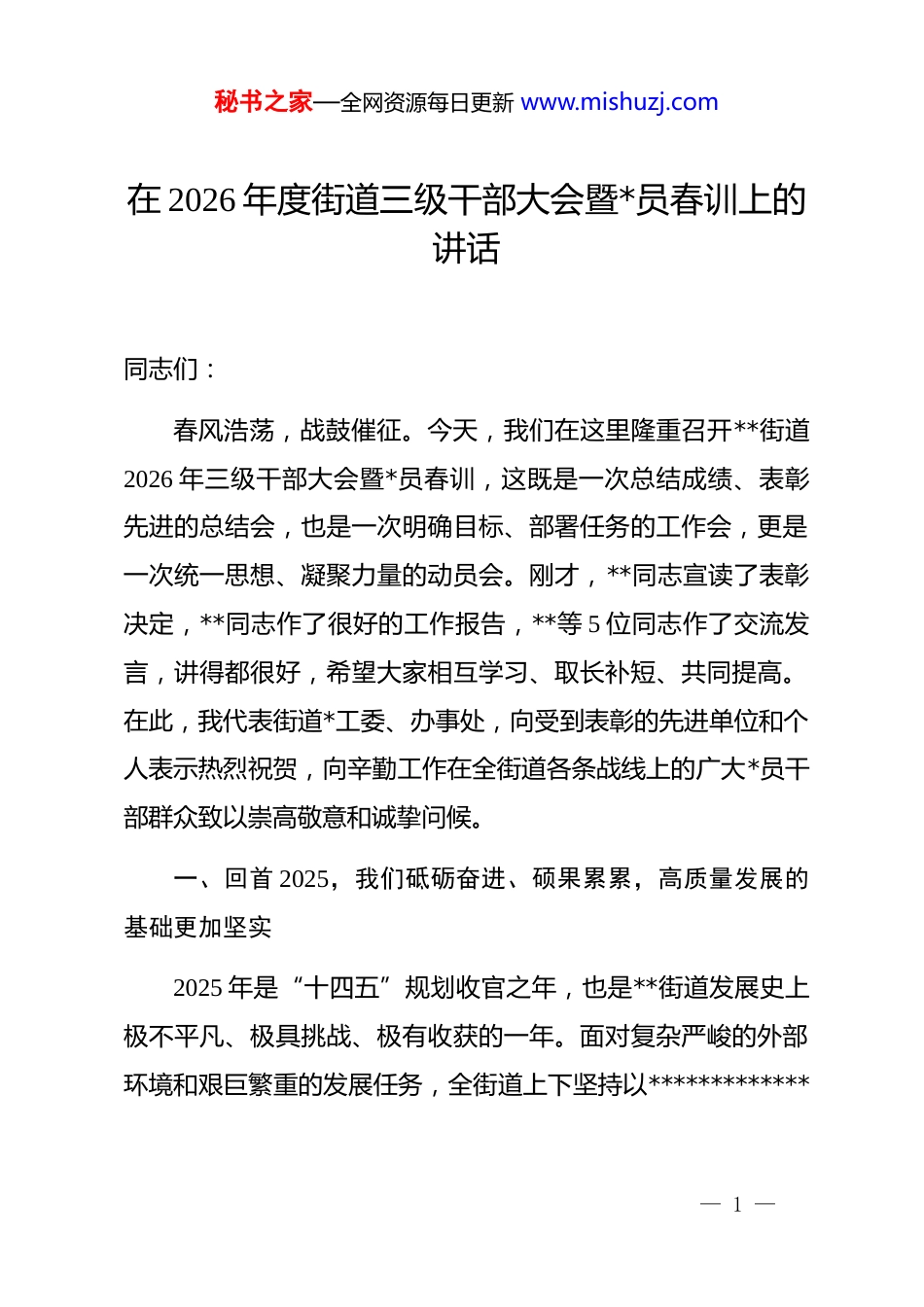 秘书之家—全网资源每日更新 www.mishuzj.com在 2026 年度街道三级干部大会暨*员春训上的讲话同志们:春风浩荡,战鼓催征。今天,我们在这里隆重召开**街道2026 年三级干部大会暨*员春训,这既是一次总结成绩、表彰先进的总结会,也是一次明确目标、部署任务的工作会,更是一次统一思想、凝聚力量的动员会。刚才,**同志宣读了表彰决定,**同志作了很好的工作报告,**等 5 位同志作了交流发言,讲得都很好,希望大家相互学习、取长补短、共同提高。在此,我代表街道*工委、办事处,向受到表彰的先进单位和个人表示热烈祝贺,向辛勤工作在全街道各条战线上的广大*员干部群众致以崇高敬意和诚挚问候。一、回首 2025,我们砥砺奋进、硕果累累,高质量发展的基础更加坚实2025 年是“十四五”规划收官之年,也是**街道发展史上极不平凡、极具挑战、极有收获的一年。面对复杂严峻的外部环境和艰巨繁重的发展任务,全街道上下坚持以*************— 1 —秘书之家—全网资源每日更新 www.mishuzj.com*思想为指导,在市委、市政府的坚强领导下,同心同德、攻坚克难,推动经济社会高质量发展迈出了坚实步伐。综合实力迈上新台阶。我们始终把稳增长作为首要任务,全力推动经济平稳健康发展。2025 年,全街道完成规模以上工业总产值 200 余亿元,完成固定资产投资近百亿元,主要经济指标稳中有进、进中向好,综合实力在全市排名前列。这些成绩的取得,凝聚着全街道广大*员干部的智慧和汗水,充分证明了我们的干部队伍是一支能打硬仗、善打胜仗的队伍。产业支撑实现新跃升。我们坚持把产业发展作为强街之本全力推动产业转型升级。医药化工、新型建材、港口物流三大主导产业持续壮大,产业链条不断延伸,产业集群效应日益凸显。规上企业数量稳步增加,企业质量明显提升,工业脊梁越挺越直,产业筋骨越练越强。一批重大产业项目加快建设,新祥云一期等重点项目顺利投产达效,发展后劲越来越足。园区能级实现新突破。我们持续推进园区基础设施建设和配套完善,园区承载能力和服务能力显著提升。“12 路 5 桥”工程稳步推进,园区路网更加完善。污水处理、公共管廊等配套设施加快建设,园区功能更加完备。土地集约利用水平不断提高,企业生产经营成本持续下降,营商环境持续优化,园区— 2 —秘书之家—全网资源每日更新 www.mishuzj.com吸引力、竞争力显著增强。民生福祉得到新改善。我们始终把人民群众的利益放在首位,用心用情办好民生实事。乡村振兴扎实推进,村集体经济稳步增长。社会保障体系更加完善,教育、医疗、文化等公共服务水平持续提升。安全生产形势总体稳定,生态环境质量持续改善,社会大局和谐稳定,人民群众获得感、幸福感、安全感不断增强。队伍面貌展现新气象。我们坚持全面从严治*,持续加强干部队伍建设。扎实开展 dj 学习教育,*员干部纪律规矩意识明显增强。“头雁领航”“青雁培优”工程深入实施,干部能力素质持续提升。作风建设成效显著,干事创业氛围更加浓厚。成绩来之不易,经验弥足珍贵。这些成绩的取得,根本在于**************思想的科学指引,关键在于市委、市政府的坚强领导,基础在于全街道广大*员干部群众的团结奋斗。在此,我代表街道*工委、办事处,向所有为**街道发展作出贡献的同志们、朋友们表示衷心感谢。二、展望 2026,我们重任在肩、使命光荣,冲刺千亿园区的号角已经吹响— 3 —秘书之家—全网资源每日更新 www.mishuzj.com2026 年是“十五五”规划开局之年,更是**街道冲刺循环经济千亿园区的攻坚之年。站在新的历史起点上,我们既要看到成绩、坚定信心,更要认清形势、把握机遇,以更加昂扬的斗志、更加务实的作风,奋力谱写高质量发展新篇章。当前,我们面临着难得的发展机遇。从宏观形势看,国家持续扩大内需、促进消费,稳增长政策效应持续释放,为经济发展提供了有力支撑。省市高度重视县域经济发展,出台了一系列支持政策,为我们争取项目、资金创造了有利条件。从自身条件看,经过多年积累,我们的产业基础更加扎实,园区配套更加完善,干部队伍更加成熟,完全有条件、有能力实现更大发展。同时,我们也要清醒...